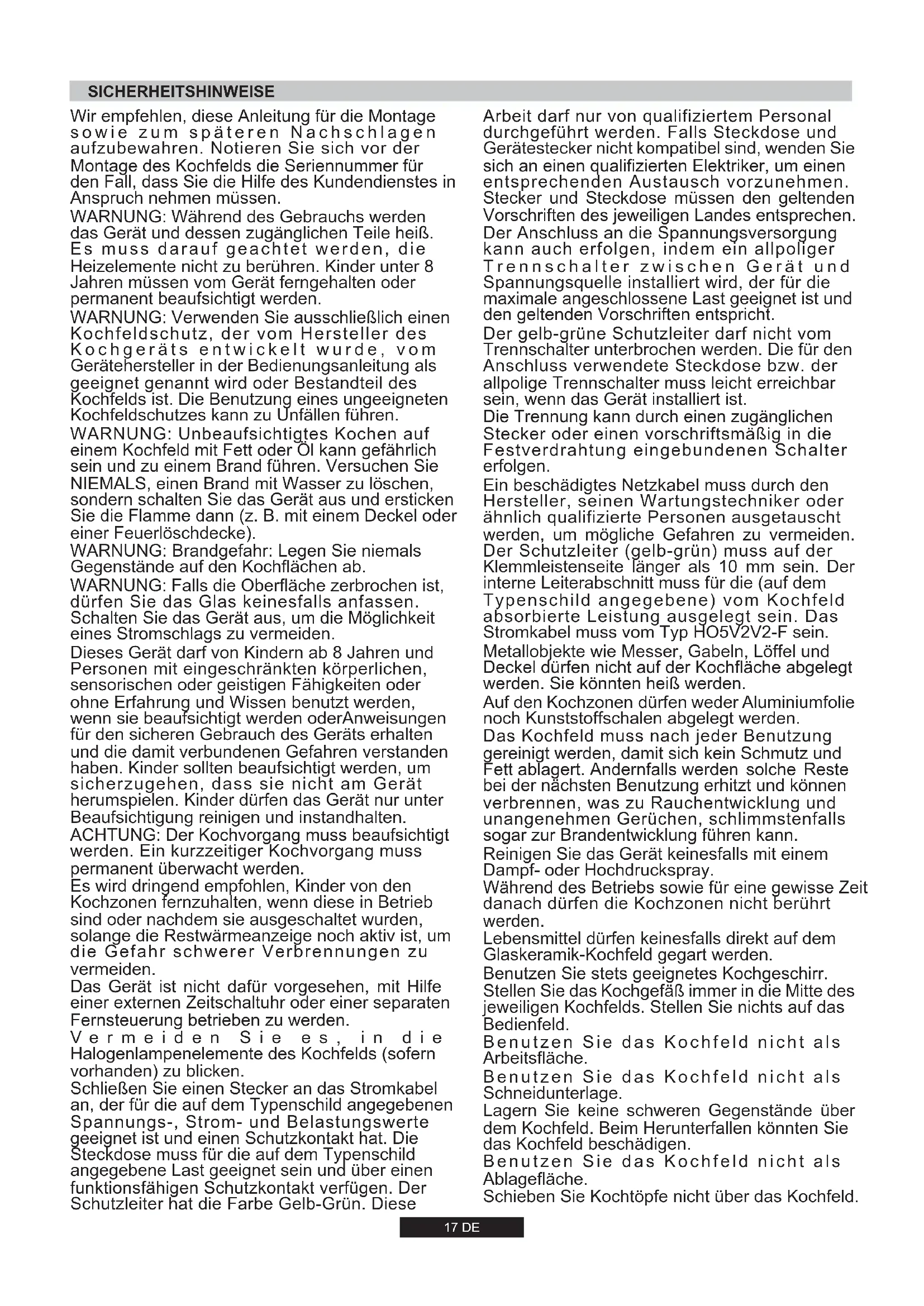 Die Installation eines Haushaltsgeräts kann unter Umständen eine komplexe Arbeit sein; wenn diese nicht korrekt ausgeführt wird, könnte es zu schweren Beeinträchtigungen der Sicherheit des Benutzers kommen. Das ist der Grund, warum sie von einem qualifizierten Fachmann unter Einhaltung der geltenden technischen Regeln durchgeführt werden soll. Falls diese Empfehlung nicht beachtet und die Installation des Gerätes durch eine nicht qualifizierte Person durchgeführt werden sollte, lehnt der Hersteller jede Verantwortung für eventuelle technische Fehler des Produktes ab, gleichviel, ob es zu Schäden an Personen oder Sachen führt. 2.1. ELEKTRISCHER ANSCHLUSS Überprüfen Sie die auf dem Matrikelschild angegebenen Daten. Das Matrikelschild befindet sich auf der unteren Seite des Gerätegehäuses. Notieren Sie alle Daten wie Matrikel- und Seriennummer am besten direkt auf dem Deckblatt der Bedienungsanleitung, da diese Angaben in einem eventuellen Servicefall vom Kundendienst benötigt werden. Überprüfen Sie, dass die Netzspannung und die Leistung für den Betrieb des Gerätes geeignet sind. Vor dem elektrischen Anschluss ist die einwandfreie Erdung der elektrischen Hausinstallation zu prüfen. Die Erdung des Gerätes ist gesetzlich vorgeschrieben. Der Hersteller weist jede Verantwortung für Sach- oder Personenschäden zurück, die auf fehlende bzw. mangelhafte Erdung zurückzuführen sind. Bei den Modellen, die ohne Stecker geliefert werden, ist ein genormter Stecker an das Kabel zu montieren, welcher für die auf das Matrikelschild angegebene Belastung geeignet ist. Der Erdleiter ist durch das gelb-grüne Kabel gekennzeichnet. Der Stecker muss in jedem Fall zugänglich sein. Soll das Gerät an einer festen Anschlussdose angeschlossen werden, ist zwischen dem Gerät und dem Versorgungsnetz eine der Last entsprechende, genormteAbschaltvorrichtung einzubauen. Sollte das Netzkabel beschädigt sein, muss dieser durch einen qualifizierten Fachmann ausgewechselt werden. Der gelb-grüne Erdleiter muss mindestens 10 mm länger sein als die Phasenleiter. Der Querschnitt der Kabel muss der Leistung der Kochmulde entsprechen (s. Matrikelschild). Benutzen Sie ausschließlich ein Netzkabel des Typs 3x0.75 mm² H05V2V2-F. PHASE ERDE NULL