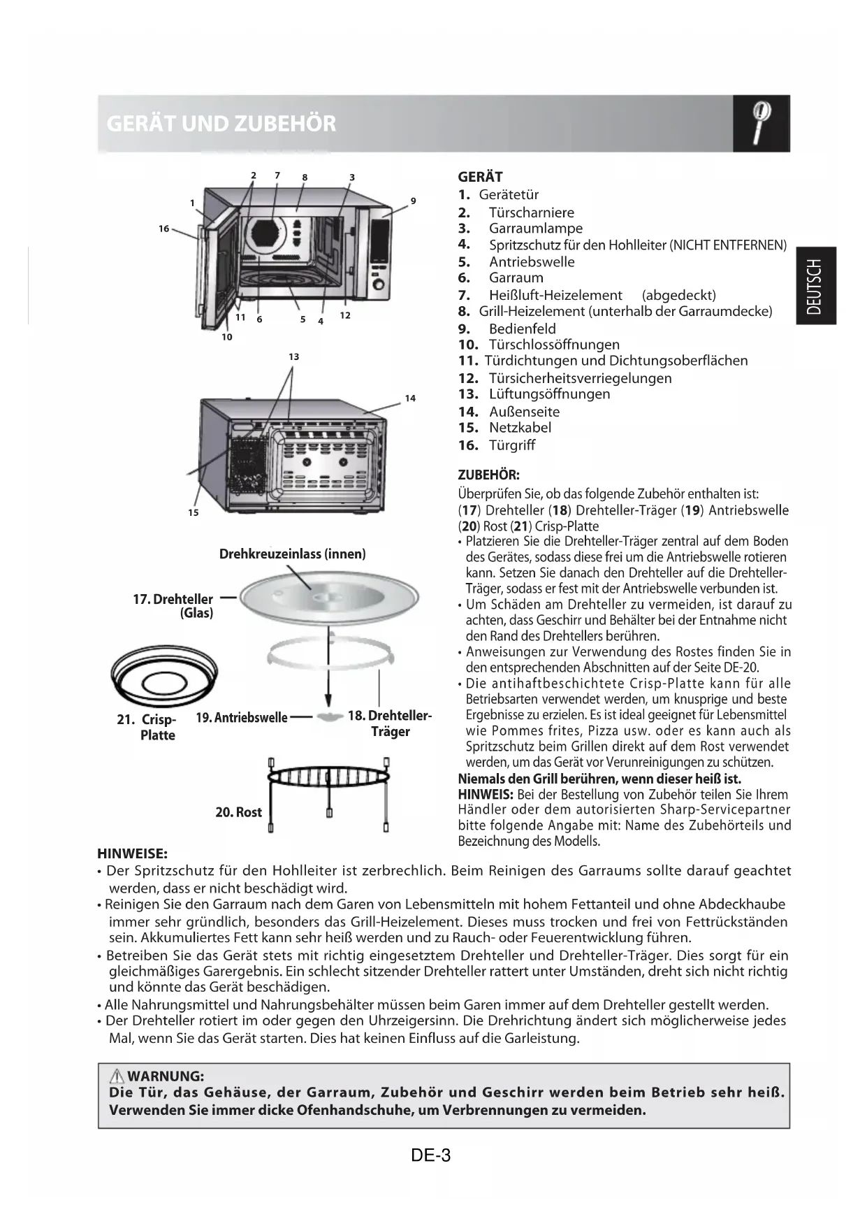 ZUBEHÖR: Überprüfen Sie, ob das folgende Zubehör enthalten ist: (17) Drehteller (18) Drehteller-Träger (19) Antriebswelle (20) Rost (21) Crisp-Platte