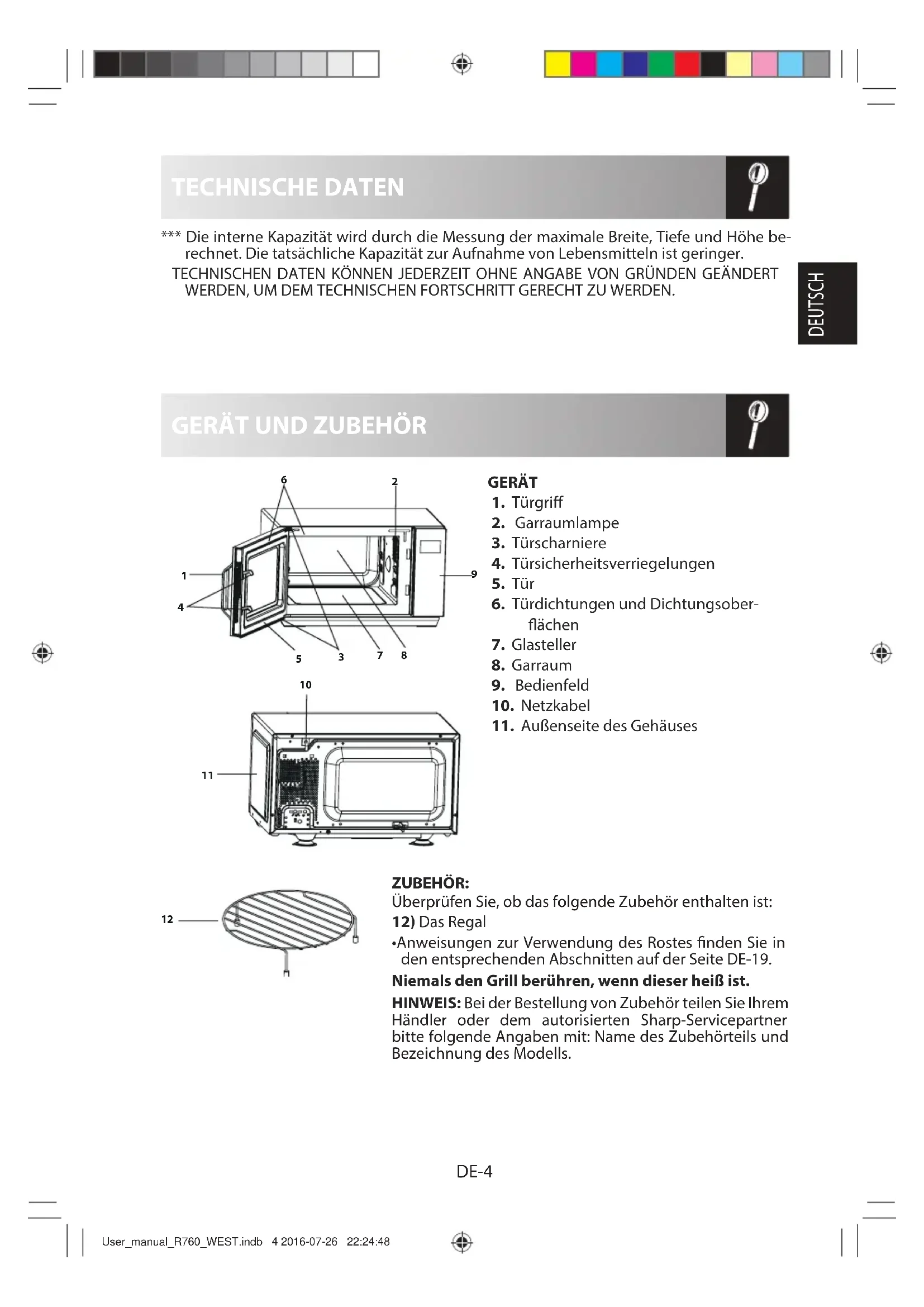 - Dieses Produkt erfüllt die Anforderungen der europäischen Norm EN55011. Das Produkt wird gemäß dieser Norm als Gerät der Gruppe 2, Klasse B eingestuft. Gruppe 2 bedeutet, dass das Gerät zweckbestimmt hochfrequente Energie in Form elek- tromagnetischer Strahlen zur Wärmebehandlung von Lebensmitteln erzeugt. Klasse B bedeutet, dass das Gerät für den Hausgebrauch geeignet ist. ** Die Tiefe umfasst nicht den Türgri. User_manual_R760_WEST.indb 3 2016-07-26 22:24:45DE-4 DEUTSCH *** Die interne Kapazität wird durch die Messung der maximale Breite, Tiefe und Höhe be- rechnet. Die tatsächliche Kapazität zur Aufnahme von Lebensmitteln ist geringer. TECHNISCHEN DATEN KÖNNEN JEDERZEIT OHNE ANGABE VON GRÜNDEN GEÄNDERT WERDEN, UM DEM TECHNISCHEN FORTSCHRITT GERECHT ZU WERDEN. TECHNISCHE DATEN