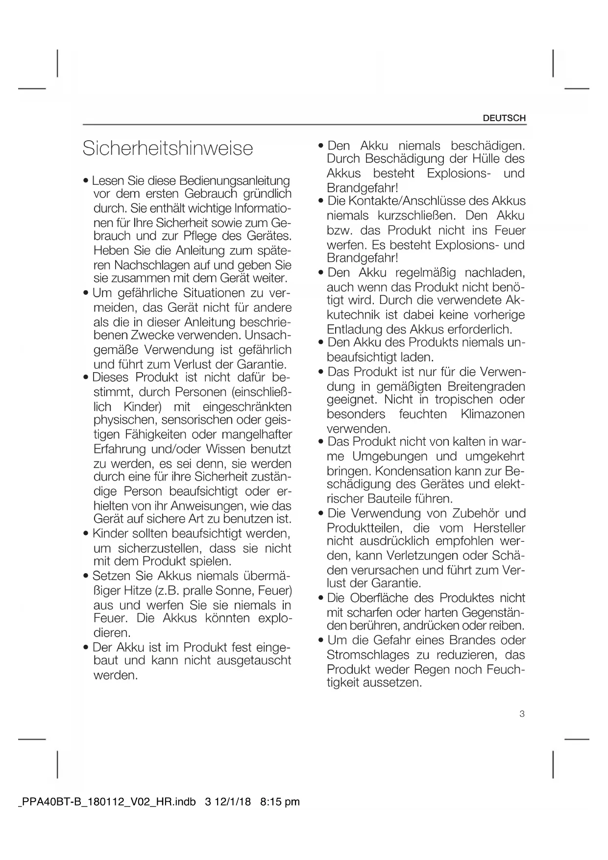 - Um die Gefahr eines Brandes oder Stromschlages zu reduzieren, das Produkt weder Regen noch Feuch- tigkeit aussetzen. IM_PPA40BT-B_180112_V02_HR.indb 3 12/1/18 8:15 pmDEUTSCH