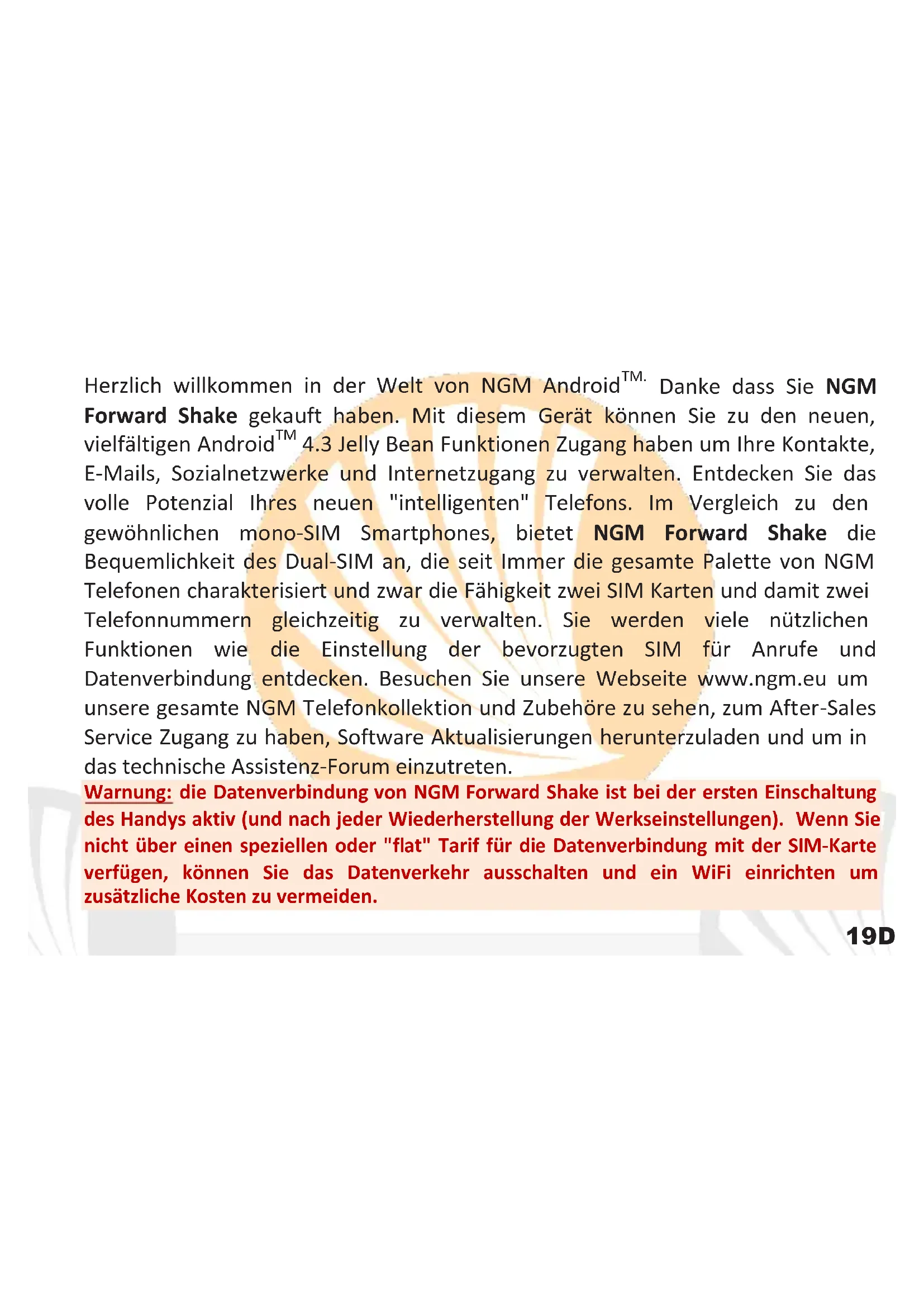 E-Mails, Sozialnetzwerke und Internetzugang zu verwalten. Entdecken Sie das volle Potenzial Ihres neuen "intelligenten" Telefons. Im Vergleich zu den gewöhnlichen mono-SIM Smartphones, bietet NGM Forward Shake die Bequemlichkeit des Dual-SIM an, die seit Immer die gesamte Palette von NGM Telefonen charakterisiert und zwar die Fähigkeit zwei SIM Karten und damit zwei Telefonnummern gleichzeitig zu verwalten. Sie werden viele nützlichen Funktionen wie die Einstellung der bevorzugten SIM für Anrufe und Datenverbindung entdecken. Besuchen Sie unsere Webseite www.ngm.eu um unsere gesamte NGM Telefonkollektion und Zubehöre zu sehen, zum After-Sales Service Zugang zu haben, Software Aktualisierungen herunterzuladen und um in das technische Assistenz-Forum einzutreten. Warnung: die Datenverbindung von NGM Forward Shake ist bei der ersten Einschaltung des Handys aktiv (und nach jeder Wiederherstellung der Werkseinstellungen). Wenn Sie nicht über einen speziellen oder "flat" Tarif für die Datenverbindung mit der SIM-Karte verfügen, können Sie das Datenverkehr ausschalten und ein WiFi einrichten um zusätzliche Kosten zu vermeiden.20 DEUTSCH Inbetriebnahme