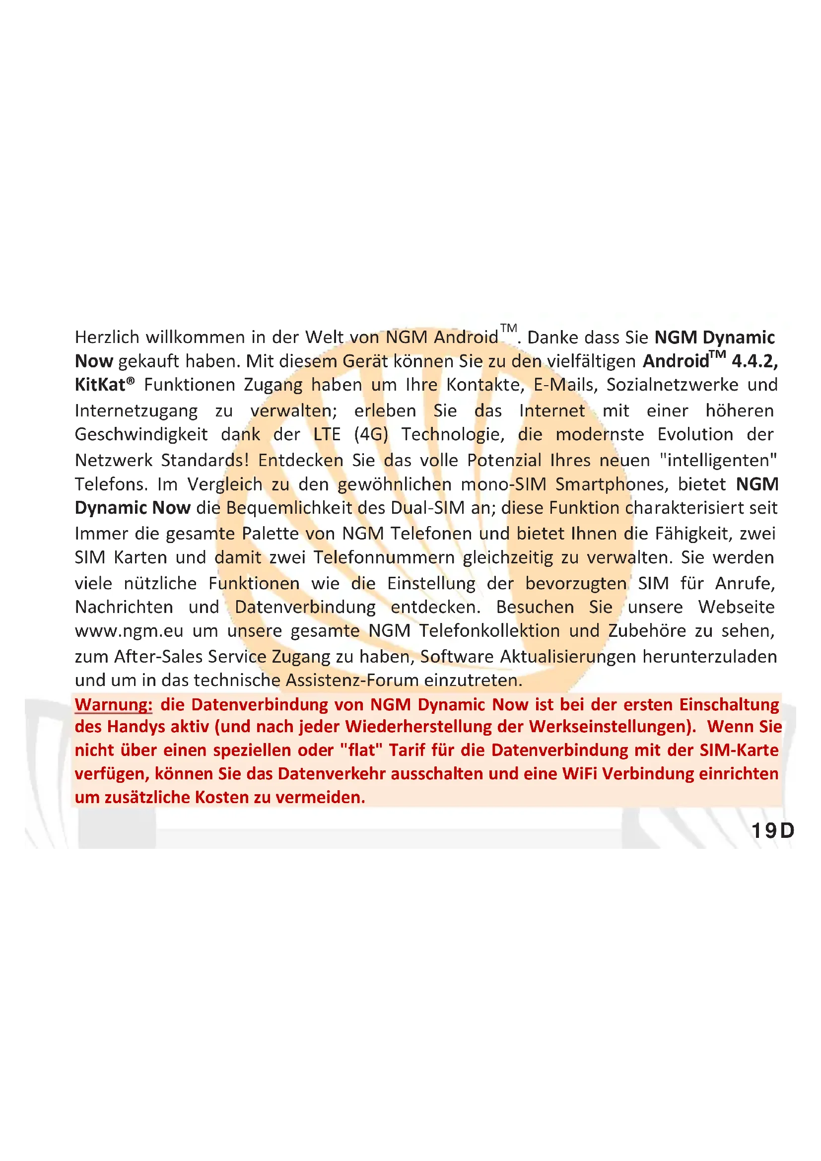 KitKat® Funktionen Zugang haben um Ihre Kontakte, E-Mails, Sozialnetzwerke und Internetzugang zu verwalten; erleben Sie das Internet mit einer höheren Geschwindigkeit dank der LTE (4G) Technologie, die modernste Evolution der Netzwerk Standards! Entdecken Sie das volle Potenzial Ihres neuen "intelligenten" Telefons. Im Vergleich zu den gewöhnlichen mono-SIM Smartphones, bietet NGM Dynamic Now die Bequemlichkeit des Dual-SIM an; diese Funktion charakterisiert seit Immer die gesamte Palette von NGM Telefonen und bietet Ihnen die Fähigkeit, zwei SIM Karten und damit zwei Telefonnummern gleichzeitig zu verwalten. Sie werden viele nützliche Funktionen wie die Einstellung der bevorzugten SIM für Anrufe, Nachrichten und Datenverbindung entdecken. Besuchen Sie unsere Webseite www.ngm.eu um unsere gesamte NGM Telefonkollektion und Zubehöre zu sehen, zum After-Sales Service Zugang zu haben, Software Aktualisierungen herunterzuladen und um in das technische Assistenz-Forum einzutreten. Warnung: die Datenverbindung von NGM Dynamic Now ist bei der ersten Einschaltung des Handys aktiv (und nach jeder Wiederherstellung der Werkseinstellungen). Wenn Sie nicht über einen speziellen oder "flat" Tarif für die Datenverbindung mit der SIM-Karte verfügen, können Sie das Datenverkehr ausschalten und eine WiFi Verbindung einrichten um zusätzliche Kosten zu vermeiden.20 DEUTSCH Inbetriebnahme