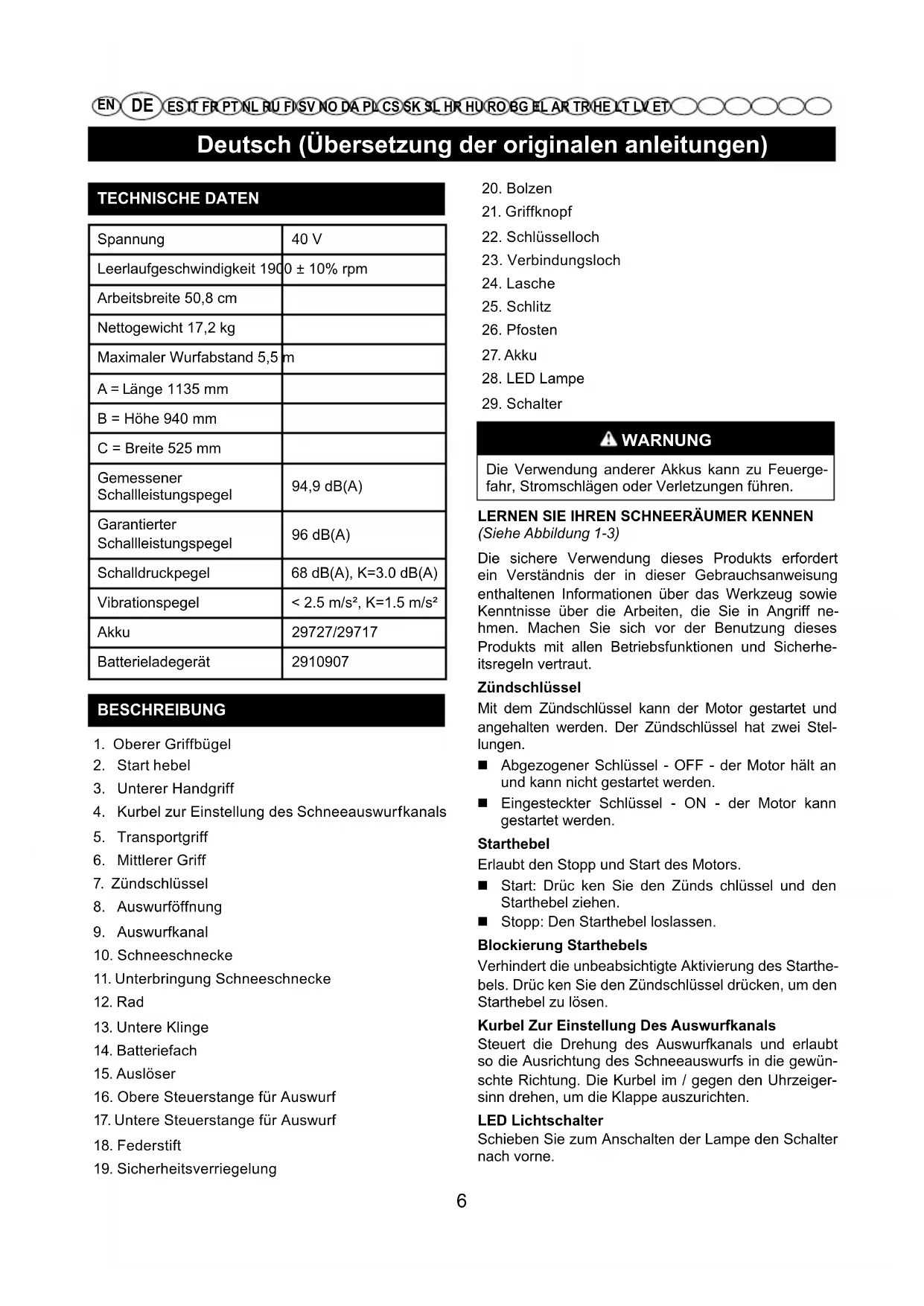 5. Transportgriff6. Mittlerer Griff7. Zündschlüssel8. Auswurföffnung9. Auswurfkanal10. Schneeschnecke11. Unterbringung Schneeschnecke12. Rad13. Untere Klinge14. Batteriefach15. Auslöser16. Obere Steuerstange für Auswurf17. Untere Steuerstange für Auswurf18. Federstift19. Sicherheitsverriegelung20. Bolzen21. Griffknopf22. Schlüsselloch23. Verbindungsloch24. Lasche25. Schlitz26. Pfosten27. Akku 28. LED Lampe29. Schalter WARNUNG Die Verwendung anderer Akkus kann zu Feuerge-fahr, Stromschlägen oder Verletzungen führen.LERNEN SIE IHREN SCHNEERÄUMER KENNEN (Siehe Abbildung 1-3)Die sichere Verwendung dieses Produkts erfordert ein Verständnis der in dieser Gebrauchsanweisung enthaltenen Informationen über das Werkzeug sowie Kenntnisse über die Arbeiten, die Sie in Angriff ne-hmen. Machen Sie sich vor der Benutzung dieses Produkts mit allen Betriebsfunktionen und Sicherhe-itsregeln vertraut.ZündschlüsselMit dem Zündschlüssel kann der Motor gestartet und angehalten werden. Der Zündschlüssel hat zwei Stel-lungen. Abgezogener Schlüssel - OFF - der Motor hält an und kann nicht gestartet werden. Eingesteckter Schlüssel - ON - der Motor kann gestartet werden.StarthebelErlaubt den Stopp und Start des Motors. Start: Drüc ken Sie den Zünds chlüssel und den Starthebel ziehen. Stopp: Den Starthebel loslassen. Blockierung StarthebelsVerhindert die unbeabsichtigte Aktivierung des Starthe-bels. Drüc ken Sie den Zündschlüssel drücken, um den Starthebel zu lösen.Kurbel Zur Einstellung Des AuswurfkanalsSteuert die Drehung des Auswurfkanals und erlaubt so die Ausrichtung des Schneeauswurfs in die gewün-schte Richtung. Die Kurbel im / gegen den Uhrzeiger-sinn drehen, um die Klappe auszurichten.LED LichtschalterSchieben Sie zum Anschalten der Lampe den Schalter nach vorne. 6Deutsch (Übersetzung der originalen anleitungen)