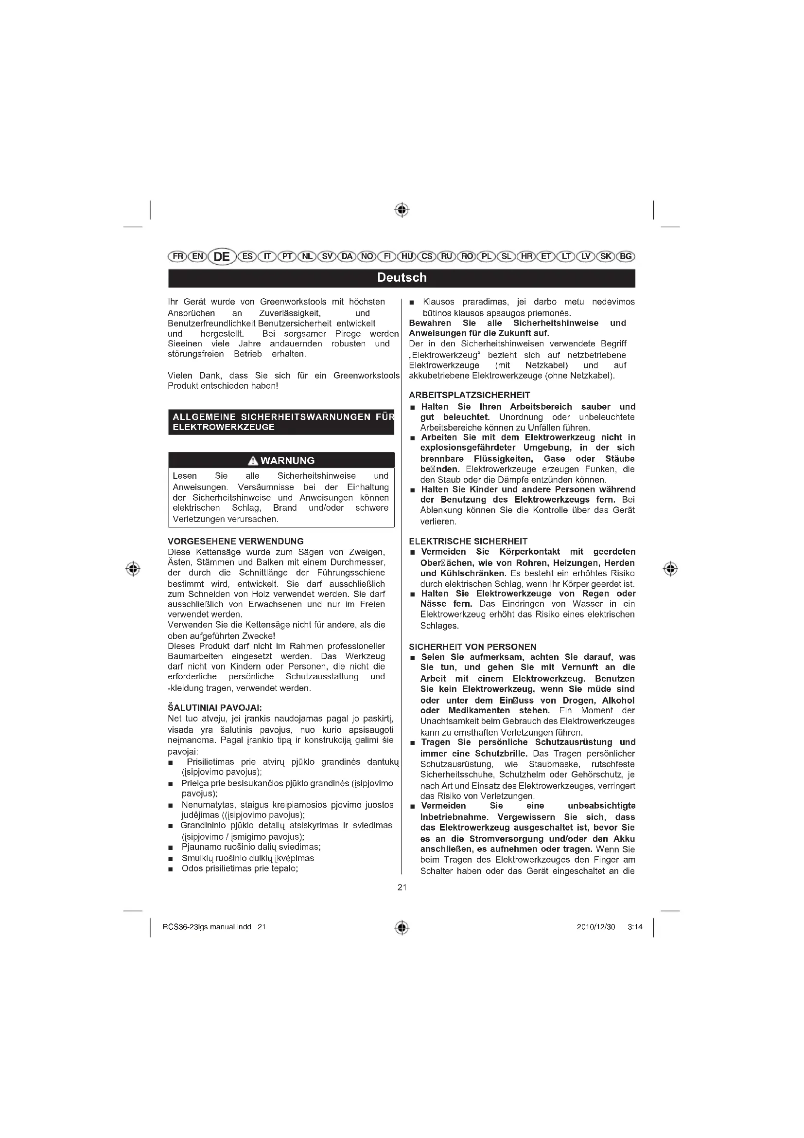 FR EN ES IT PT NL SV DA NO FI HU CS RU RO PL SL HR ET LT LV SK BG Ihr Gerät wurde von Greenworkstools mit höchsten Ansprüchen an Zuverlässigkeit, und Benutzerfreundlichkeit Benutzersicherheit entwickelt und hergestellt. Bei sorgsamer Pirege werden Sieeinen viele Jahre andauernden robusten und störungsfreien Betrieb erhalten. Vielen Dank, dass Sie sich für ein Greenworkstools Produkt entschieden haben!