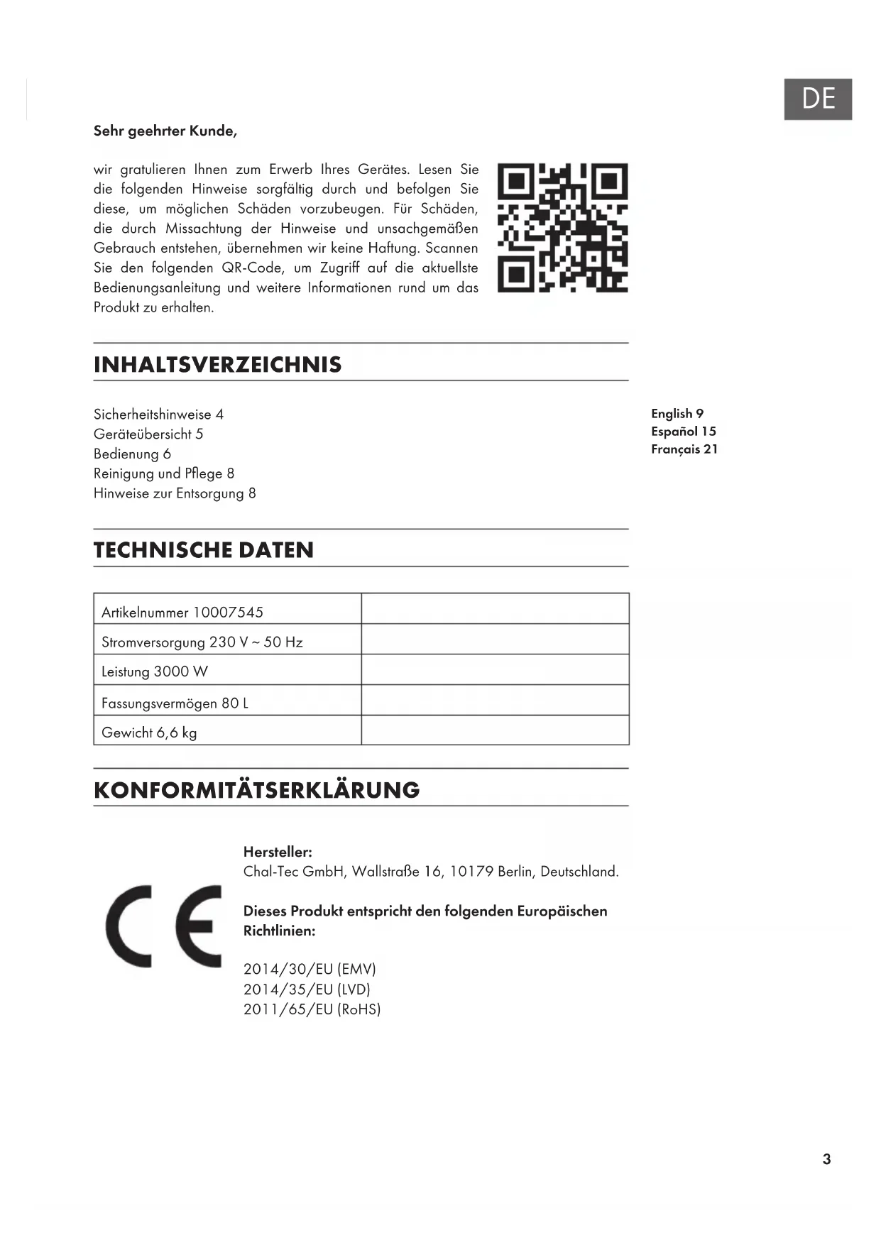 Sehr geehrter Kunde, wir gratulieren Ihnen zum Erwerb Ihres Gerätes. Lesen Sie die folgenden Hinweise sorgfältig durch und befolgen Sie diese, um möglichen Schäden vorzubeugen. Für Schäden, die durch Missachtung der Hinweise und unsachgemäßen Gebrauch entstehen, übernehmen wir keine Haftung. Scannen Sie den folgenden QR-Code, um Zugriff auf die aktuellste Bedienungsanleitung und weitere Informationen rund um das Produkt zu erhalten. INHALTSVERZEICHNIS Sicherheitshinweise4 Geräteübersicht5 Bedienung6 Reinigung und Pege8 Hinweise zur Entsorgung8 TECHNISCHE DATEN Artikelnummer 10007545 Stromversorgung 230 V ~ 50 Hz Leistung 3000 W Fassungsvermögen 80 L Gewicht 6,6 kg