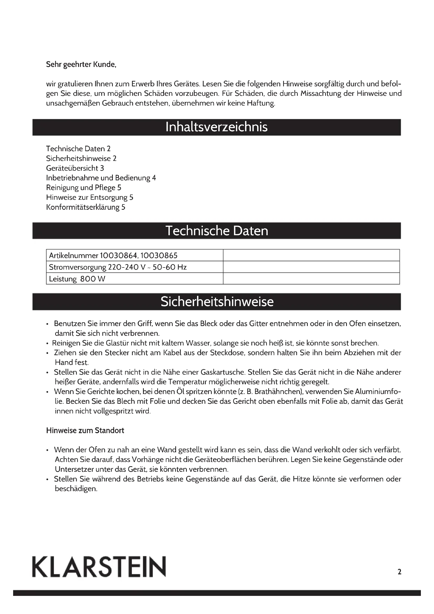 Laden Sie die Anleitung für Ihr Ofen kostenlos im PDF-Format! Finden Sie Ihr Handbuch Mini 10030764 - Klarstein und nehmen Sie Ihr elektronisches Gerät wieder in die Hand. Auf dieser Seite sind alle Dokumente veröffentlicht, die für die Verwendung Ihres Geräts notwendig sind. Mini 10030764 von der Marke Klarstein.