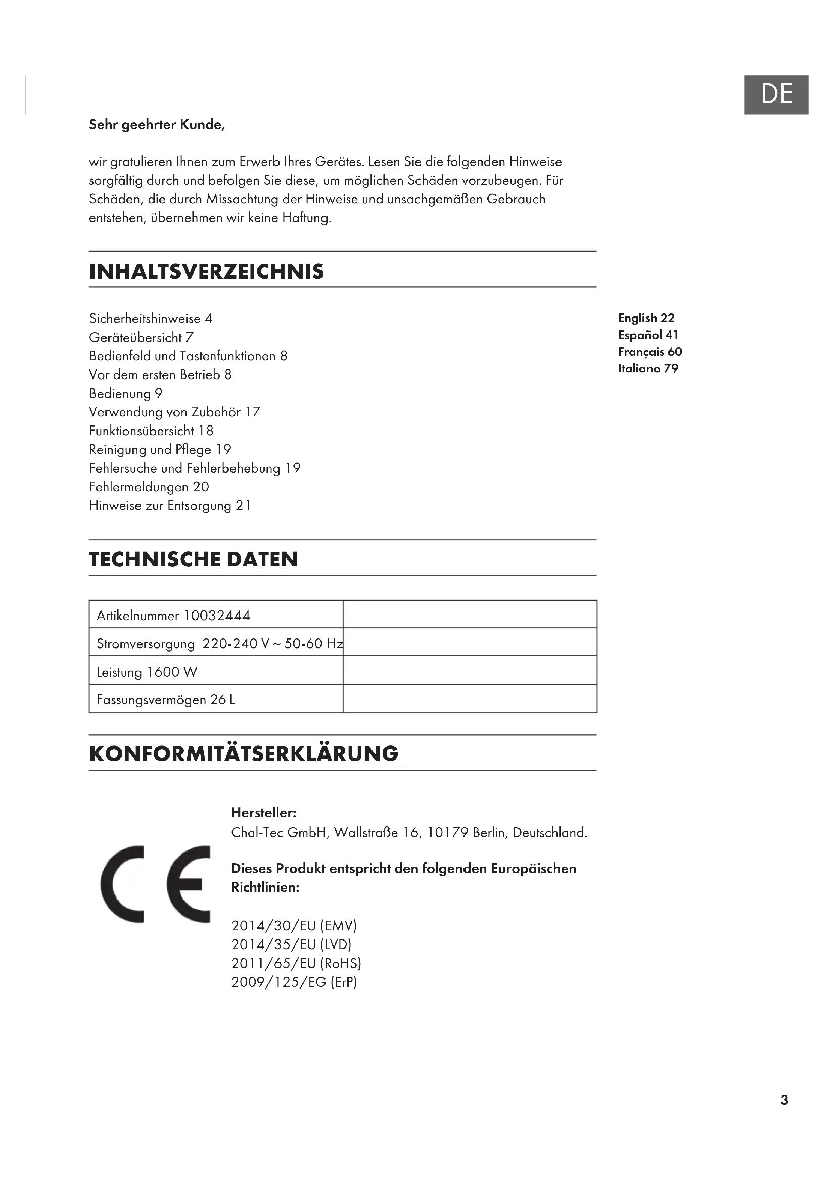 Hersteller: Chal-Tec GmbH, Wallstraße 16, 10179 Berlin, Deutschland. Dieses Produkt entspricht den folgenden Europäischen Richtlinien: 2014/30/EU (EMV) 2014/35/EU (LVD) 2011/65/EU (RoHS) 2009/125/EG (ErP) English 22 Español 41 Français 60 Italiano 794