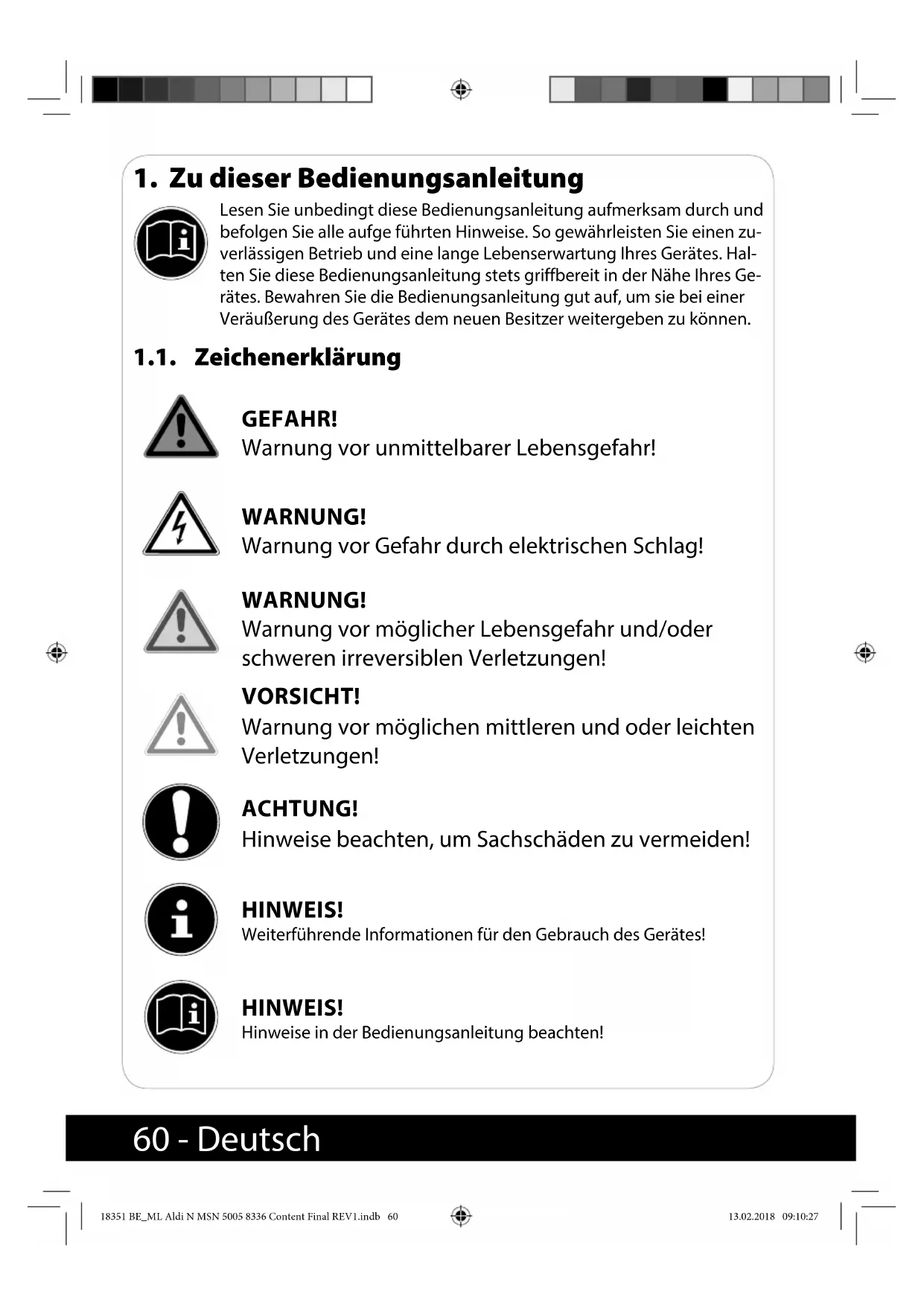 Lesen Sie unbedingt diese Bedienungsanleitung aufmerksam durch und befolgen Sie alle aufge führten Hinweise. So gewährleisten Sie einen zu- verlässigen Betrieb und eine lange Lebenserwartung Ihres Gerätes. Hal- ten Sie diese Bedienungsanleitung stets griffbereit in der Nähe Ihres Ge- rätes. Bewahren Sie die Bedienungsanleitung gut auf, um sie bei einer Veräußerung des Gerätes dem neuen Besitzer weitergeben zu können. 1.1. Zeichenerklärung GEFAHR! Warnung vor unmittelbarer Lebensgefahr! WARNUNG! Warnung vor Gefahr durch elektrischen Schlag! WARNUNG! Warnung vor möglicher Lebensgefahr und/oder schweren irreversiblen Verletzungen! VORSICHT! Warnung vor möglichen mittleren und oder leichten Verletzungen! ACHTUNG! Hinweise beachten, um Sachschäden zu vermeiden! HINWEIS! Weiterführende Informationen für den Gebrauch des Gerätes! HINWEIS! Hinweise in der Bedienungsanleitung beachten! 18351 BE_ML Aldi N MSN 5005 8336 Content Final REV1.indb 6018351 BE_ML Aldi N MSN 5005 8336 Content Final REV1.indb 60 13.02.2018 09:10:2713.02.2018 09:10:27Deutsch - 61 Symbol für Wechselstrom Benutzung in Innenräumen Geräte mit diesem Symbol sind nur für die Verwendung in Innenräu- men geeignet. Lebensmittelechte Oberfläche