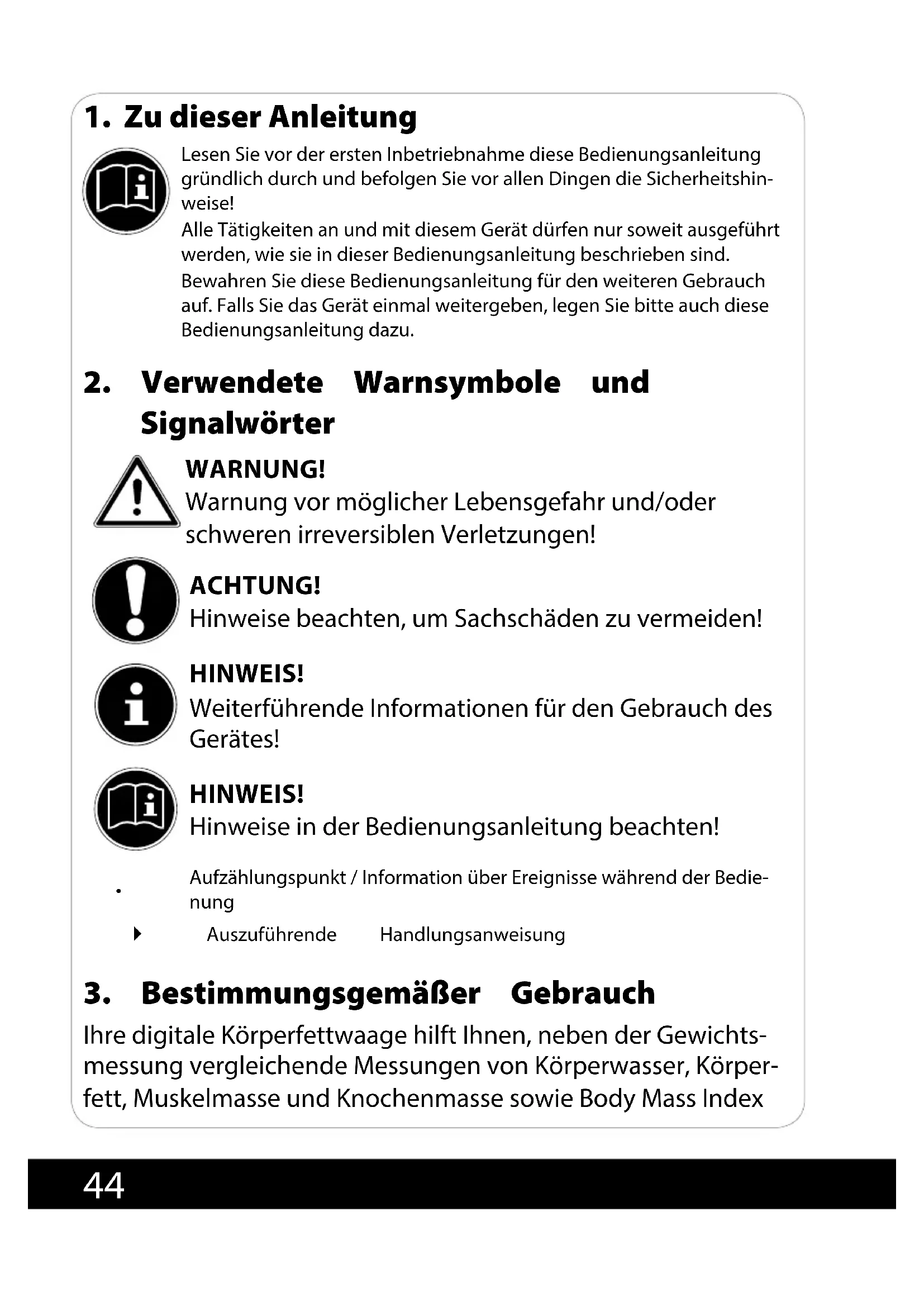Signalwörter WARNUNG! Warnung vor möglicher Lebensgefahr und/oder schweren irreversiblen Verletzungen! ACHTUNG! Hinweise beachten, um Sachschäden zu vermeiden! HINWEIS! Weiterführende Informationen für den Gebrauch des Gerätes! HINWEIS! Hinweise in der Bedienungsanleitung beachten!