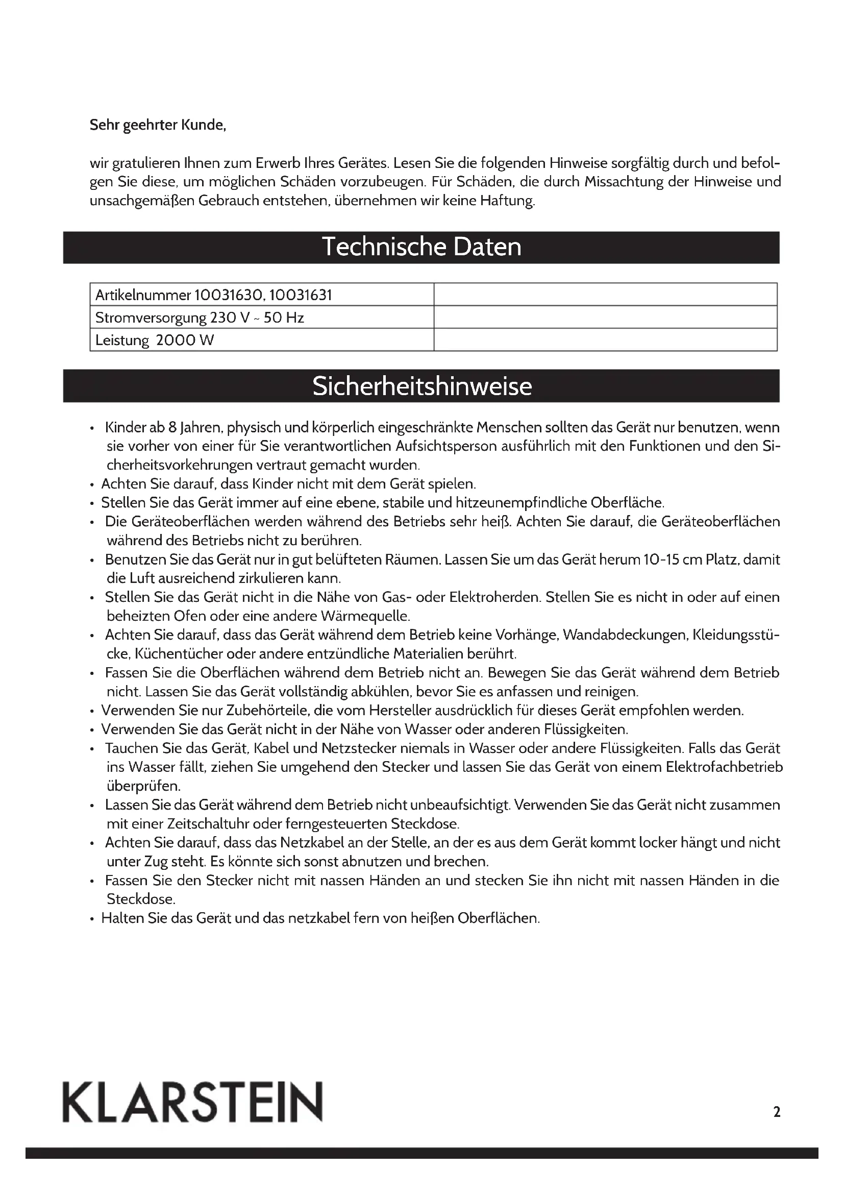 Finden Sie kostenlos die Bedienungsanleitung des Geräts 10031630 Klarstein als PDF.