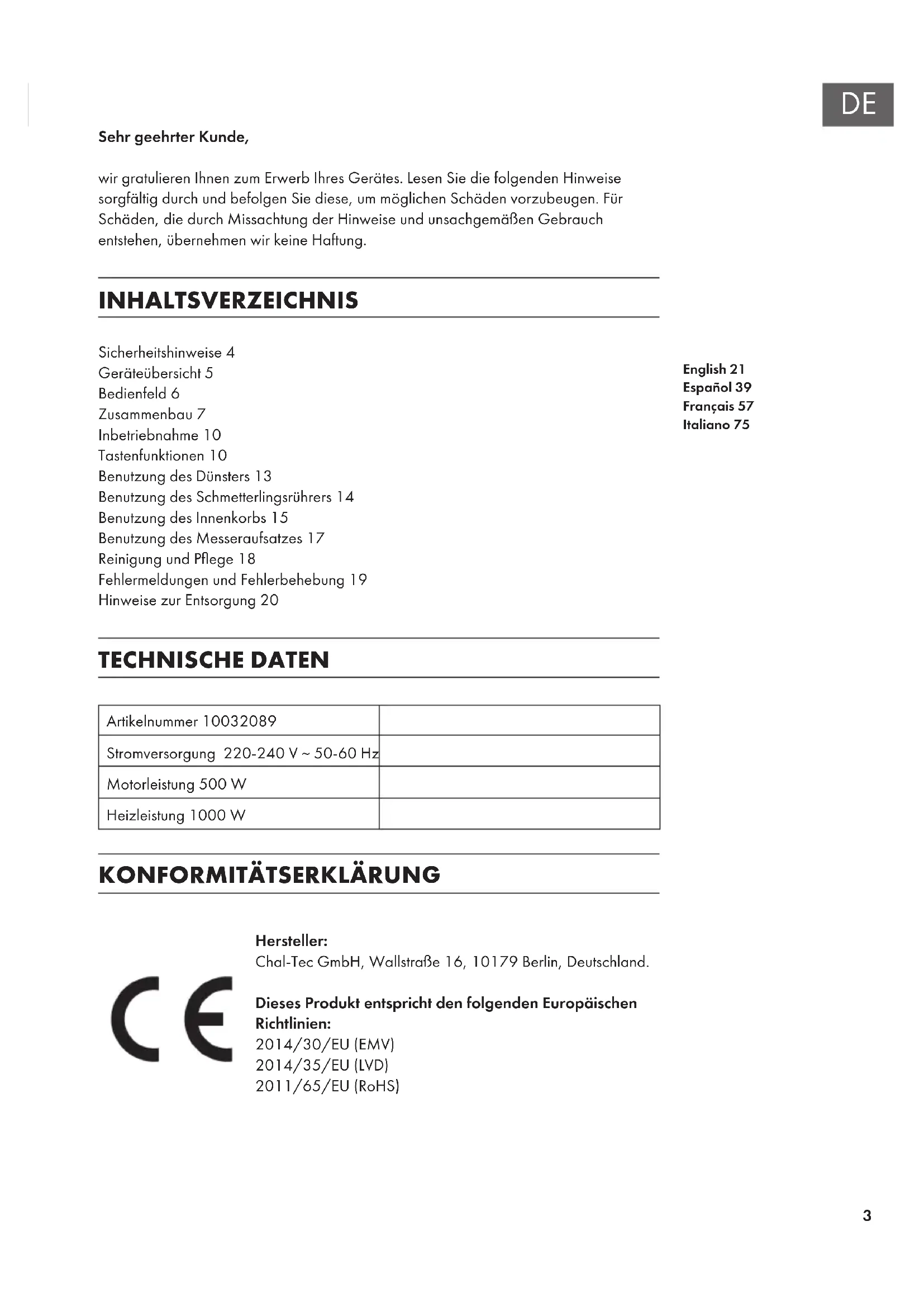 Hersteller: Chal-Tec GmbH, Wallstraße 16, 10179 Berlin, Deutschland. Dieses Produkt entspricht den folgenden Europäischen Richtlinien: 2014/30/EU (EMV) 2014/35/EU (LVD) 2011/65/EU (RoHS) English 21 Español 39 Français 57 Italiano 754