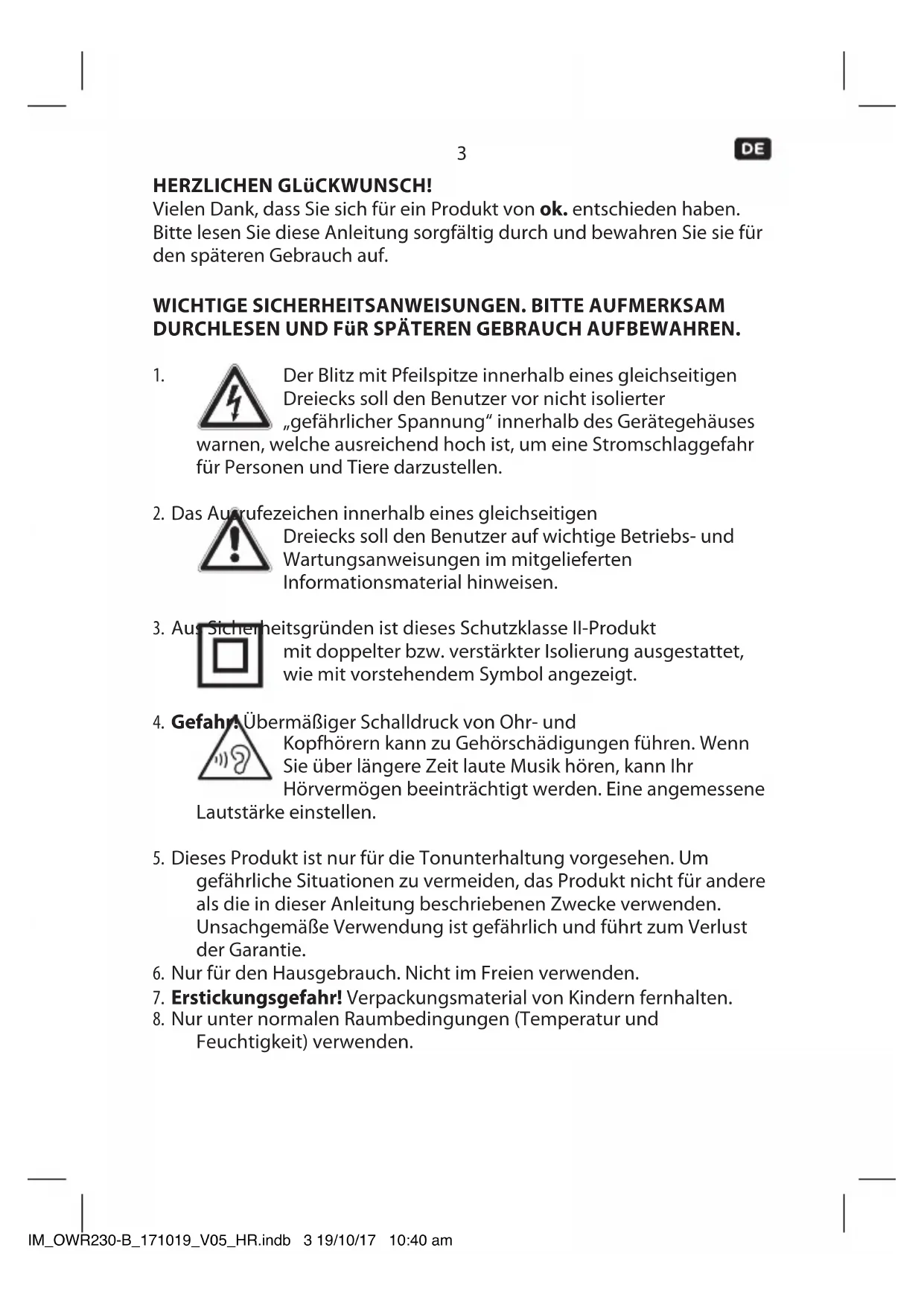 MHz IM_OWR230-B_171019_V05_HR.indb 2 19/10/17 10:40 am3 HERZLICHEN GLüCKWUNSCH! Vielen Dank, dass Sie sich für ein Produkt von ok. entschieden haben. Bitte lesen Sie diese Anleitung sorgfältig durch und bewahren Sie sie für den späteren Gebrauch auf.