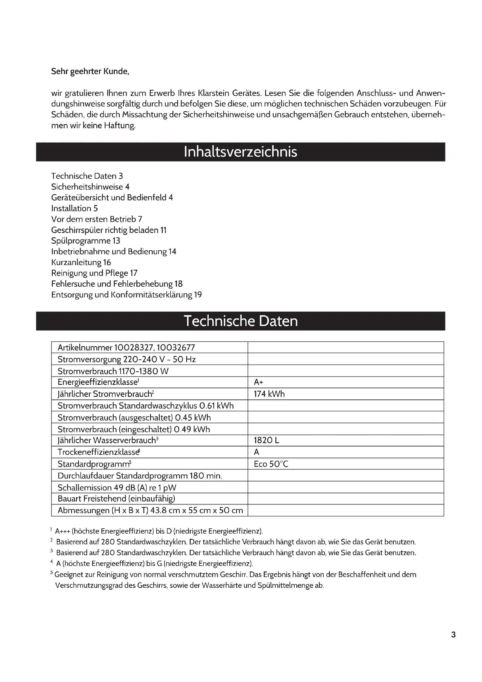 Geschirrspüler Dishwasher Lavavajillas Lave-vaisselle Lavastoviglie3 Sehr geehrter Kunde, wir gratulieren Ihnen zum Erwerb Ihres Klarstein Gerätes. Lesen Sie die folgenden Anschluss- und Anwen- dungshinweise sorgfältig durch und befolgen Sie diese, um möglichen technischen Schäden vorzubeugen. Für Schäden, die durch Missachtung der Sicherheitshinweise und unsachgemäßen Gebrauch entstehen, überneh- men wir keine Haftung. Inhaltsverzeichnis Technische Daten 3 Sicherheitshinweise 4 Geräteübersicht und Bedienfeld 4 Installation 5 Vor dem ersten Betrieb 7 Geschirrspüler richtig beladen 11 Spülprogramme 13 Inbetriebnahme und Bedienung 14 Kurzanleitung 16 Reinigung und Pflege 17 Fehlersuche und Fehlerbehebung 18 Entsorgung und Konformitätserklärung 19 Technische Daten Artikelnummer 10028327, 10032677 Stromversorgung 220-240 V ~ 50 Hz Stromverbrauch 1170-1380 W Energieeffizienzklasse