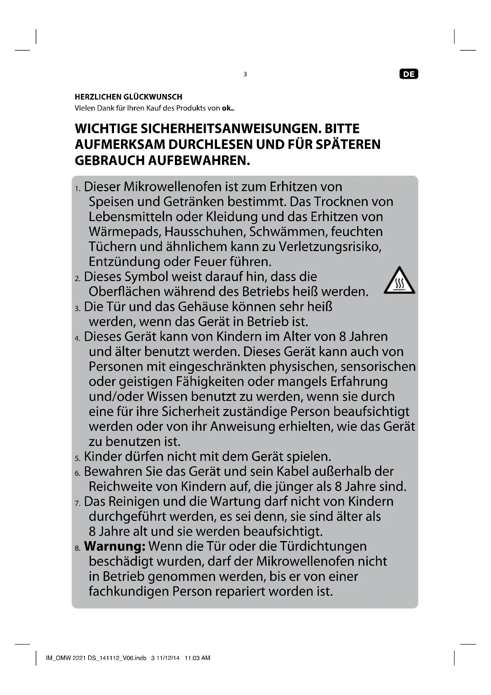 beschädigt wurden, darf der Mikrowellenofen nicht in Betrieb genommen werden, bis er von einer fachkundigen Person repariert worden ist. IM_OMW 2221 DS_141112_V06.indb 3 11/12/14 11:03 AM4