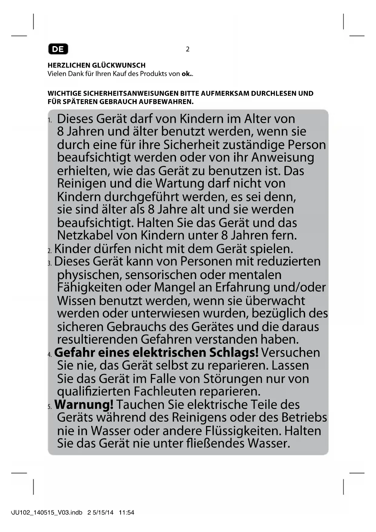 Geräts während des Reinigens oder des Betriebs nie in Wasser oder andere Flüssigkeiten. Halten Sie das Gerät nie unter ießendes Wasser. IM_OJU102_140515_V03.indb 2 5/15/14 11:54 AMDE