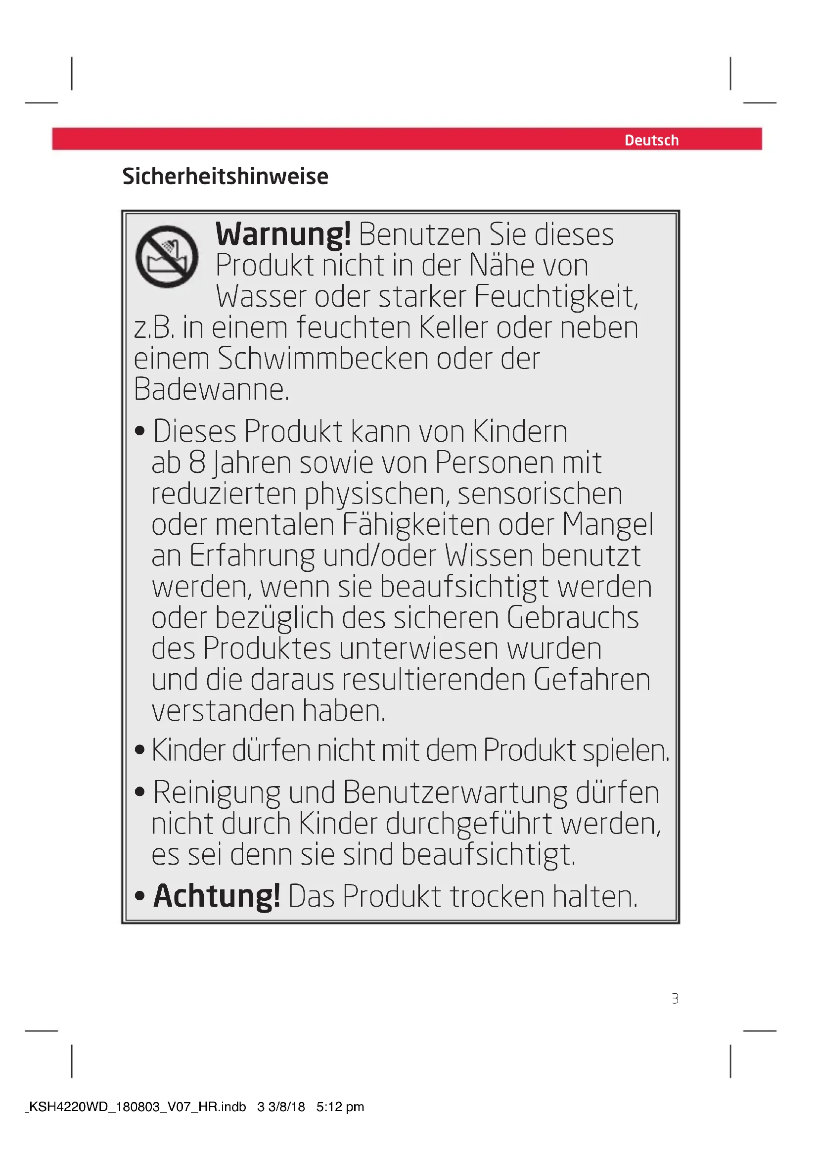 IM_KSH4220WD_180803_V07_HR.indb 2 3/8/18 5:12 pm3 Deutsch Sicherheitshinweise Warnung! Benutzen Sie dieses Produkt nicht in der Nähe von Wasser oder starker Feuchtigkeit, z.B. in einem feuchten Keller oder neben einem Schwimmbecken oder der Badewanne.