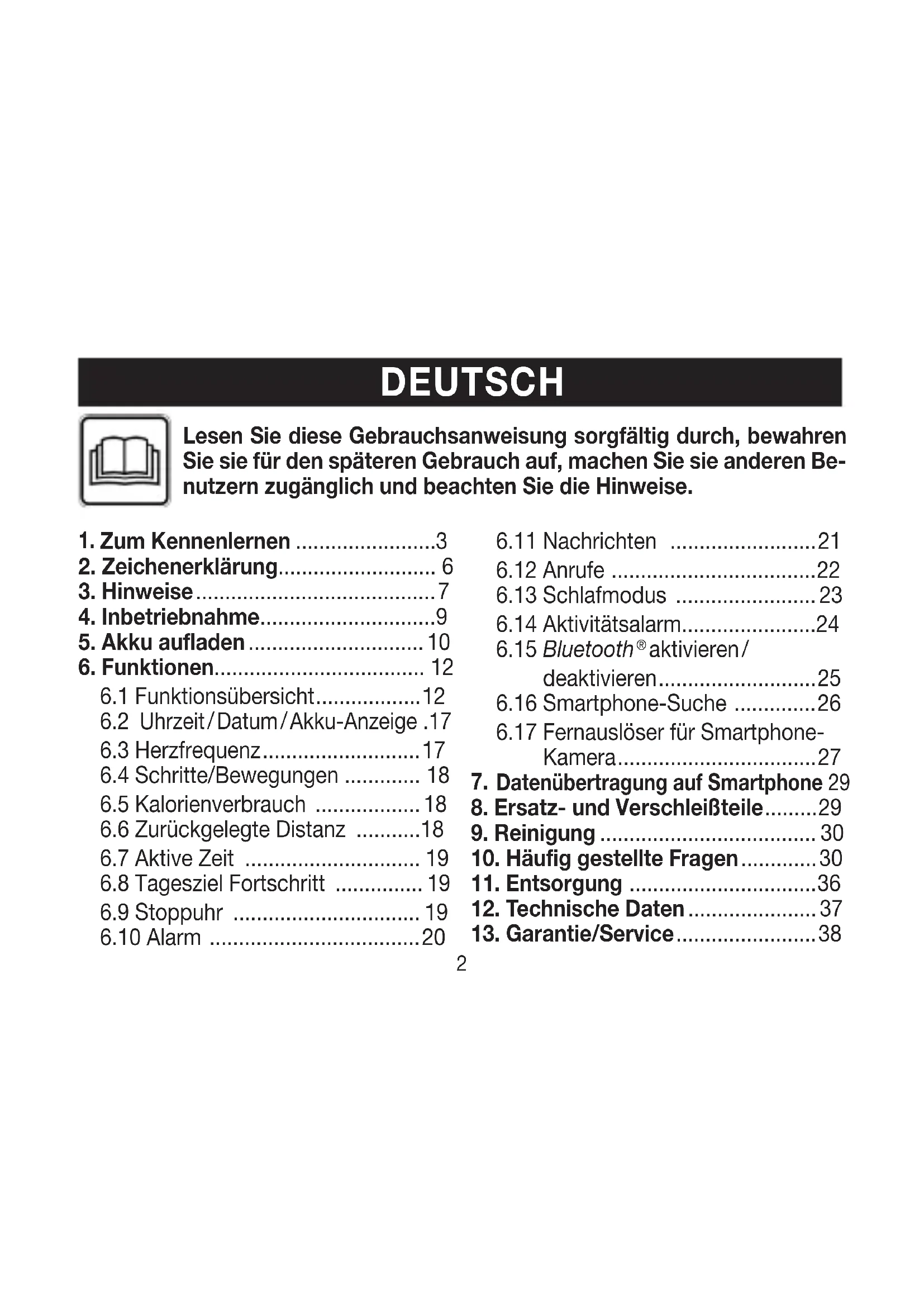 DEUTSCH Lesen Sie diese Gebrauchsanweisung sorgfältig durch, bewahren Sie sie für den späteren Gebrauch auf, machen Sie sie anderen Be- nutzern zugänglich und beachten Sie die Hinweise.2 3 Lieferumfang Überprüfen Sie den Lieferumfang auf äußere Unversehrtheit der Kartonverpackung und auf die Vollständigkeit des Inhalts. Vor dem Gebrauch ist sicherzustellen, dass das Gerät und Zubehör keine sichtbaren Schäden aufweisen und jegliches Verpa- ckungsmaterial entfernt wird. Benutzen Sie es im Zweifelsfall nicht und wenden Sie sich an Ihren Händler oder an die angegebene Kundendienstadresse. 1 x Gebrauchsanweisung 1 x Aktivitätssensor-Armband 1 x USB-Ladekabel