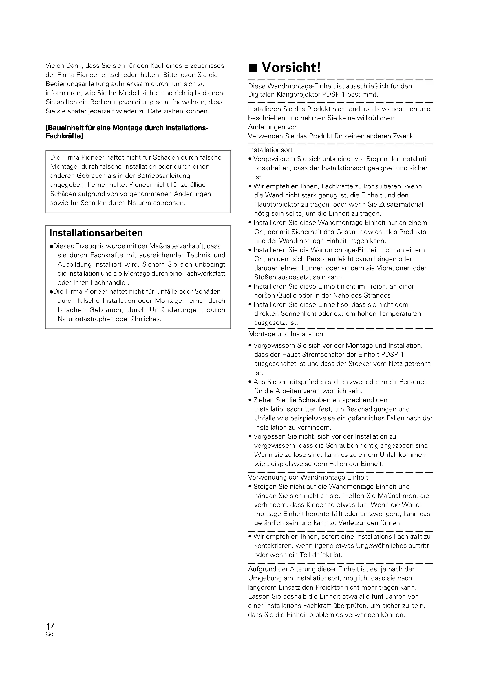 Vielen Dank, dass Sie sich für den Kauf eines Erzeugnisses der Firma Pioneer entschieden haben. Bitte lesen Sie die Bedienungsanleitung aufmerksam durch, um sich zu informieren, wie Sie Ihr Modell sicher und richtig bedienen. Sie sollten die Bedienungsanleitung so aufbewahren, dass Sie sie später jederzeit wieder zu Rate ziehen können. [Baueinheit für eine Montage durch Installations- Fachkräfte] Installationsarbeiten ÷ Dieses Erzeugnis wurde mit der Maßgabe verkauft, dass sie durch Fachkräfte mit ausreichender Technik und Ausbildung installiert wird. Sichern Sie sich unbedingt die Installation und die Montage durch eine Fachwerkstatt oder Ihren Fachhändler. ÷ Die Firma Pioneer haftet nicht für Unfälle oder Schäden durch falsche Installation oder Montage, ferner durch falschen Gebrauch, durch Umänderungen, durch Naturkatastrophen oder ähnliches. 7 Vorsicht! Diese Wandmontage-Einheit ist ausschließlich für den Digitalen Klangprojektor PDSP-1 bestimmt. Installieren Sie das Produkt nicht anders als vorgesehen und beschrieben und nehmen Sie keine willkürlichen Änderungen vor. Verwenden Sie das Produkt für keinen anderen Zweck. Installationsort