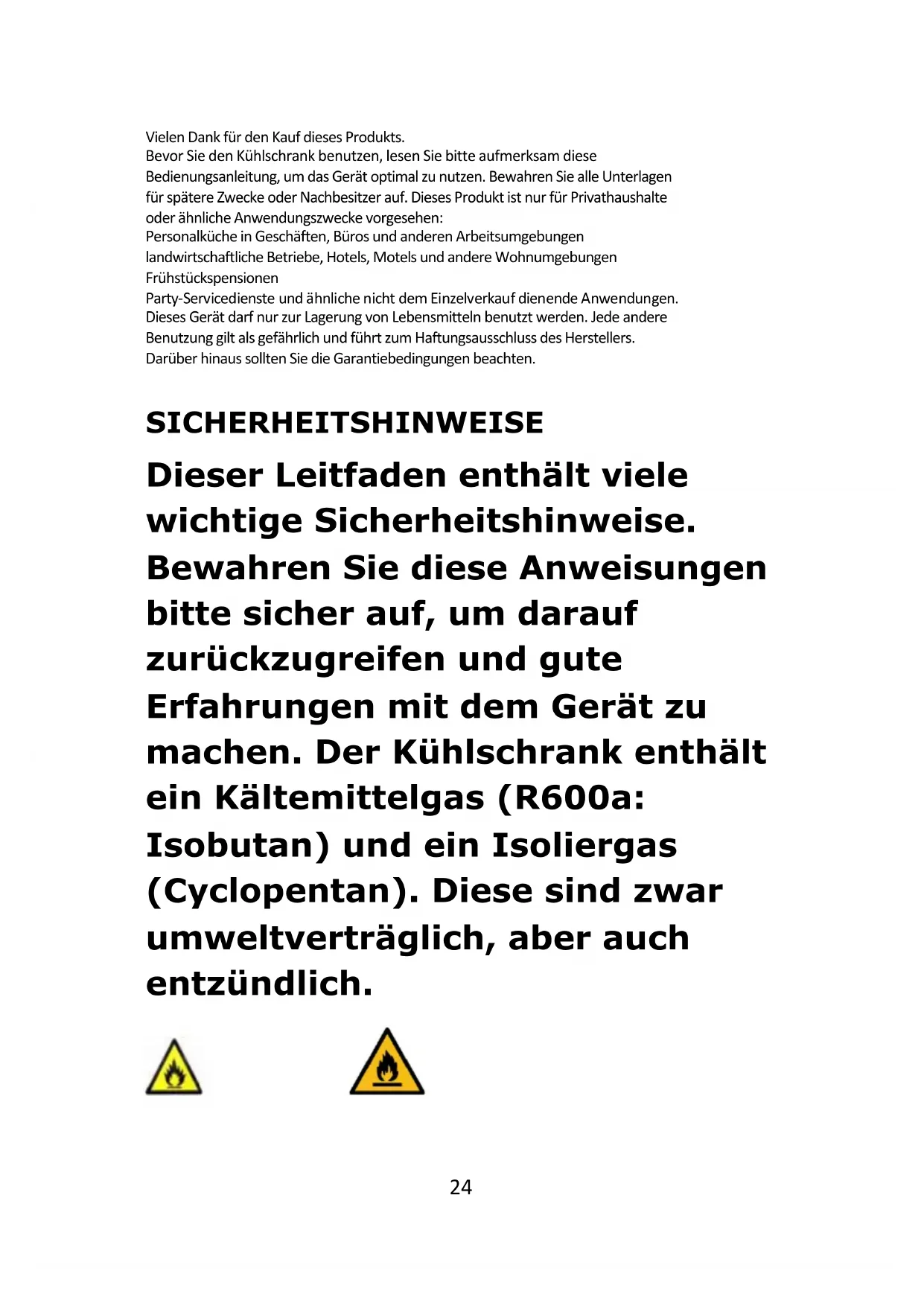 recommend you seek the help of another individual to support the doors whilst performing this operation. Always wear adequate PPE (Personal Protective Equipment) for the task at hand. Prepare a surface with a soft, clean towel or similar where you can place the door during these steps. Ensur ing the door seals correctly: It is normal for the seal to be compressed after the door has been reversed. With the door closed, use a hair dryer to expand the seal and fill the gap between the door and the body of the appliance. Take care not to use the hair dryer too close to the appliance, which could damage the seal. A distance of approximately 10cm should be adequate. When completed, allow the seal and door to cool before touching them. Once done, the seal should remain in position.24 Vielen Dank für den Kauf dieses Produkts. Bevor Sie den Kühlschrank benutzen, lesen Sie bitte aufmerksam diese Bedienungsanleitung, um das Gerät optimal zu nutzen. Bewahren Sie alle Unterlagen für spätere Zwecke oder Nachbesitzer auf. Dieses Produkt ist nur für Privathaushalte oder ähnliche Anwendungszwecke vorgesehen: Personalküche in Geschäften, Büros und anderen Arbeitsumgebungen landwirtschaftliche Betriebe, Hotels, Motels und andere Wohnumgebungen Frühstückspensionen Party-Servicedienste und ähnliche nicht dem Einzelverkauf dienende Anwendungen. Dieses Gerät darf nur zur Lagerung von Lebensmitteln benutzt werden. Jede andere Benutzung gilt als gefährlich und führt zum Haftungsausschluss des Herstellers. Darüber hinaus sollten Sie die Garantiebedingungen beachten. SICHERHEITSHINWEISE Dieser Leitfaden enthält viele wichtige Sicherheitshinweise. Bewahren Sie diese Anweisungen bitte sicher auf, um darauf zurückzugreifen und gute Erfahrungen mit dem Gerät zu machen. Der Kühlschrank enthält ein Kältemittelgas (R600a: Isobutan) und ein Isoliergas (Cyclopentan). Diese sind zwar umweltverträglich, aber auch entzündlich.25 Vorsicht: Brandgefahr Falls der Kühlkreislauf beschädigt ist: Vermeiden Sie offene Flammen und Zündquellen. Lüften Sie gründlich den Raum, in dem sich das Gerät befindet. Prozent Betriebsdauer WARNUNG!