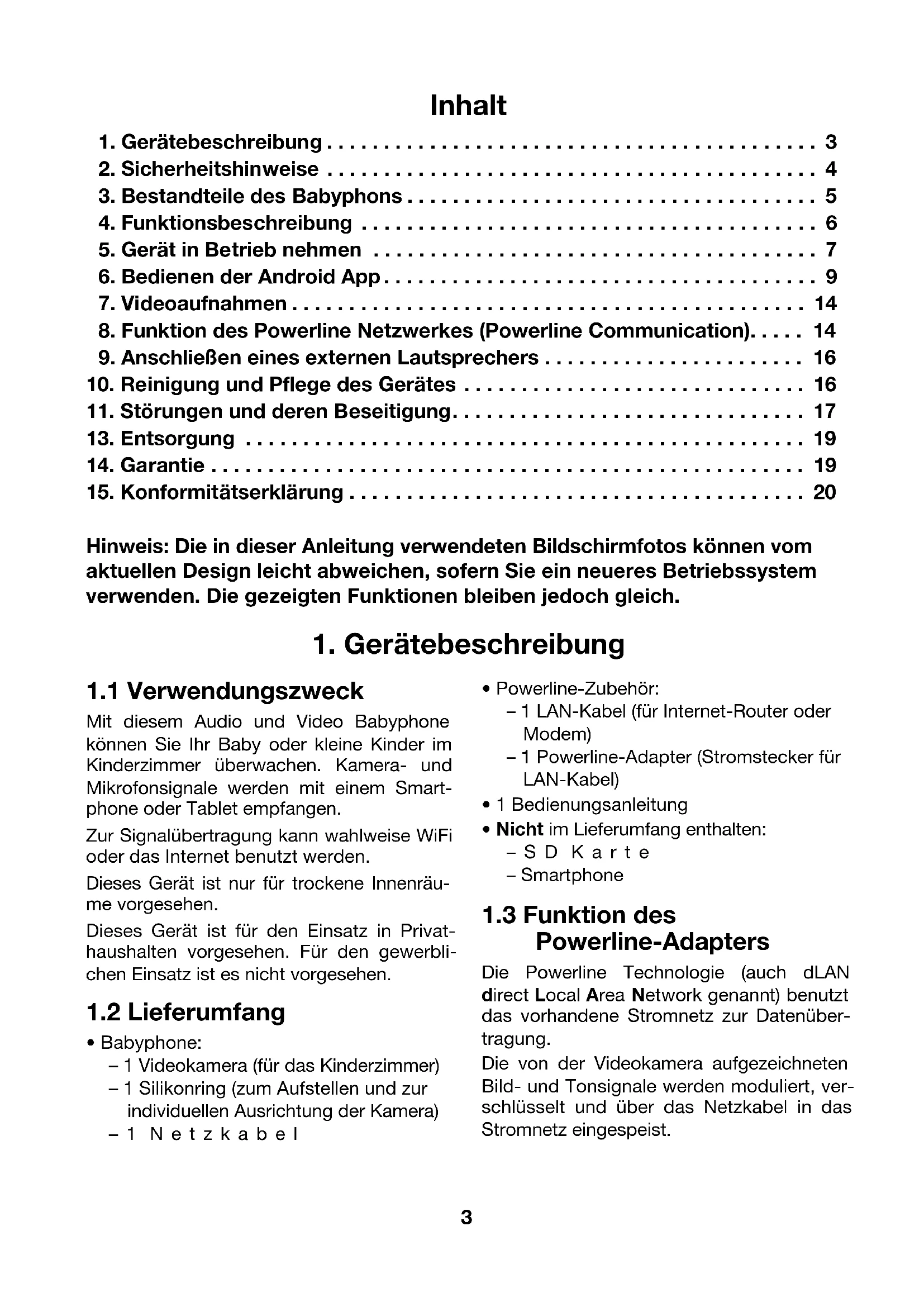 Mit diesem Audio und Video Babyphone können Sie Ihr Baby oder kleine Kinder im Kinderzimmer überwachen. Kamera- und Mikrofonsignale werden mit einem Smart- phone oder Tablet empfangen. Zur Signalübertragung kann wahlweise WiFi oder das Internet benutzt werden. Dieses Gerät ist nur für trockene Innenräu- me vorgesehen. Dieses Gerät ist für den Einsatz in Privat- haushalten vorgesehen. Für den gewerbli- chen Einsatz ist es nicht vorgesehen.
