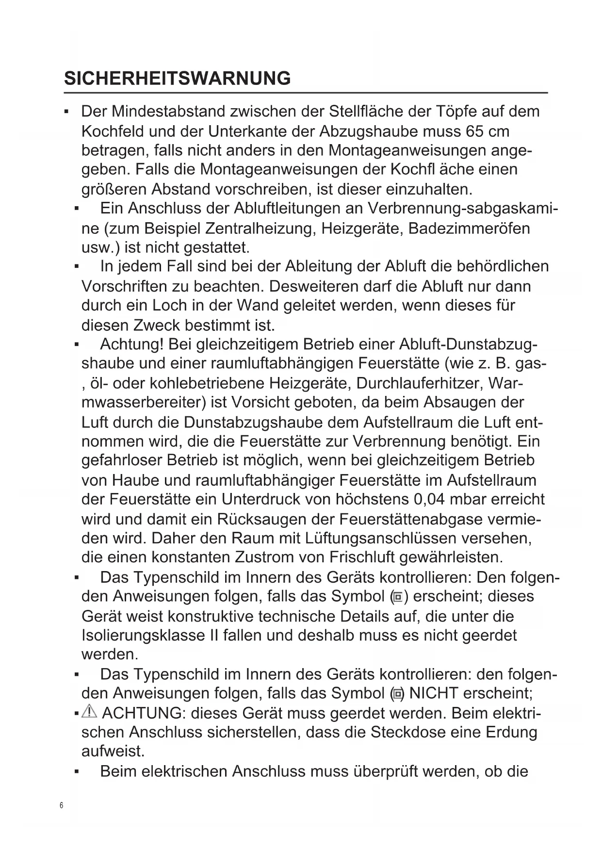 - Achtung! Bei gleichzeitigem Betrieb einer Abluft-Dunstabzug- shaube und einer raumluftabhängigen Feuerstätte (wie z. B. gas- , öl- oder kohlebetriebene Heizgeräte, Durchlauferhitzer, War- mwasserbereiter) ist Vorsicht geboten, da beim Absaugen der Luft durch die Dunstabzugshaube dem Aufstellraum die Luft ent- nommen wird, die die Feuerstätte zur Verbrennung benötigt. Ein gefahrloser Betrieb ist möglich, wenn bei gleichzeitigem Betrieb von Haube und raumluftabhängiger Feuerstätte im Aufstellraum der Feuerstätte ein Unterdruck von höchstens 0,04 mbar erreicht wird und damit ein Rücksaugen der Feuerstättenabgase vermie- den wird. Daher den Raum mit Lüftungsanschlüssen versehen, die einen konstanten Zustrom von Frischluft gewährleisten.