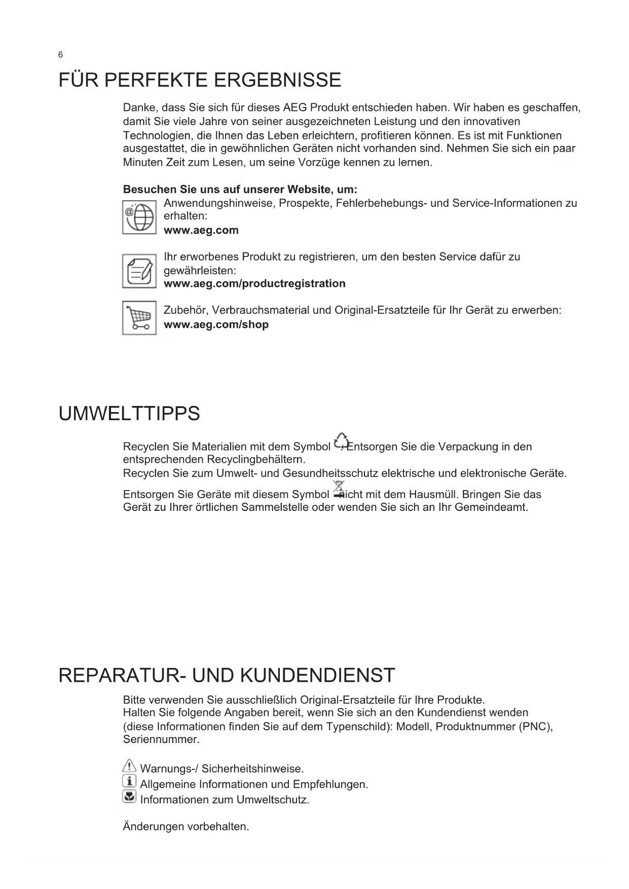 Danke, dass Sie sich für dieses AEG Produkt entschieden haben. Wir haben es geschaffen, damit Sie viele Jahre von seiner ausgezeichneten Leistung und den innovativen Technologien, die Ihnen das Leben erleichtern, profi tieren können. Es ist mit Funktionen ausgestattet, die in gewöhnlichen Geräten nicht vorhanden sind. Nehmen Sie sich ein paar Minuten Zeit zum Lesen, um seine Vorzüge kennen zu lernen. Besuchen Sie uns auf unserer Website, um: Anwendungshinweise, Prospekte, Fehlerbehebungs- und Service-Informationen zu erhalten: www.aeg.com Ihr erworbenes Produkt zu registrieren, um den besten Service dafür zu gewährleisten: www.aeg.com/productregistration Zubehör, Verbrauchsmaterial und Original-Ersatzteile für Ihr Gerät zu erwerben: www.aeg.com/shop UMWELTTIPPS Recyclen Sie Materialien mit dem Symbol . Entsorgen Sie die Verpackung in den entsprechenden Recyclingbehältern. Recyclen Sie zum Umwelt- und Gesundheitsschutz elektrische und elektronische Geräte. Entsorgen Sie Geräte mit diesem Symbol nicht mit dem Hausmüll. Bringen Sie das Gerät zu Ihrer örtlichen Sammelstelle oder wenden Sie sich an Ihr Gemeindeamt.