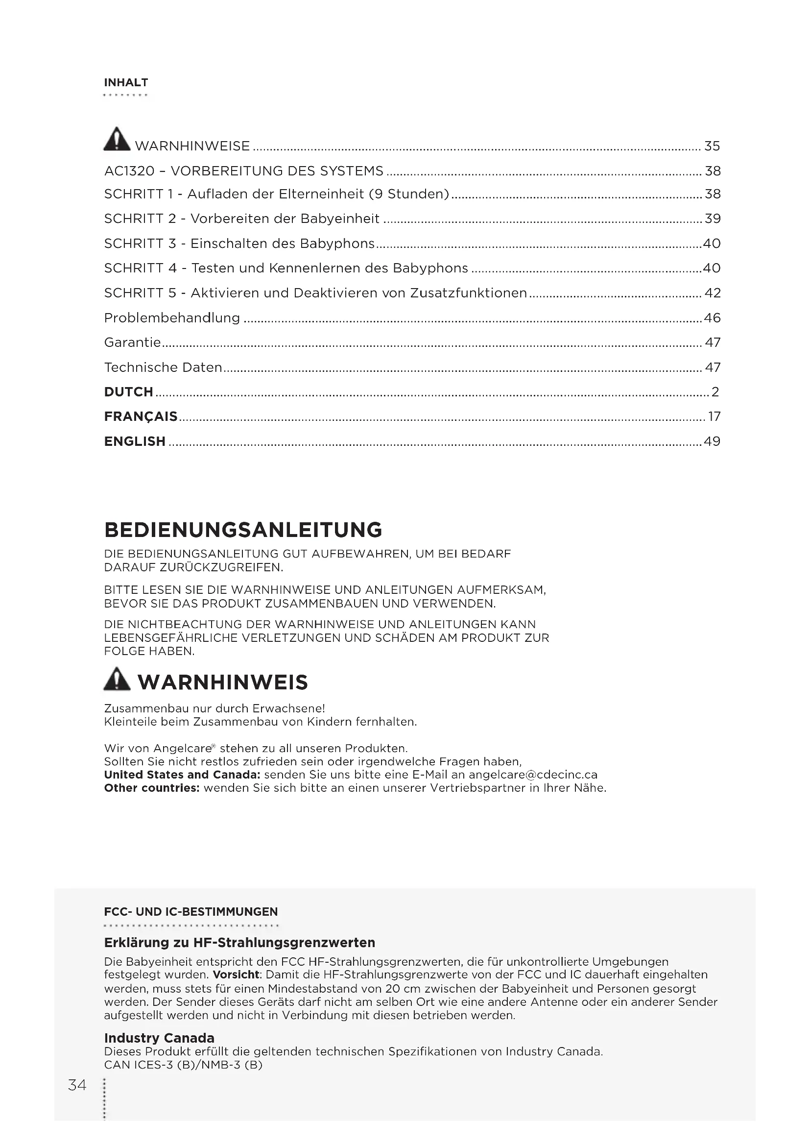 Finden Sie kostenlos die Bedienungsanleitung des Geräts AC1320 ANGELCARE als PDF.