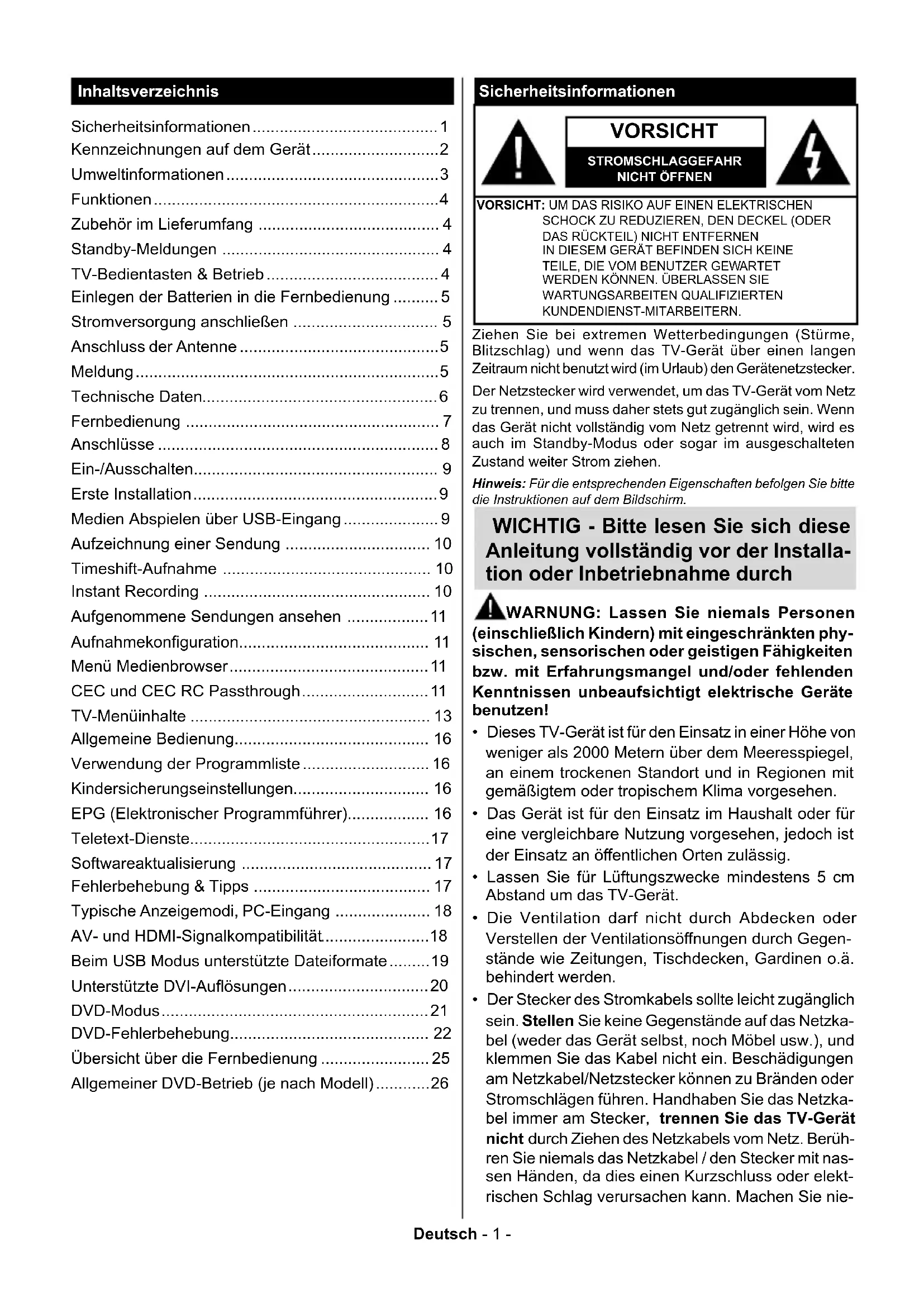 Sicherheitsinformationen VORSICHT STROMSCHLAGGEFAHRNICHT ÖFFNENVORSICHT: UM DAS RISIKO AUF EINEN ELEKTRISCHEN SCHOCK ZU REDUZIEREN, DEN DECKEL (ODER DAS RÜCKTEIL) NICHT ENTFERNEN IN DIESEM GERÄT BEFINDEN SICH KEINE TEILE, DIE VOM BENUTZER GEWARTET WERDEN KÖNNEN. ÜBERLASSEN SIE WARTUNGSARBEITEN QUALIFIZIERTEN KUNDENDIENST-MITARBEITERN. Hinweis: Für die entsprechenden Eigenschaften befolgen Sie bitte die Instruktionen auf dem Bildschirm. Ziehen Sie bei extremen Wetterbedingungen (Stürme, Blitzschlag) und wenn das TV-Gerät über einen langen Zeitraum nicht benutzt wird (im Urlaub) den Gerätenetzstecker. Der Netzstecker wird verwendet, um das TV-Gerät vom Netz zu trennen, und muss daher stets gut zugänglich sein. Wenn das Gerät nicht vollständig vom Netz getrennt wird, wird es auch im Standby-Modus oder sogar im ausgeschalteten Zustand weiter Strom ziehen. WICHTIG - Bitte lesen Sie sich diese Anleitung vollständig vor der Installa- tion oder Inbetriebnahme durch WARNUNG: Lassen Sie niemals Personen (einschließlich Kindern) mit eingeschränkten phy- sischen, sensorischen oder geistigen Fähigkeiten bzw. mit Erfahrungsmangel und/oder fehlenden Kenntnissen unbeaufsichtigt elektrische Geräte benutzen!