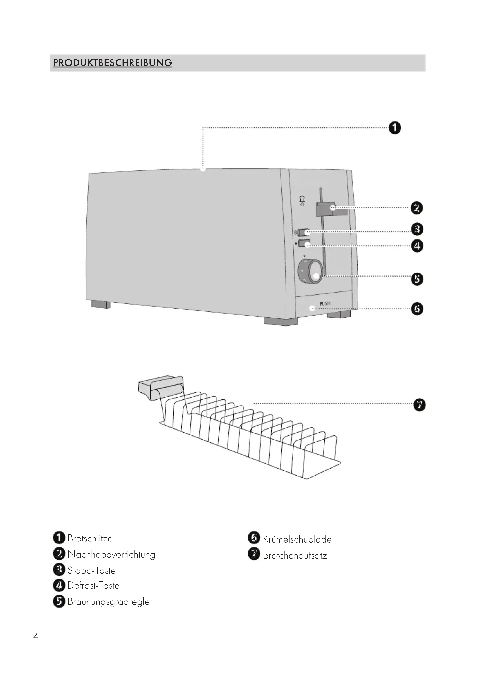 Um Brötchen aufzubacken, gehen Sie wie folgt vor: ● Setzen Sie den Brötchenaufsatz auf das Gerät. ● Legen Sie die Brötchen auf den Brötchenaufsatz. ● Stellen Sie den Bräungsgradregler auf das Brötchensymbol. ● Drücken Sie die Lift-Taste nach unten bis diese einrastet. ● Wenn die Lift-Taste wieder oben ist, wenden Sie einmal das Brötchen und wiederholen Sie den Vorgang. Der Brötchenaufsatz wird beim Toasten heiß. Fassen Sie diesen nur am Haltegriff an. REINIGUNG ● Reinigen Sie die Außenflächen des Gerätes mit einem weichen, angefeuchteten Tuch. Bei starker Verschmutzung kann ein mildes Reinigungsmittel verwendet werden. ● Herabgefallene Krümel sammeln sich in der Krümelschublade. ● Drücken Sie zur Entnahme der Krümelschublade die „Push“-Taste. ● Entnehmen Sie die Krümelschublade und entfernen Sie die Krümel. ● Setzen Sie die Krümelschublade wieder ein.