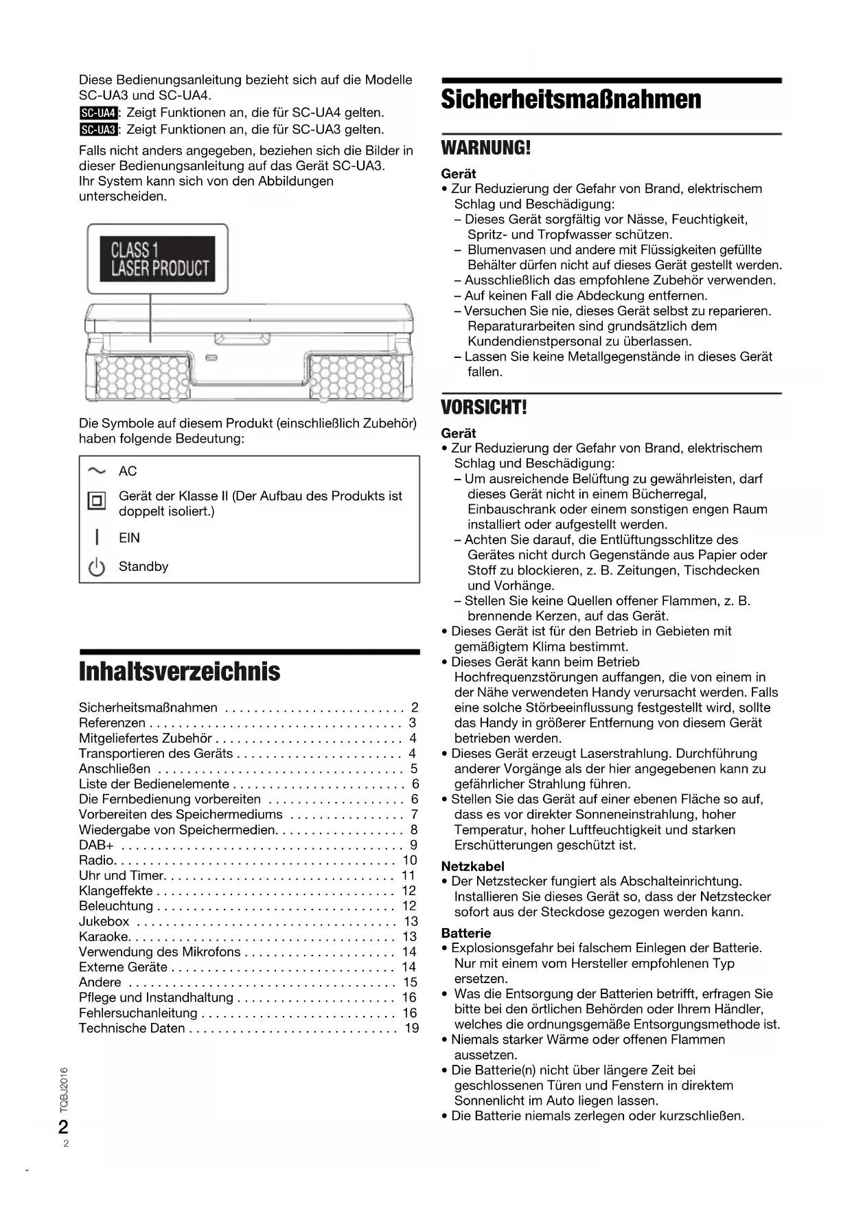 - Diese Bedienungsanleitung bezieht sich auf die Modelle SC-UA3 und SC-UA4. Falls nicht anders angegeben, beziehen sich die Bilder in dieser Bedienungsanleitung auf das Gerät SC-UA3. Ihr System kann sich von den Abbildungen unterscheiden. Die Symbole auf diesem Produkt (einschließlich Zubehör) haben folgende Bedeutung: Inhaltsverzeichnis Sicherheitsmaßnahmen p. 2