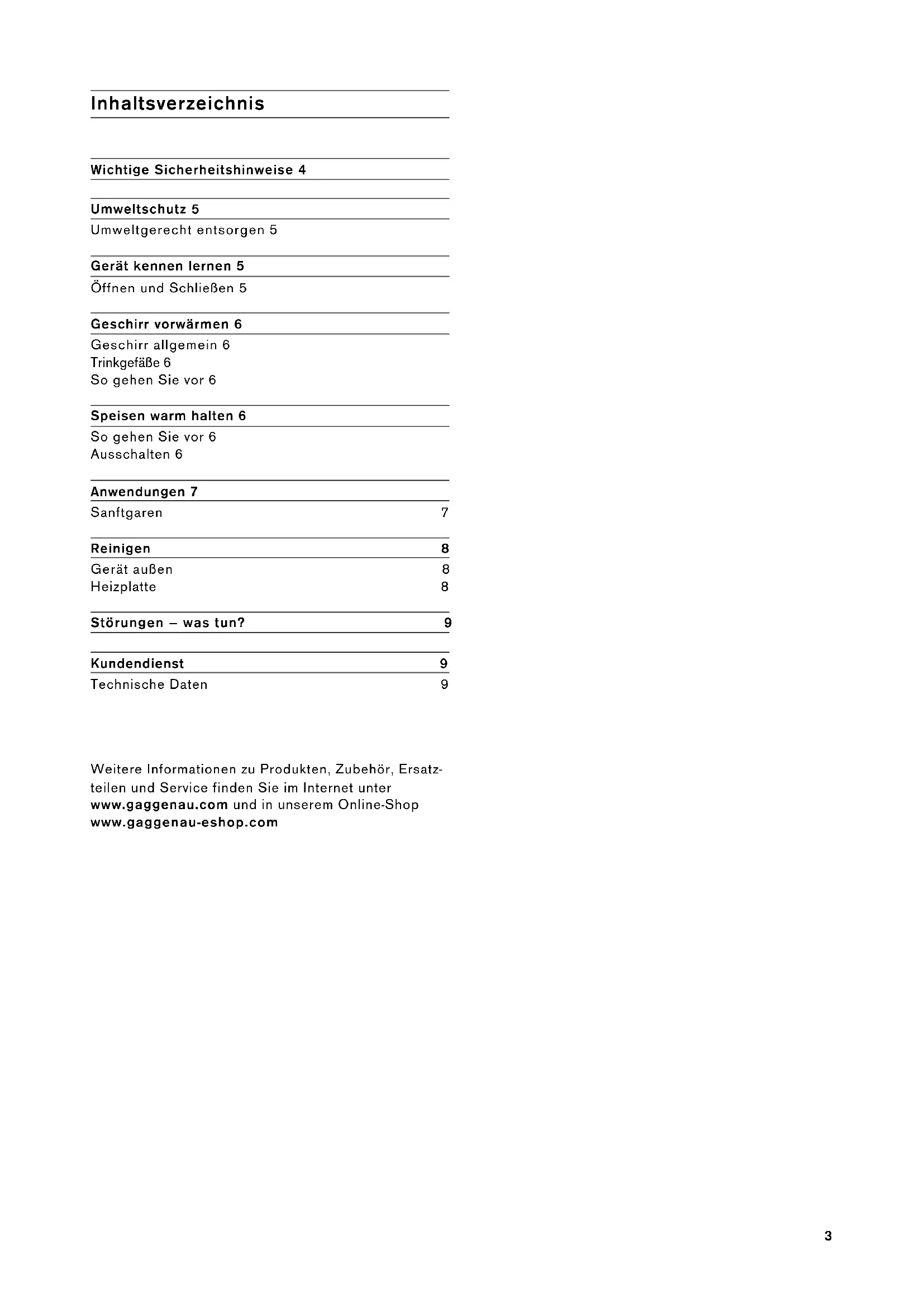 Gaggenau Gebrauchsanleitung Instruction manual Notice d'utilisation Istruzioni per l’uso Gebruiksaanwijzing Instrucciones de uso Instruções de serviço WSP 221/222 Wärmeschublade Warming drawer Tiroir chauffant Cassetto termico Warmhoudlade Cajón calientaplatos Gaveta de aquecimento2 Inhaltsverzeichnis 3 Table of contents 10 Table des matières 17 Indice 24 Inhoudsopgave 31 Índice 38 Índice 453 Inhaltsverzeichnis Gebrauchsanleitung Wichtige Sicherheitshinweise 4 Umweltschutz 5 Umweltgerecht entsorgen 5 Gerät kennen lernen 5 Öffnen und Schließen 5 Geschirr vorwärmen 6 Geschirr allgemein 6 Trinkgefäße 6 So gehen Sie vor 6 Speisen warm halten 6 So gehen Sie vor 6 Ausschalten 6 Anwendungen 7 Sanftgaren 7 Reinigen 8 Gerät außen 8 Heizplatte 8 Störungen – was tun? 9 Kundendienst 9 Technische Daten 9 Weitere Informationen zu Produkten, Zubehör, Ersatz- teilen und Service finden Sie im Internet unter www.gaggenau.com und in unserem Online-Shop www.gaggenau-eshop.com4 ã=Wichtige Sicherheitshinweise Diese Anleitung sorgfältig lesen. Nur dann können Sie Ihr Gerät sicher und richtig bedie- nen. Die Gebrauchs- und Montageanleitung für einen späteren Gebrauch oder für Nachbe- sitzer aufbewahren. Das Gerät nach dem Auspacken prüfen. Bei einem Transportschaden nicht anschließen. Dieses Gerät ist nur für den privaten Haushalt und das häusliche Umfeld bestimmt. Das Gerät ausschließlich zum Warmhalten von Speisen und zum Wärmen von Geschirr benut- zen. Dieses Gerät kann von Kindern ab 8 Jahren und Personen mit reduzierten physischen, sen- sorischen oder mentalen Fähigkeiten oder Mangel an Erfahrung oder Wissen benutzt werden, wenn sie von einer Person, die für ihre Sicherheit verantwortlich ist, beaufsichtigt oder von ihr bezüglich des sicheren Gebrauchs des Gerätes unterwiesen wurden und sie die daraus resultierenden Gefahren verstanden haben. Kinder dürfen nicht mit dem Gerät spielen. Reinigung und Benutzer-Wartung dürfen nicht durch Kinder durchgeführt werden, es sei denn, sie sind 8 Jahre und älter und werden beaufsichtigt. Kinder jünger als 8 Jahre vom Gerät und der Anschlussleitung fernhalten. Verbrennungsgefahr! ▯ Die Heizplatte in der Wärmeschublade wird sehr heiß. Nie die heiße Heizplatte berühren. Kinder fernhalten. Verbrennu ngsgefahr! ▯ Zubehör oder Geschirr wird sehr heiß. Hei- ßes Zubehör oder Geschirr immer mit Topflappen aus dem Garraum nehmen. Stromschlaggefahr! ▯ An heißen Geräteteilen kann die Kabeliso- lierung von Elektrogeräten schmelzen. Nie Anschlusskabel von Elektrogeräten mit hei- ßen Geräteteilen in Kontakt bringen. Stromschlaggefahr! ▯ Eindringende Feuchtigkeit kann einen Stromschlag verursachen. Keinen Hoch- druckreiniger oder Dampfreiniger verwen- den. Stromschlaggefahr! ▯ Ein defektes Gerät kann einen Strom- schlag verursachen. Nie ein defektes Gerät einschalten. Netzstecker ziehen oder Sicherung im Sicherungskasten aus- schalten. Kundendienst rufen. Stromschlaggefahr! ▯ Sprünge oder Brüche in der Glasplatte können Stromschläge verursachen. Siche- rung im Sicherungskasten ausschalten. Kundendienst rufen. Stromschlaggefahr! ▯ Unsachgemäße Reparaturen sind gefähr- lich. Nur ein von uns geschulter Kunden- dienst-Techniker darf Reparaturen durchführen. Ist das Gerät defekt, Netzste- cker ziehen oder Sicherung im Siche- rungskasten ausschalten. Kundendienst rufen. Brandgefahr! Die Heizplatte in der Wärmeschublade wird sehr heiß, brennbare Materialien können sich entzünden. Nie brennbare Gegenstände oder Kunststoff- behälter in der Wärmeschublade aufbewah- ren.5 Umweltschutz Umweltgerecht entsorgen Entsorgen Sie die Verpackung umweltgerecht. Gerät kennen lernen In der Wärmeschublade können Sie Geschirr vorwärmen oder Speisen warm halten. Das Gerät heizt nur, wenn die Schublade richtig geschlossen ist. Öffnen und Schließen Bei Geräten ohne Griff: Drücken Sie auf die Mitte der Schublade, um sie zu öffnen oder zu schließen. Beim Öffnen springt die Schublade leicht heraus. Sie kann danach problemlos herausgezogen werden. Dieses Gerät ist entsprechend der europäi- schen Richtlinie 2012/19/EU über Elektro- und Elektronikaltgeräte (waste electrical and electronic equipment - WEEE) gekennzeich- net. Die Richtlinie gibt den Rahmen für eine EU- weit gültige Rücknahme und Verwertung der Altgeräte vor. %HWULHEVDQ]HLJH :HQQ6LHHLQVFKDOWHQ