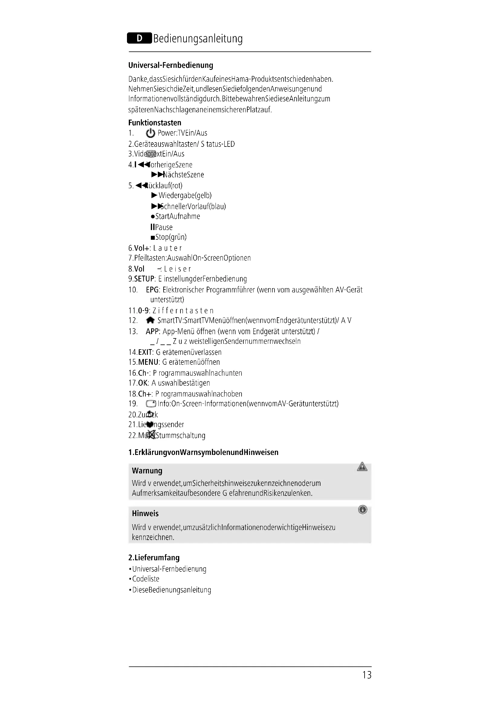 Hinweis zum Umweltschutz: Ab dem Zeitpunkt der Umsetzung der europäischen Richtlinien 2012/19/EU und 2006/66/EG in nationales Recht gilt folgendes: Elektrische und elektronische Geräte sowie Batterien dürfen nicht mit dem Hausmüll entsorgt werden. Der Verbraucher ist gesetzlich verpichtet, elektrische und elektronische Geräte sowie Batterien am Ende ihrer Lebensdauer an den dafür eingerichteten, öffentlichen Sammelstellen oder an die Verkaufsstelle zurückzugeben. Einzelheiten dazu regelt das jeweilige Landesrecht. Das Symbol auf dem Produkt, der Gebrauchsanleitung oder der Verpackung weist auf diese Bestimmungen hin. Mit der Wiederverwertung, der stoichen Verwertung oder anderen Formen der Verwertung von Altgeräten/ Batterien leisten Sie einen wichtigen Beitrag zum Schutz unserer Umwelt.2425 F Mode d’emploi Télécommande universelle Nous vous remercions d’avoir acheté un produit Hama. Veuillez prendreletemps de lirel’ensemble des instructions et des informations suivantes. Veuillez conserver ce manuel dans un endroit sûr pour pouvoir vous y référer ultérieurement. Touches de fonction