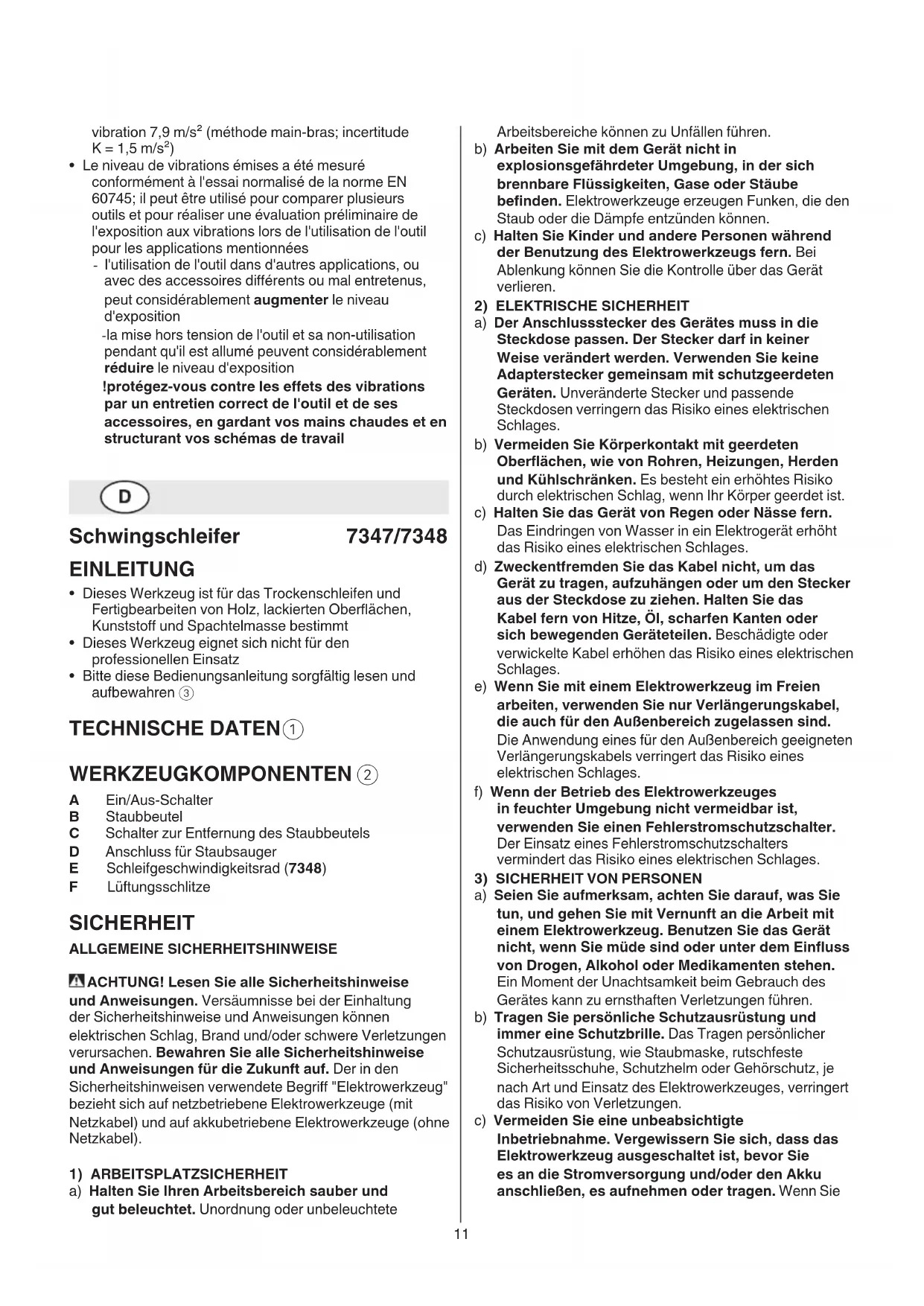 A Ein/Aus-Schalter B Staubbeutel C Schalter zur Entfernung des Staubbeutels D Anschluss für Staubsauger E Schleifgeschwindigkeitsrad (7348) F Lüftungsschlitze SICHERHEIT ALLGEMEINE SICHERHEITSHINWEISE ACHTUNG! Lesen Sie alle Sicherheitshinweise und Anweisungen. Versäumnisse bei der Einhaltung der Sicherheitshinweise und Anweisungen können elektrischen Schlag, Brand und/oder schwere Verletzungen verursachen. Bewahren Sie alle Sicherheitshinweise und Anweisungen für die Zukunft auf. Der in den Sicherheitshinweisen verwendete Begri "Elektrowerkzeug" bezieht sich auf netzbetriebene Elektrowerkzeuge (mit Netzkabel) und auf akkubetriebene Elektrowerkzeuge (ohne Netzkabel).