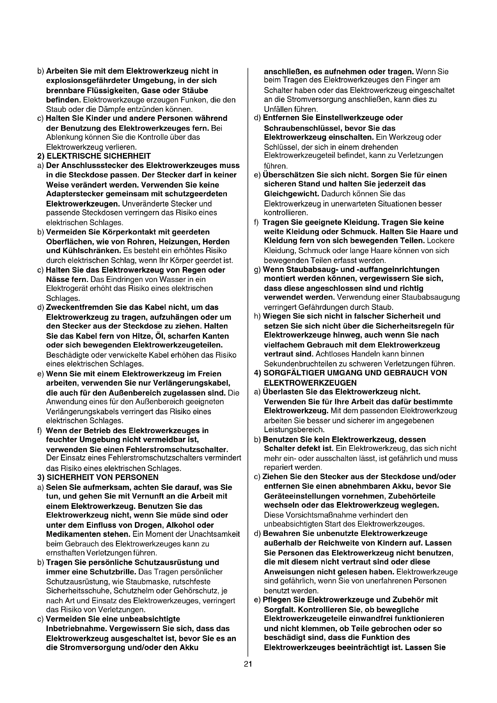 a) Halten Sie Ihren Arbeitsbereich sauber und gut beleuchtet. Unordnung oder unbeleuchtete Arbeitsbereiche können zu Unfällen führen.21 b) Arbeiten Sie mit dem Elektrowerkzeug nicht in explosionsgefährdeter Umgebung, in der sich brennbare Flüssigkeiten, Gase oder Stäube befinden. Elektrowerkzeuge erzeugen Funken, die den Staub oder die Dämpfe entzünden können. c) Halten Sie Kinder und andere Personen während der Benutzung des Elektrowerkzeuges fern. Bei Ablenkung können Sie die Kontrolle über das Elektrowerkzeug verlieren.