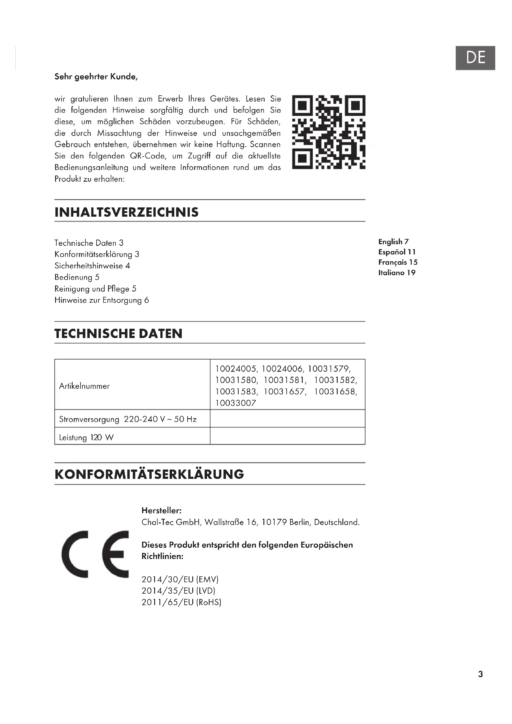 Hersteller: Chal-Tec GmbH, Wallstraße 16, 10179 Berlin, Deutschland. Dieses Produkt entspricht den folgenden Europäischen Richtlinien: 2014/30/EU (EMV) 2014/35/EU (LVD) 2011/65/EU (RoHS) English 7 Español 11 Français 15 Italiano 194