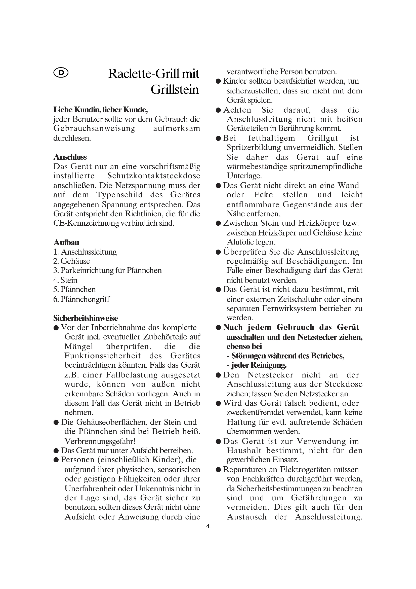 Sicherheitshinweise ● Vor der Inbetriebnahme das komplette Gerät incl. eventueller Zubehörteile auf Mängel überprüfen, die die Funktionssicherheit des Gerätes beeinträchtigen könnten. Falls das Gerät z.B. einer Fallbelastung ausgesetzt wurde, können von außen nicht erkennbare Schäden vorliegen. Auch in diesem Fall das Gerät nicht in Betrieb nehmen. ● Die Gehäuseoberflächen, der Stein und die Pfännchen sind bei Betrieb heiß. Verbrennungsgefahr! ● Das Gerät nur unter Aufsicht betreiben. ● Personen (einschließlich Kinder), die aufgrund ihrer physischen, sensorischen oder geistigen Fähigkeiten oder ihrer Unerfahrenheit oder Unkenntnis nicht in der Lage sind, das Gerät sicher zu benutzen, sollten dieses Gerät nicht ohne Aufsicht oder Anweisung durch eine verantwortliche Person benutzen. ● Kinder sollten beaufsichtigt werden, um sicherzustellen, dass sie nicht mit dem Gerät spielen. ● Achten Sie darauf, dass die Anschlussleitung nicht mit heißen Geräteteilen in Berührung kommt. ● Bei fetthaltigem Grillgut ist Spritzerbildung unvermeidlich. Stellen Sie daher das Gerät auf eine wärmebeständige spritzunempfindliche Unterlage. ● Das Gerät nicht direkt an eine Wand oder Ecke stellen und leicht entflammbare Gegenstände aus der Nähe entfernen. ● Zwischen Stein und Heizkörper bzw. zwischen Heizkörper und Gehäuse keine Alufolie legen. ● Überprüfen Sie die Anschlussleitung regelmäßig auf Beschädigungen. Im Falle einer Beschädigung darf das Gerät nicht benutzt werden. ● Das Gerät ist nicht dazu bestimmt, mit einer externen Zeitschaltuhr oder einem separaten Fernwirksystem betrieben zu werden. ● Nach jedem Gebrauch das Gerät ausschalten und den Netzstecker ziehen, ebenso bei - Störungen während des Betriebes, - jeder Reinigung. ● Den Netzstecker nicht an der Anschlussleitung aus der Steckdose ziehen; fassen Sie den Netzstecker an. ● Wird das Gerät falsch bedient, oder zweckentfremdet verwendet, kann keine Haftung für evtl. auftretende Schäden übernommen werden. ● Das Gerät ist zur Verwendung im Haushalt bestimmt, nicht für den gewerblichen Einsatz. ● Reparaturen an Elektrogeräten müssen von Fachkräften durchgeführt werden, da Sicherheitsbestimmungen zu beachten sind und um Gefährdungen zu vermeiden. Dies gilt auch für den Austausch der Anschlussleitung.