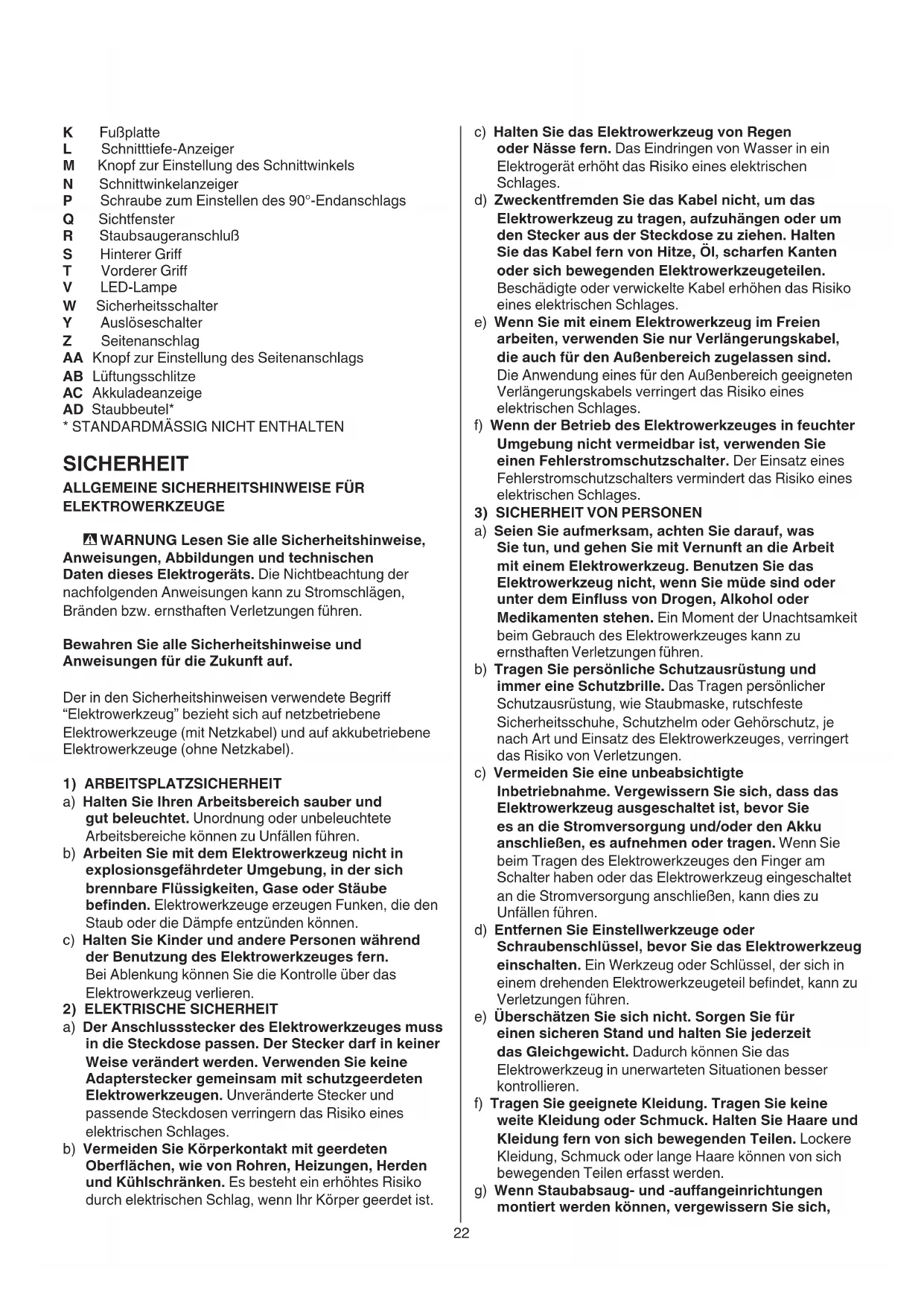 a) Seien Sie aufmerksam, achten Sie darauf, was Sie tun, und gehen Sie mit Vernunft an die Arbeit mit einem Elektrowerkzeug. Benutzen Sie das Elektrowerkzeug nicht, wenn Sie müde sind oder unter dem Einuss von Drogen, Alkohol oder Medikamenten stehen. Ein Moment der Unachtsamkeit beim Gebrauch des Elektrowerkzeuges kann zu ernsthaften Verletzungen führen. b) Tragen Sie persönliche Schutzausrüstung und immer eine Schutzbrille. Das Tragen persönlicher Schutzausrüstung, wie Staubmaske, rutschfeste Sicherheitsschuhe, Schutzhelm oder Gehörschutz, je nach Art und Einsatz des Elektrowerkzeuges, verringert das Risiko von Verletzungen. c) Vermeiden Sie eine unbeabsichtigte Inbetriebnahme. Vergewissern Sie sich, dass das Elektrowerkzeug ausgeschaltet ist, bevor Sie es an die Stromversorgung und/oder den Akku anschließen, es aufnehmen oder tragen. Wenn Sie beim Tragen des Elektrowerkzeuges den Finger am Schalter haben oder das Elektrowerkzeug eingeschaltet an die Stromversorgung anschließen, kann dies zu Unfällen führen. d) Entfernen Sie Einstellwerkzeuge oder Schraubenschlüssel, bevor Sie das Elektrowerkzeug einschalten. Ein Werkzeug oder Schlüssel, der sich in einem drehenden Elektrowerkzeugeteil bendet, kann zu Verletzungen führen. e) Überschätzen Sie sich nicht. Sorgen Sie für einen sicheren Stand und halten Sie jederzeit das Gleichgewicht. Dadurch können Sie das Elektrowerkzeug in unerwarteten Situationen besser kontrollieren. f) Tragen Sie geeignete Kleidung. Tragen Sie keine weite Kleidung oder Schmuck. Halten Sie Haare und Kleidung fern von sich bewegenden Teilen. Lockere Kleidung, Schmuck oder lange Haare können von sich bewegenden Teilen erfasst werden. g) Wenn Staubabsaug- und -auangeinrichtungen montiert werden können, vergewissern Sie sich, K Fußplatte L Schnitttiefe-Anzeiger M Knopf zur Einstellung des Schnittwinkels N Schnittwinkelanzeiger P Schraube zum Einstellen des 90°-Endanschlags Q Sichtfenster R Staubsaugeranschluß S Hinterer Gri T Vorderer Gri V LED-Lampe W Sicherheitsschalter Y Auslöseschalter Z Seitenanschlag AA Knopf zur Einstellung des Seitenanschlags AB Lüftungsschlitze AC Akkuladeanzeige AD Staubbeutel*