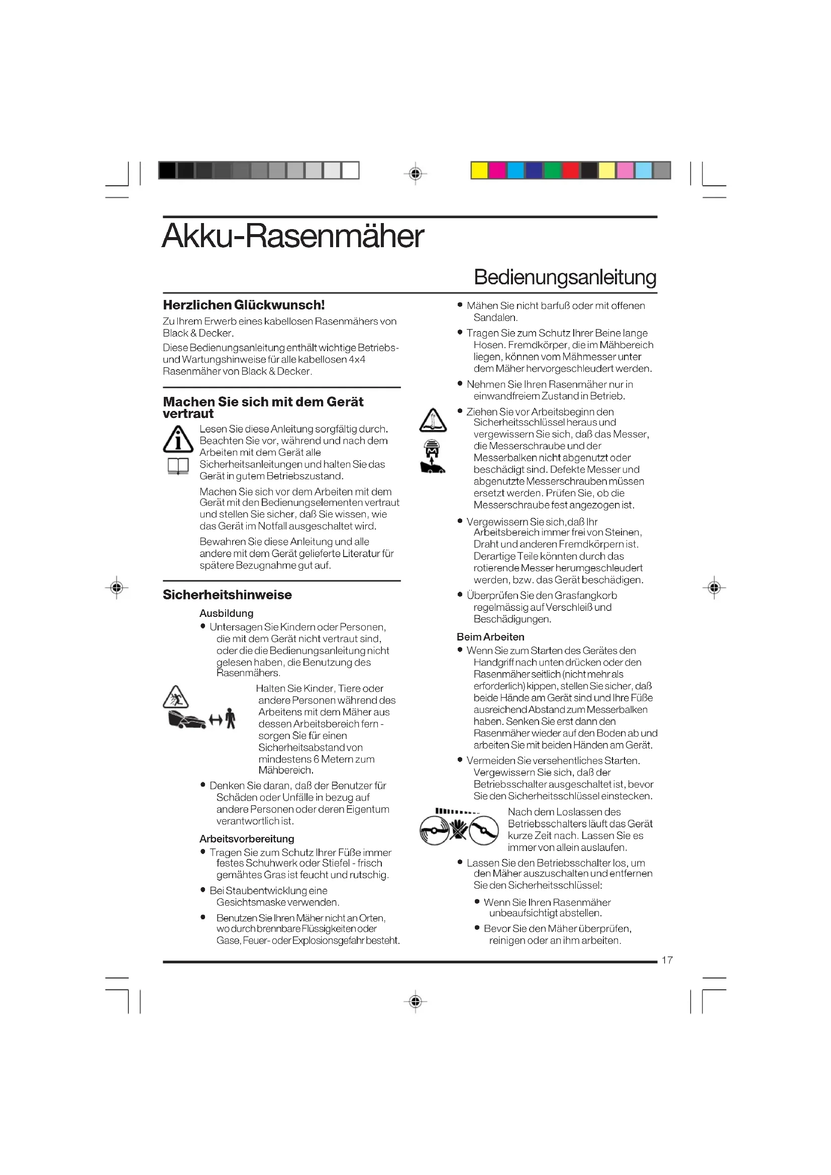 - Il prodotto non abbia subito tentativi di riparazione non effettuati da tecnici autorizzati né dall’assistenza Black & Decker. Per attivare la garanzia è necessario esibire la prova comprovante l’acquisto al venditore o al tecnico autorizzato. Per individuare il tecnico autorizzato più vicino, rivolgersi alla sede Black & Decker locale, presso il recapito indicato nel presente manuale. Altrimenti un elenco completo di tutti i tecnici autorizzati Black & Decker e i dettagli completi sui contatti e i servizi post-vendita sono disponibili su Internet presso: www.2helpU.com. Altri utensili di giardinaggio La Black & Decker ha una gamma completa di utensili per il giardinaggio che rende semplice la vita in giardino. Se desiderate ulteriori informazioni sui seguenti prodotti, vi preghiamo di contattare il nostro Centro D’Informazione e Manutenzione (vedere la pagina degli indirizzi alla fine di questo libretto d’istruzioni) od il vostro rivenditore Black & Decker Tosatori a lame o a catena Motoseghe Scope elettriche Tosasiepi a batteria Tagliasiepi a batteria Tosasiepi Tosaerba Rastrelli Sramatori Biotrituratori Non tutti i prodotti sono disponibili in tutti i paesi.17 Akku-Rasenmäher Bedienungsanleitung Herzlichen Glückwunsch! Zu Ihrem Erwerb eines kabellosen Rasenmähers von Black & Decker. Diese Bedienungsanleitung enthält wichtige Betriebs- und Wartungshinweise für alle kabellosen 4x4 Rasenmäher von Black & Decker. Machen Sie sich mit dem Gerät vertraut Lesen Sie diese Anleitung sorgfältig durch. Beachten Sie vor, während und nach dem Arbeiten mit dem Gerät alle Sicherheitsanleitungen und halten Sie das Gerät in gutem Betriebszustand. Machen Sie sich vor dem Arbeiten mit dem Gerät mit den Bedienungselementen vertraut und stellen Sie sicher, daß Sie wissen, wie das Gerät im Notfall ausgeschaltet wird. Bewahren Sie diese Anleitung und alle andere mit dem Gerät gelieferte Literatur für spätere Bezugnahme gut auf. Sicherheitshinweise Ausbildung