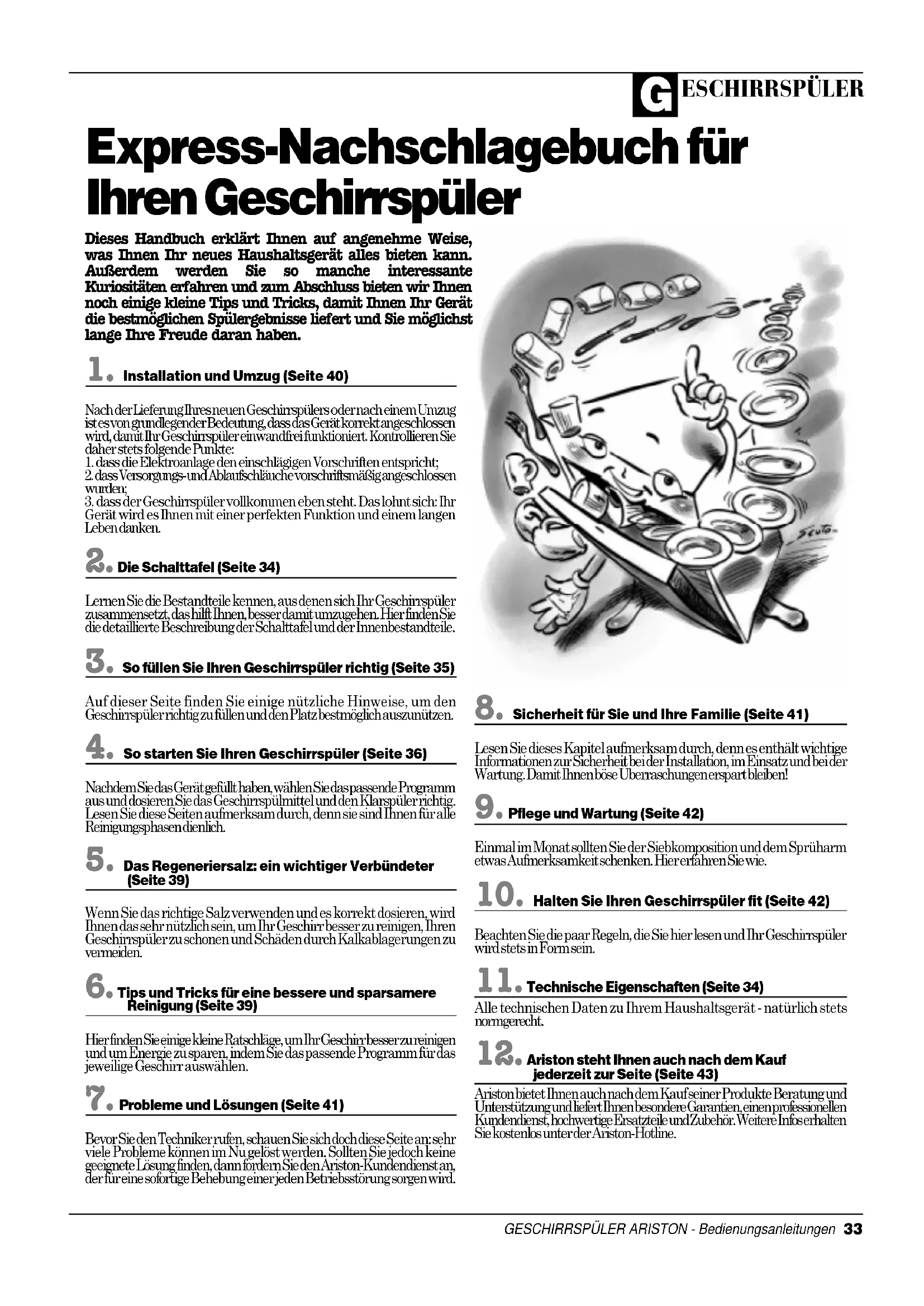Dieses Handbuch erklärt Ihnen auf angenehme Weise, was Ihnen Ihr neues Haushaltsgerät alles bieten kann. Außerdem werden Sie so manche interessante Kuriositäten erfahren und zum Abschluss bieten wir Ihnen noch einige kleine Tips und Tricks, damit Ihnen Ihr Gerät die bestmöglichen Spülergebnisse liefert und Sie möglichst lange Ihre Freude daran haben. Express-Nachschlagebuch für Ihren Geschirrspüler