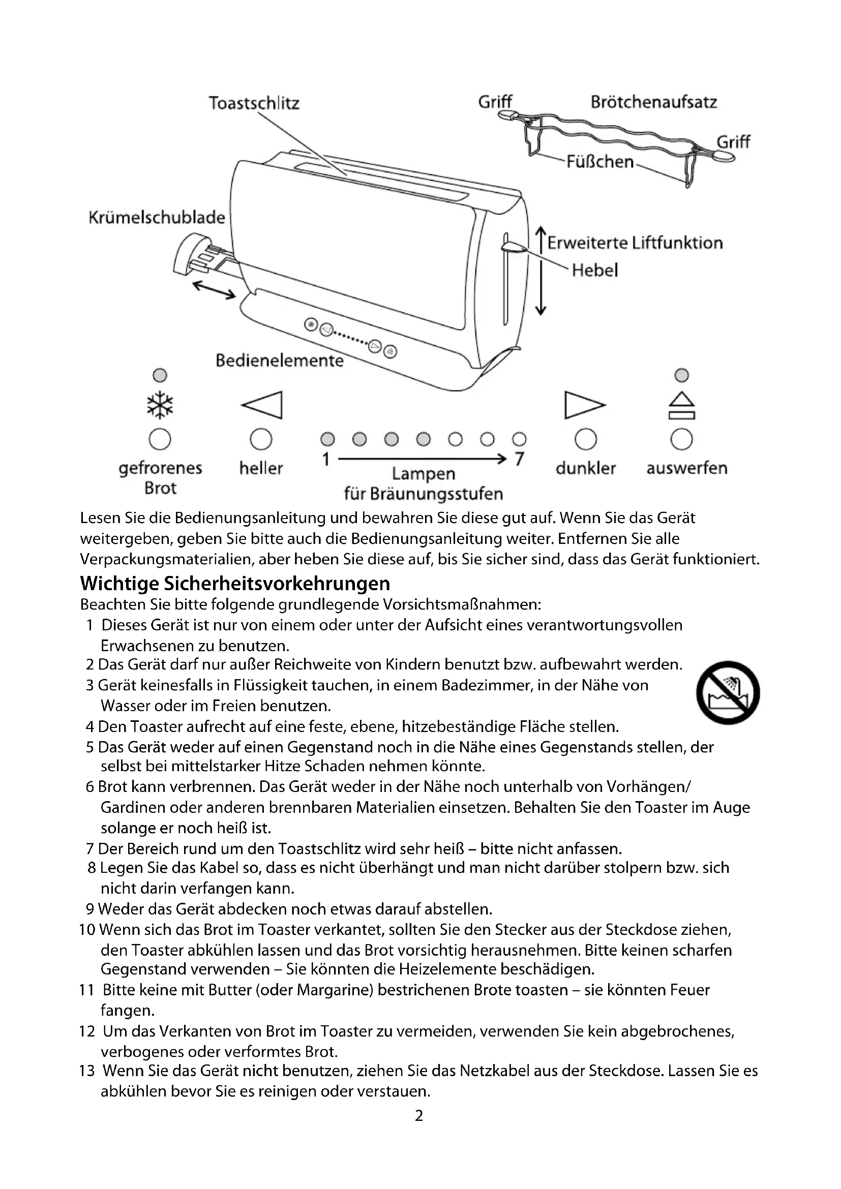 - Dabei kann ein leichter Geruch entstehen – dies ist kein Grund zur Sorge. Achten Sie darauf, dass der Raum gut gelüftet ist. Brot toasten 1 Den Toaster aufrecht auf eine feste, ebene, hitzebeständige Fläche stellen. 2 Das Gerät weder auf einen Gegenstand noch in die Nähe eines Gegenstands stellen, der selbst bei mittelstarker Hitze Schaden nehmen könnte. 3 Brot kann verbrennen. Das Gerät weder in der Nähe noch unterhalb von Vorhängen/Gardinen oder anderen brennbaren Materialien einsetzen. Behalten Sie den Toaster im Auge solange er noch heiß ist. 4 Gerätenetzstecker in die Steckdose stecken. 5 Das Gerät wird zuerst einen Selbst-Check vollziehen. 6 Die vier linken Bräunungsstufenlampen leuchten auf. 7 Die zu beiden Seiten der Lampen für die Bräunungsstufen befindlichen Tasten betätigen, um den Toast heller % oder dunkler & zu toasten. 8 Die Lampen für die Bräunungsstufen leuchten auf/erlöschen und zeigen so die gewählte Stufe an. 9 Je mehr Lampen aufleuchten, desto dunkler wird der Toast. 10 Legen Sie das Brot in den Toastschlitz (es darf höchstens 28 mm dick sein). 11 Den Hebel bis zum Anschlag nach unten drücken. , Der Hebel bleibt nur unten, wenn der Toaster an den Strom angeschlossen ist. 12 Die Lampen für die Bräunungsstufen werden heruntergezählt: a) Die Lampe auf der äußersten rechten Seite wird blinken, die Lampen links davon werden erleuchtet sein. b) Die Lampe auf der äußersten rechten Seite wird ausgehen und die Lampe links davon wird blinken. c) So werden die Lampen eine nach der anderen heruntergezählt, bis alle erloschen sind. d) Wenn alle Lampen erloschen sind, wird Ihr Toast fertig sein. Bedienungsanleitung4 Auswerfen $ 13 Um den Toaster während des Toastens zu unterbrechen, berühren Sie $. 14 Das $ Licht wird erleuchten, der Toast wird herausspringen und danach wird das $ Licht erlöschen. Erweiterte Liftfunktion 15 Wenn Sie kleineres Brot toasten (Bagel, etc.) kann der Hebel etwas weiter angehoben werden, damit Sie das Brot leichter entnehmen können. Gefrorenes Brot f 16 Belassen Sie die Bräunungsstufe auf Ihrer favorisierten Einstellung, geben Sie das gefrorene Brot in den Toaster, drücken Sie den Hebel herunter und berühren dann f. 17 Die Lampe f leuchtet auf und die Toastzeit wird automatisch angepasst, so dass Sie die gleiche Bräunung wie bei ungefrorenem Brot erzielen. Brötchenaufsatz , Verwenden Sie den Brötchenaufsatz nur auf Bräunungsstufe 1. 18 Mit dem Brötchenaufsatz keine gefrorenen, mit Butter bestrichenen, belegten, glasierten oder gefüllten Brötchen wärmen. 19 Stellen Sie den Brötchenaufsatz auf den Toaster und achten Sie darauf, dass die Füßchen im Toastschlitz sitzen. 20 Legen Sie die Brötchen auf den Brötchenaufsatz. 21 Stellen Sie den Bräunungsgrad auf 1 (nur ein Lämpchen leuchtet auf) und drücken Sie den Hebel nach unten. 22 Wenn der Hebel hochspringt, können Sie die warmen Brötchen abnehmen. 23 Fassen Sie das Drahtgestell des Brötchenaufsatzes bitte nicht an – es wird heiß. 24 Entfernen Sie den Brötchenaufsatz vor dem gewöhnlichen Gebrauch des Toasters. Toast aufwärmen 25 Verwenden Sie die niedrigste Einstellung. Nur einfaches, unbestrichenes Toastbrot aufwärmen. Hinweise und Tipps 26 Wenn mehr als eine Scheibe Brot getoastet werden soll, sollten Sie Brot verwenden, das gleich groß, gleich dick und gleich frisch ist. 27 Altbackenes Brot (also Brot von gestern) enthält weniger Feuchtigkeit und wird dadurch beim Toasten knuspriger. 28 Altes oder dünnes Brot braucht beim Toasten weniger Zeit als frisches oder dickes Brot. Verwenden Sie also eine niedrigere Stufe. 29 Süße Brotsorten (Heißwecken, Rosinenbrot usw.) werden wesentlich schneller braun als herkömmliches Brot. Man sollte deshalb für diese Brotsorten eine Einstellung mit hellerer Bräunung verwenden. Pflege und Instandhaltung 30 Ziehen Sie das Netzkabel aus der Steckdose und lassen Sie das Gerät abkühlen. 31 Das Gehäuse von außen mit einem feuchten Tuch abwischen. 32 Entnehmen und leeren Sie die Krümelschublade. Reinigen Sie diese mit einem feuchten Tuch um Sie anschließend wieder in den Toaster zu geben. 33 Den Toaster nur benutzen, wenn die Krümelschublade eingesetzt und geschlossen ist. 34 Tauchen Sie das Gerät keinesfalls in Wasser oder in eine andere Flüssigkeit ein. 35 Keine ätzenden oder scheuernden Reinigungsmittel oder Lösungsmittel benutzen.5 Mülltonnen Symbol Um Umwelt- und Gesundheitsprobleme, hervorgerufen durch gefährliche Stoffe in elektrischen und elektronischen Waren, zu vermeiden, dürfen Geräte, die dieses Symbol tragen nicht mit dem normalen Hausmüll entsorgt werden, sondern müssen wiederaufbereitet, weiter genutzt oder recycled werden.6 Lisez le mode d’emploi et gardez-le en lieu sûr. Si vous donnez l’appareil à quelqu’un, donnez-lui également le mode d’emploi. Déballez l’appareil mais conservez l’emballage jusqu’à ce que vous soyez sûr que l’appareil fonctionne correctement. précautions importantes Prenez des précautions essentielles comme: 1 Cet appareil ne doit être utilisé que par ou sous la surveillance d’un adulte responsable. 2 Utilisez et rangez l’appareil hors de portée des enfants. 3 Ne plongez pas l’appareil dans un liquide, ne l’utilisez ni dans la salle de bain, ni près de l’eau, ni à l’extérieur. 4 Mettez le grille-pain droit sur une surface ferme, plate, et résistante à la chaleur. 5 Ne le mettez pas sur ou près d’un objet quelconque qui pourrait être endommagé, même par une chaleur modérée. 6 Le pain pourrait brûler. N’utilisez pas l’appareil près de ou sous des rideaux ou autres matériaux combustibles, et surveillez-le pendant qu’il est chaud. 7 La zone autour de la fente du grille-pain peut devenir très chaude – ne touchez pas ! 8 Veillez à ce que le cordon d’alimentation ne soit pas en surplomb et qu’on ne puisse pas trébucher dessus ou l’accrocher. 9 Ne recouvrez pas l’appareil et ne posez rien 