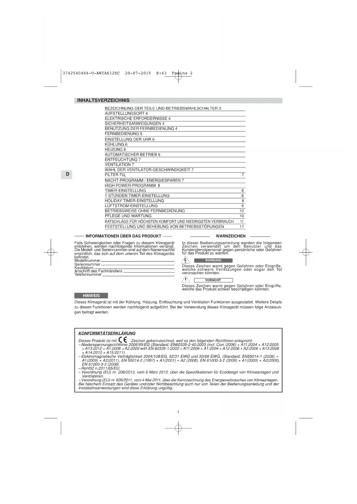 Dieses Produkt ist mit -Zeichen gekennzeichnet, weil es den folgenden Richtlinien entspricht: – Niederspannungsrichtilinie 2006/95/EG (Standard: EN60335-2-40:2003 (incl. Corr.:2006) + A11:2004 + A12:2005 + A13:2012 + A1:2006 + A2:2009 with EN 60335-1:2002 + A11:2004 + A1:2004 + A12:2006 + A2:2006 + A13:2008 + A14:2010 + A15:2011). – Elektromagnetische Verträglichkeit 2004/108/EG, 92/31 EWG und 93/68 EWG. (Standard: EN55014-1 (2006) + A1(2009) + A2(2011), EN 55014-2 (1997) + A1(2001) + A2 (2008), EN 61000-3-2 (2006) + A1(2009) + A2(2009), EN 61000-3-3 (2008) – RoHS2 n.2011/65/EU. – Verordnung (EU) nr. 206/2012, vom 6 März 2012, über die Spezifikationen für Ecodesign von Klimaanlagen und Ventilatoren. – Verordnung (EU) nr. 626/2011, vom 4 Mai 2011, über die Kennzeichnung des Energieverbrauches von Klimaanlagen. Bei falschem Einsatz des Gerätes und/oder Nichtbeachtung auch nur von Teilen der Bedienungsanleitung und der Installatinsanweisungen wird diese Erklärung ungültig. 3742540484-U-AWIAS12DC 20-07-2015 8:43 Pagina 2D