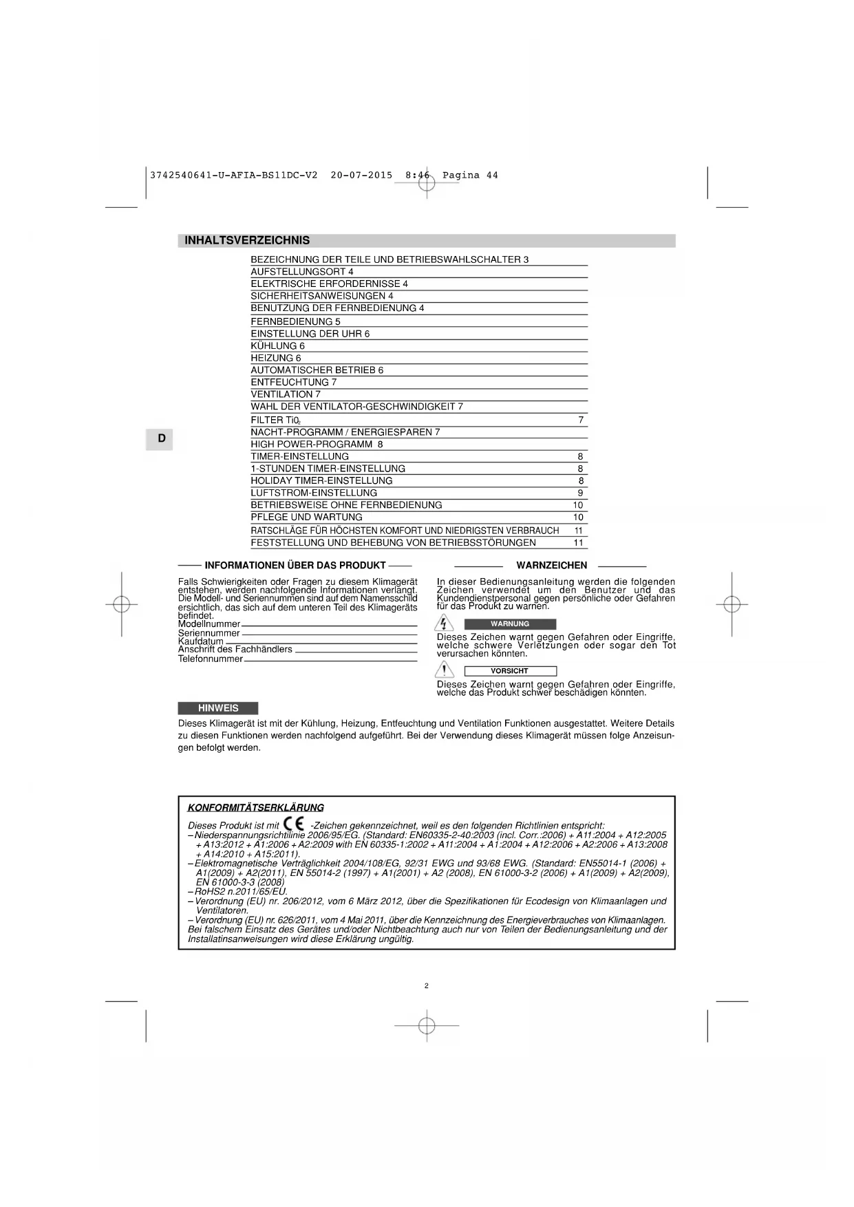 Dieses Produkt ist mit -Zeichen gekennzeichnet, weil es den folgenden Richtlinien entspricht: – Niederspannungsrichtilinie 2006/95/EG. (Standard: EN60335-2-40:2003 (incl. Corr.:2006) + A11:2004 + A12:2005 + A13:2012 + A1:2006 + A2:2009 with EN 60335-1:2002 + A11:2004 + A1:2004 + A12:2006 + A2:2006 + A13:2008 + A14:2010 + A15:2011). – Elektromagnetische Verträglichkeit 2004/108/EG, 92/31 EWG und 93/68 EWG. (Standard: EN55014-1 (2006) + A1(2009) + A2(2011), EN 55014-2 (1997) + A1(2001) + A2 (2008), EN 61000-3-2 (2006) + A1(2009) + A2(2009), EN 61000-3-3 (2008) – RoHS2 n.2011/65/EU. – Verordnung (EU) nr. 206/2012, vom 6 März 2012, über die Spezifikationen für Ecodesign von Klimaanlagen und Ventilatoren. – Verordnung (EU) nr. 626/2011, vom 4 Mai 2011, über die Kennzeichnung des Energieverbrauches von Klimaanlagen. Bei falschem Einsatz des Gerätes und/oder Nichtbeachtung auch nur von Teilen der Bedienungsanleitung und der Installatinsanweisungen wird diese Erklärung ungültig. 3742540641-U-AFIA-BS11DC-V2 20-07-2015 8:46 Pagina 44D