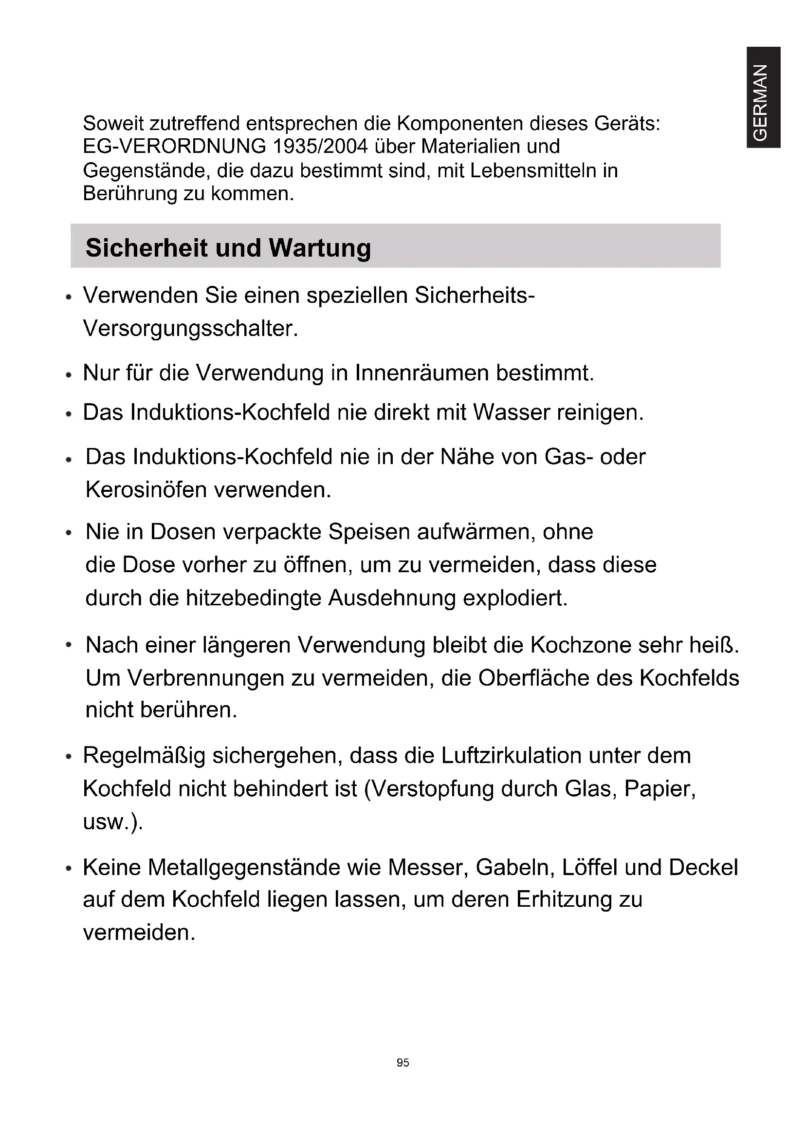 - Es besteht die Möglichkeit, durch Auswahl unterschiedlicher Leistungsbereiche ein maximales Leistungsaufnahmeniveau für das Induktionskochfeld einzustellen.Wechseln der Leistungsstufe Drücken Sie am Timer auf „+/-“. Es gibt 5 Leistungsstufen: von „P1“ bis „P5“. Eine davon wird auf der Timer-Anzeige angezeigt. „P1“ : die maximale Leistung beträgt 2,5 kW. „P2“ : die maximale Leistung beträgt 3,5 kW. Die Timer-Anzeige zeigt „P5“ für Leistungsstufe 5. Der Standardmodus beträgt 7,0 kW / 7,1 kW. „P3“ : die maximale Leistung beträgt 4,5 kW. „P4“ : die maximale Leistung beträgt 5,5 kW. „P5“ : die maximale Leistung beträgt 7,0 kW / 7,1 kW. ODER Bestätigen und Beenden der Power-Management-Funktion Drücken Sie zur Bestätigung gleichzeitig auf „+“ (Timer) und die Tastensperre. Das Kochfeld wird daraufhin ausgeschaltet. GERMAN 105Geeignete Kochbehälter Eisenpfanne zum Frittieren Kochtopf aus rostfreiem Stahl Flacher Eisenkochtopf Eisenpfanne Wasserkessel aus emailliertem rostfreiem Stahl Emaillierter Kochtopf Eisenplatte