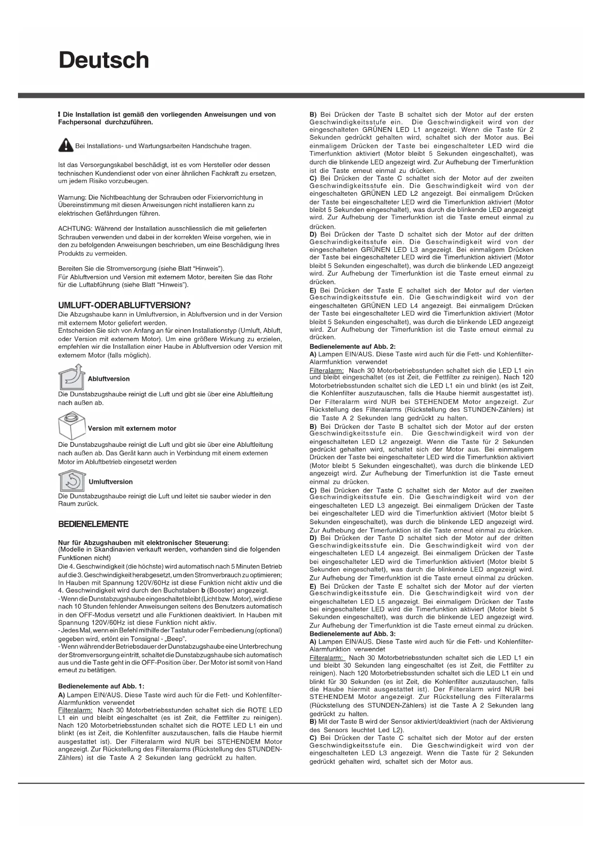 Bei Installations- und Wartungsarbeiten Handschuhe tragen. Ist das Versorgungskabel beschädigt, ist es vom Hersteller oder dessen technischen Kundendienst oder von einer ähnlichen Fachkraft zu ersetzen, um jedem Risiko vorzubeugen. Warnung: Die Nichtbeachtung der Schrauben oder Fixiervorrichtung in Übereinstimmung mit diesen Anweisungen nicht installieren kann zu elektrischen Gefährdungen führen. ACHTUNG: Während der Installation ausschliesslich die mit gelieferten Schrauben verwenden und dabei in der korrekten Weise vorgehen, wie in den zu befolgenden Anweisungen beschrieben, um eine Beschädigung Ihres Produkts zu vermeiden. Bereiten Sie die Stromversorgung (siehe Blatt “Hinweis”). Für Abluftversion und Version mit externem Motor, bereiten Sie das Rohr für die Luftabführung (siehe Blatt “Hinweis”). UMLUFT- ODER ABLUFTVERSION? Die Abzugshaube kann in Umluftversion, in Abluftversion und in der Version mit externem Motor geliefert werden. Entscheiden Sie sich von Anfang an für einen Installationstyp (Umluft, Abluft, oder Version mit externem Motor). Um eine größere Wirkung zu erzielen, empfehlen wir die Installation einer Haube in Abluftversion oder Version mit externem Motor (falls möglich). Abluftversion Die Dunstabzugshaube reinigt die Luft und gibt sie über eine Abluftleitung nach außen ab. Version mit externem motor Die Dunstabzugshaube reinigt die Luft und gibt sie über eine Abluftleitung nach außen ab. Das Gerät kann auch in Verbindung mit einem externen Motor im Abluftbetrieb eingesetzt werden Umluftversion Die Dunstabzugshaube reinigt die Luft und leitet sie sauber wieder in den Raum zurück. BEDIENELEMENTE Nur für Abzugshauben mit elektronischer Steuerung: (Modelle in Skandinavien verkauft werden, vorhanden sind die folgenden Funktionen nicht) Die 4. Geschwindigkeit (die höchste) wird automatisch nach 5 Minuten Betrieb auf die 3. Geschwindigkeit herabgesetzt, um den Stromverbrauch zu optimieren; In Hauben mit Spannung 120V/60Hz ist diese Funktion nicht aktiv und die