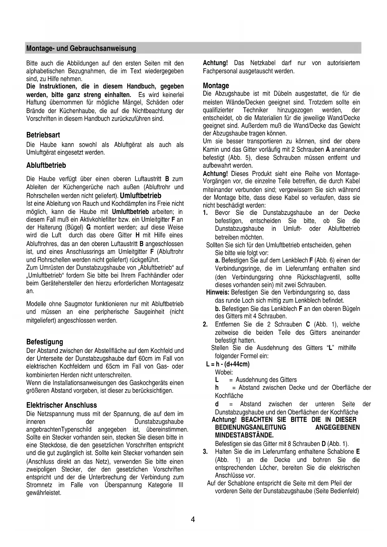 HHI 694 Montage- und Gebrauchsanweisung Instruction on mounting and use Prescriptions de montage et mode d’emploi Istruzioni di montaggio e d'uso Montaje y modo de empleo Instruções para montagem e utilização4 Montage- und Gebrauchsanweisung Bitte auch die Abbildungen auf den ersten Seiten mit den alphabetischen Bezugnahmen, die im Text wiedergegeben sind, zu Hilfe nehmen. Die Instruktionen, die in diesem Handbuch, gegeben werden, bitte ganz streng einhalten. Es wird keinerlei Haftung übernommen für mögliche Mängel, Schäden oder Brände der Küchenhaube, die auf die Nichtbeachtung der Vorschriften in diesem Handbuch zurückzuführen sind. Betriebsart Die Haube kann sowohl als Abluftgërat als auch als Umluftgërat eingesetzt werden. Abluftbetrieb Die Haube verfügt über einen oberen Luftaustritt B zum Ableiten der Küchengerüche nach außen (Abluftrohr und Rohrschellen werden nicht geliefert). Umluftbetrieb Ist eine Ableitung von Rauch und Kochdämpfen ins Freie nicht möglich, kann die Haube mit Umluftbetrieb arbeiten; in diesem Fall muß ein Aktivkohlefilter bzw. ein Umleitgitter F an der Halterung (Bügel) G montiert werden; auf diese Weise wird die Luft durch das obere Gitter H mit Hilfe eines Abluftrohres, das an den oberen Luftaustritt B angeschlossen ist, und eines Anschlussrings am Umleitgitter F (Abluftrohr und Rohrschellen werden nicht geliefert) rückgeführt. Zum Umrüsten der Dunstabzugshaube von „Abluftbetrieb“ auf „Umluftbetrieb“ fordern Sie bitte bei Ihrem Fachhändler oder beim Gerätehersteller den hierzu erforderlichen Montagesatz an. Modelle ohne Saugmotor funktionieren nur mit Abluftbetrieb und müssen an eine peripherische Saugeinheit (nicht mitgeliefert) angeschlossen werden. Befestigung Der Abstand zwischen der Abstellfläche auf dem Kochfeld und der Unterseite der Dunstabzugshaube darf 60cm im Fall von elektrischen Kochfeldern und 65cm im Fall von Gas- oder kombinierten Herden nicht unterschreiten. Wenn die Installationsanweisungen des Gaskochgeräts einen größeren Abstand vorgeben, ist dieser zu berücksichtigen. Elektrischer Anschluss Die Netzspannung muss mit der Spannung, die auf dem im inneren der Dunstabzugshaube angebrachtenTypenschild angegeben ist, übereinstimmen. Sollte ein Stecker vorhanden sein, stecken Sie diesen bitte in eine Steckdose, die den gesetzlichen Vorschriften entspricht und die gut zugänglich ist. Sollte kein Stecker vorhanden sein (Anschluss direkt an das Netz), verwenden Sie bitte einen zweipoligen Stecker, der den gesetzlichen Vorschriften entspricht und der die Unterbrechung der Verbindung zum Stromnetz im Falle von Überspannung Kategorie III gewährleistet. Achtung! Das Netzkabel darf nur von autorisiertem Fachpersonal ausgetauscht werden. Montage Die Abzugshaube ist mit Dübeln ausgestattet, die für die meisten Wände/Decken geeignet sind. Trotzdem sollte ein qualifizierter Techniker hinzugezogen werden, der entscheidet, ob die Materialien für die jeweilige Wand/Decke geeignet sind. Außerdem muß die Wand/Decke das Gewicht der Abzugshaube tragen können. Um sie besser transportieren zu können, sind der obere Kamin und das Gitter vorläufig mit 2 Schrauben A aneinander befestigt (Abb. 5), diese Schrauben müssen entfernt und aufbewahrt werden. Achtung! Dieses Produkt sieht eine Reihe von Montage- Vorgängen vor, die einzelne Teile betreffen, die durch Kabel miteinander verbunden sind; vergewissern Sie sich während der Montage bitte, dass diese Kabel so verlaufen, dass sie nicht beschädigt werden: