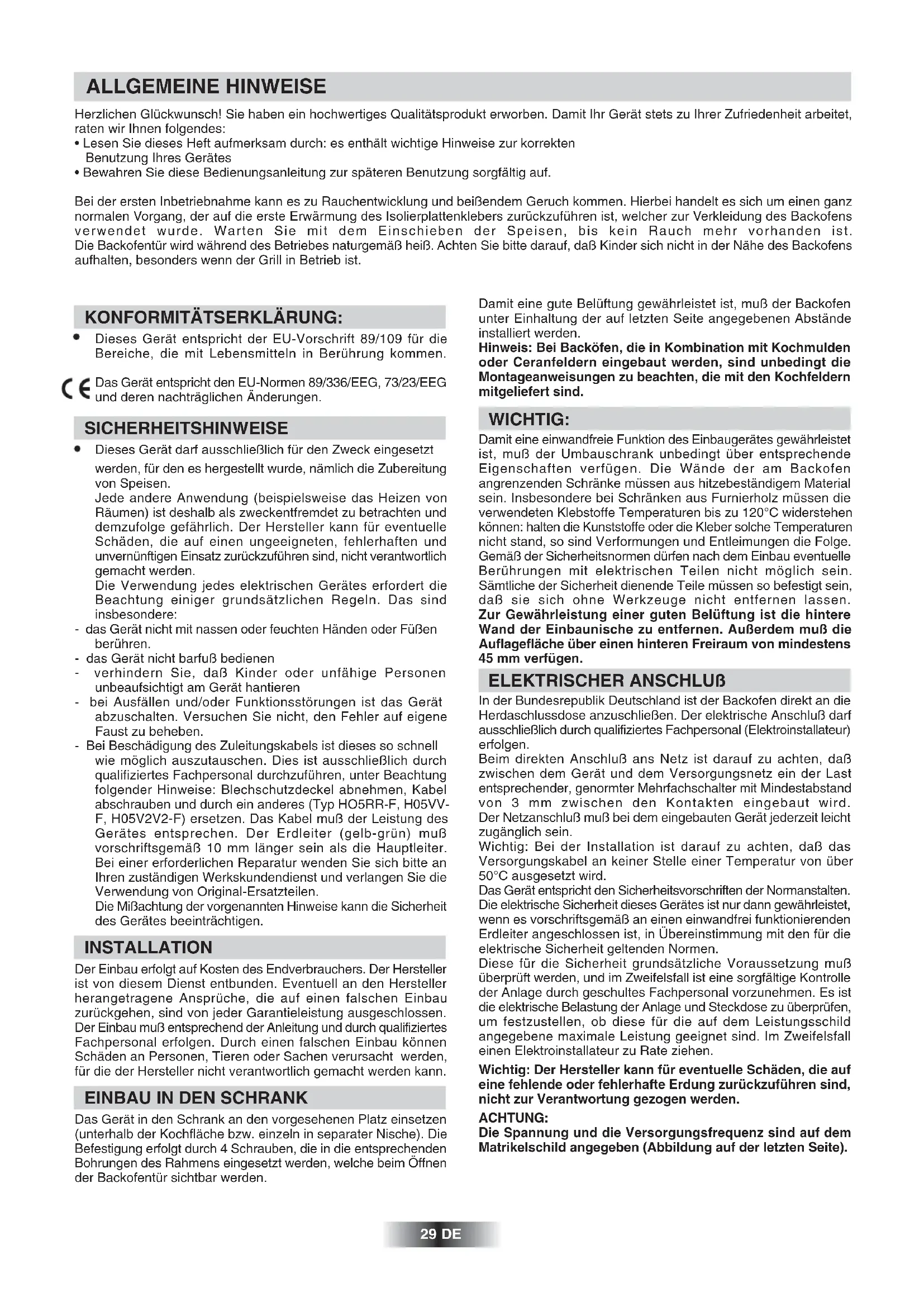 - Bewahren Sie diese Bedienungsanleitung zur späteren Benutzung sorgfältig auf. Bei der ersten Inbetriebnahme kann es zu Rauchentwicklung und beißendem Geruch kommen. Hierbei handelt es sich um einen ganz normalen Vorgang, der auf die erste Erwärmung des Isolierplattenklebers zurückzuführen ist, welcher zur Verkleidung des Backofens verwendet wurde. Warten Sie mit dem Einschieben der Speisen, bis kein Rauch mehr vorhanden ist. Die Backofentür wird während des Betriebes naturgemäß heiß. Achten Sie bitte darauf, daß Kinder sich nicht in der Nähe des Backofens aufhalten, besonders wenn der Grill in Betrieb ist. ALLGEMEINE HINWEISE KONFORMITÄTSERKLÄRUNG: Dieses Gerät entspricht der EU-Vorschrift 89/109 für die Bereiche, die mit Lebensmitteln in Berührung kommen. Das Gerät entspricht den EU-Normen 89/336/EEG, 73/23/EEG und deren nachträglichen Änderungen. SICHERHEITSHINWEISE Dieses Gerät darf ausschließlich für den Zweck eingesetzt werden, für den es hergestellt wurde, nämlich die Zubereitung von Speisen. Jede andere Anwendung (beispielsweise das Heizen von Räumen) ist deshalb als zweckentfremdet zu betrachten und demzufolge gefährlich. Der Hersteller kann für eventuelle Schäden, die auf einen ungeeigneten, fehlerhaften und unvernünftigen Einsatz zurückzuführen sind, nicht verantwortlich gemacht werden. Die Verwendung jedes elektrischen Gerätes erfordert die Beachtung einiger grundsätzlichen Regeln. Das sind insbesondere: - das Gerät nicht mit nassen oder feuchten Händen oder Füßen berühren. - das Gerät nicht barfuß bedienen - verhindern Sie, daß Kinder oder unfähige Personen unbeaufsichtigt am Gerät hantieren - bei Ausfällen und/oder Funktionsstörungen ist das Gerät abzuschalten. Versuchen Sie nicht, den Fehler auf eigene Faust zu beheben. - Bei Beschädigung des Zuleitungskabels ist dieses so schnell wie möglich auszutauschen. Dies ist ausschließlich durch qualifiziertes Fachpersonal durchzuführen, unter Beachtung folgender Hinweise: Blechschutzdeckel abnehmen, Kabel abschrauben und durch ein anderes (Typ HO5RR-F, H05VV- F, H05V2V2-F) ersetzen. Das Kabel muß der Leistung des Gerätes entsprechen. Der Erdleiter (gelb-grün) muß vorschriftsgemäß 10 mm länger sein als die Hauptleiter. Bei einer erforderlichen Reparatur wenden Sie sich bitte an Ihren zuständigen Werkskundendienst und verlangen Sie die Verwendung von Original-Ersatzteilen. Die Mißachtung der vorgenannten Hinweise kann die Sicherheit des Gerätes beeinträchtigen. INSTALLATION Der Einbau erfolgt auf Kosten des Endverbrauchers. Der Hersteller ist von diesem Dienst entbunden. Eventuell an den Hersteller herangetragene Ansprüche, die auf einen falschen Einbau zurückgehen, sind von jeder Garantieleistung ausgeschlossen. Der Einbau muß entsprechend der Anleitung und durch qualifiziertes Fachpersonal erfolgen. Durch einen falschen Einbau können Schäden an Personen, Tieren oder Sachen verursacht werden, für die der Hersteller nicht verantwortlich gemacht werden kann.