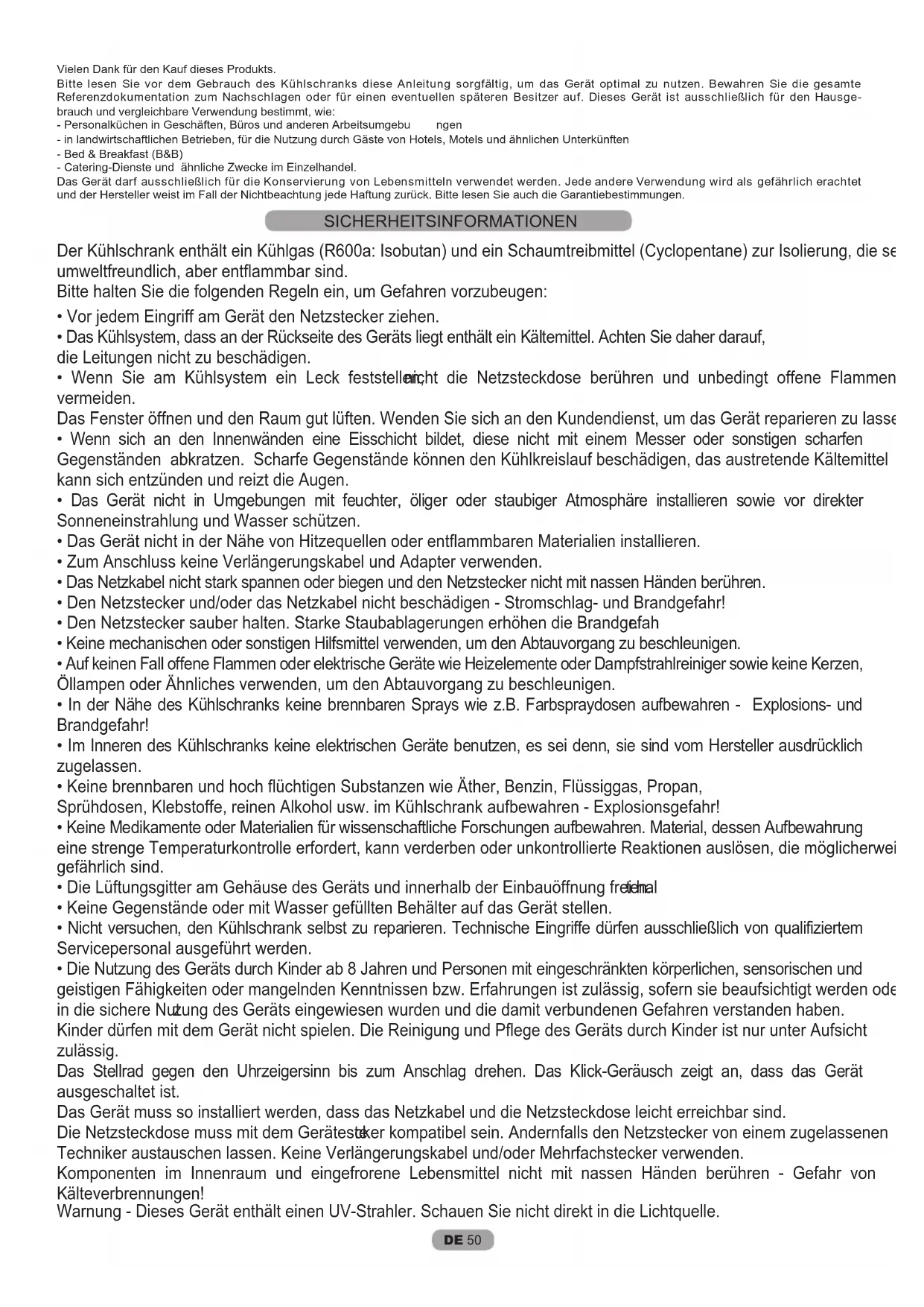Vielen Dank für den Kauf dieses Produkts. Bitte lesen Sie vor dem Gebrauch des Kühlschranks diese Anleitung sorgfältig, um das Gerät optimal zu nutzen. Bewahren Sie die gesamte Referenzdokumentation zum Nachschlagen oder für einen eventuellen späteren Besitzer auf. Dieses Gerät ist ausschließlich für den Hausge- brauch und vergleichbare Verwendung bestimmt, wie: - Personalküchen in Geschäften, Büros und anderen Arbeitsumgebu ngen - in landwirtschaftlichen Betrieben, für die Nutzung durch Gäste von Hotels, Motels und ähnlichen Unterkünften - Bed & Breakfast (B&B) - Catering-Dienste und ähnliche Zwecke im Einzelhandel. Das Gerät darf ausschließlich für die Konservierung von Lebensmitteln verwendet werden. Jede andere Verwendung wird als gefährlich erachtet und der Hersteller weist im Fall der Nichtbeachtung jede Haftung zurück. Bitte lesen Sie auch die Garantiebestimmungen. Der Kühlschrank enthält ein Kühlgas (R600a: Isobutan) und ein Schaumtreibmittel (Cyclopentane) zur Isolierung, die sehr umweltfreundlich, aber entflammbar sind. Bitte halten Sie die folgenden Regeln ein, um Gefahren vorzubeugen: