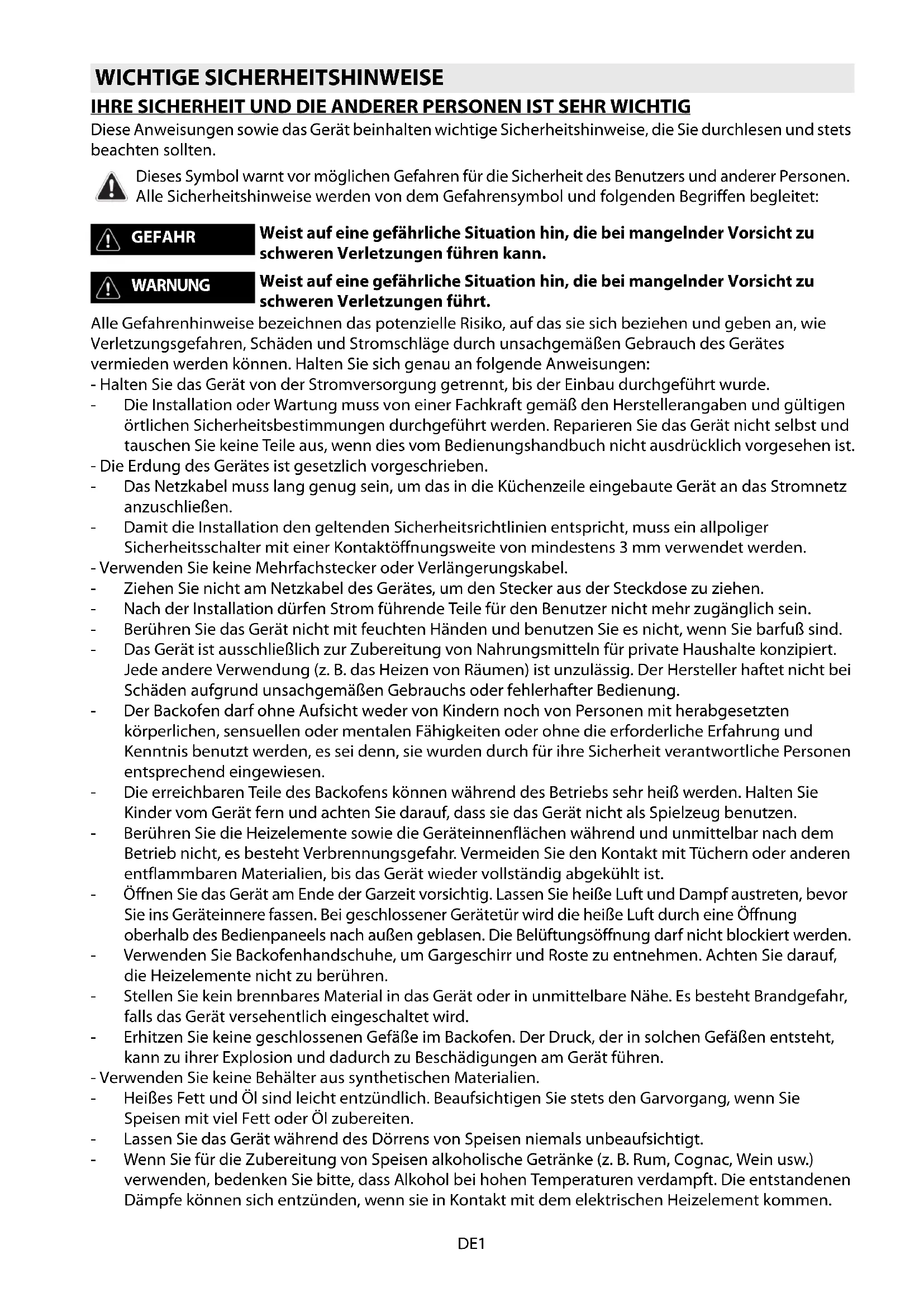 BLTM 9100/02DE1 IHRE SICHERHEIT UND DIE ANDERER PERSONEN IST SEHR WICHTIG Diese Anweisungen sowie das Gerät beinhalten wichtige Sicherheitshinweise, die Sie durchlesen und stets beachten sollten. Alle Gefahrenhinweise bezeichnen das potenzielle Risiko, auf das sie sich beziehen und geben an, wie Verletzungsgefahren, Schäden und Stromschläge durch unsachgemäßen Gebrauch des Gerätes vermieden werden können. Halten Sie sich genau an folgende Anweisungen: - Halten Sie das Gerät von der Stromversorgung getrennt, bis der Einbau durchgeführt wurde. - Die Installation oder Wartung muss von einer Fachkraft gemäß den Herstellerangaben und gültigen örtlichen Sicherheitsbestimmungen durchgeführt werden. Reparieren Sie das Gerät nicht selbst und tauschen Sie keine Teile aus, wenn dies vom Bedienungshandbuch nicht ausdrücklich vorgesehen ist. - Die Erdung des Gerätes ist gesetzlich vorgeschrieben. - Das Netzkabel muss lang genug sein, um das in die Küchenzeile eingebaute Gerät an das Stromnetz anzuschließen. - Damit die Installation den geltenden Sicherheitsrichtlinien entspricht, muss ein allpoliger Sicherheitsschalter mit einer Kontaktöffnungsweite von mindestens 3 mm verwendet werden. - Verwenden Sie keine Mehrfachstecker oder Verlängerungskabel. - Ziehen Sie nicht am Netzkabel des Gerätes, um den Stecker aus der Steckdose zu ziehen. - Nach der Installation dürfen Strom führende Teile für den Benutzer nicht mehr zugänglich sein. - Berühren Sie das Gerät nicht mit feuchten Händen und benutzen Sie es nicht, wenn Sie barfuß sind. - Das Gerät ist ausschließlich zur Zubereitung von Nahrungsmitteln für private Haushalte konzipiert. Jede andere Verwendung (z. B. das Heizen von Räumen) ist unzulässig. Der Hersteller haftet nicht bei Schäden aufgrund unsachgemäßen Gebrauchs oder fehlerhafter Bedienung. - Der Backofen darf ohne Aufsicht weder von Kindern noch von Personen mit herabgesetzten körperlichen, sensuellen oder mentalen Fähigkeiten oder ohne die erforderliche Erfahrung und Kenntnis benutzt werden, es sei denn, sie wurden durch für ihre Sicherheit verantwortliche Personen entsprechend eingewiesen. - Die erreichbaren Teile des Backofens können während des Betriebs sehr heiß werden. Halten Sie Kinder vom Gerät fern und achten Sie darauf, dass sie das Gerät nicht als Spielzeug benutzen. - Berühren Sie die Heizelemente sowie die Geräteinnenflächen während und unmittelbar nach dem Betrieb nicht, es besteht Verbrennungsgefahr. Vermeiden Sie den Kontakt mit Tüchern oder anderen entflammbaren Materialien, bis das Gerät wieder vollständig abgekühlt ist. - Öffnen Sie das Gerät am Ende der Garzeit vorsichtig. Lassen Sie heiße Luft und Dampf austreten, bevor Sie ins Geräteinnere fassen. Bei geschlossener Gerätetür wird die heiße Luft durch eine Öffnung oberhalb des Bedienpaneels nach außen geblasen. Die Belüftungsöffnung darf nicht blockiert werden. - Verwenden Sie Backofenhandschuhe, um Gargeschirr und Roste zu entnehmen. Achten Sie darauf, die Heizelemente nicht zu berühren. - Stellen Sie kein brennbares Material in das Gerät oder in unmittelbare Nähe. Es besteht Brandgefahr, falls das Gerät versehentlich eingeschaltet wird. - Erhitzen Sie keine geschlossenen Gefäße im Backofen. Der Druck, der in solchen Gefäßen entsteht, kann zu ihrer Explosion und dadurch zu Beschädigungen am Gerät führen. - Verwenden Sie keine Behälter aus synthetischen Materialien. - Heißes Fett und Öl sind leicht entzündlich. Beaufsichtigen Sie stets den Garvorgang, wenn Sie Speisen mit viel Fett oder Öl zubereiten. - Lassen Sie das Gerät während des Dörrens von Speisen niemals unbeaufsichtigt. - Wenn Sie für die Zubereitung von Speisen alkoholische Getränke (z. B. Rum, Cognac, Wein usw.) verwenden, bedenken Sie bitte, dass Alkohol bei hohen Temperaturen verdampft. Die entstandenen Dämpfe können sich entzünden, wenn sie in Kontakt mit dem elektrischen Heizelement kommen. WICHTIGE SICHERHEITSHINWEISE Dieses Symbol warnt vor möglichen Gefahren für die Sicherheit des Benutzers und anderer Personen. Alle Sicherheitshinweise werden von dem Gefahrensymbol und folgenden Begriffen begleitet: GEFAHR Weist auf eine gefährliche Situation hin, die bei mangelnder Vorsicht zu schweren Verletzungen führen kann. WARNUNG Weist auf eine gefährliche Situation hin, die bei mangelnder Vorsicht zu schweren Verletzungen führt.DE2 Entsorgung von Altgeräten - Dieses Gerät wurde aus recycelbaren oder wiederverwendbaren Werkstoffen hergestellt. Die Entsorgung muss gemäß den örtlichen Bestimmungen zur Abfallbeseitigung erfolgen. Machen Sie das Gerät vor der Verschrottung unbrauchbar, indem Sie das Netzkabel abschneiden. - Weitere Informationen zu Behandlung, Verwertung, und Wiederverwendung von Elektrogeräten können Sie bei der örtlichen Abfallbeseitigungsgesellschaft, der nächsten Sammelstelle für Haushaltsmll oder bei Ihrem Händler erfragen, bei dem das Gerät gekauft wurde. Prüfen Sie nach dem Auspacken, ob der Backofen etwaige Transportschäden aufweist und die Backofentür richtig schließt. Bei auftretenden Problemen wenden Sie sich bitte an Ihren Händler oder rufen die nächste Kundendienststelle an. Um eventuellen Schäden vorzubeugen, sollten Sie das Gerät erst unmittelbar vor der Installation von der Polystyrolunterlage nehmen.