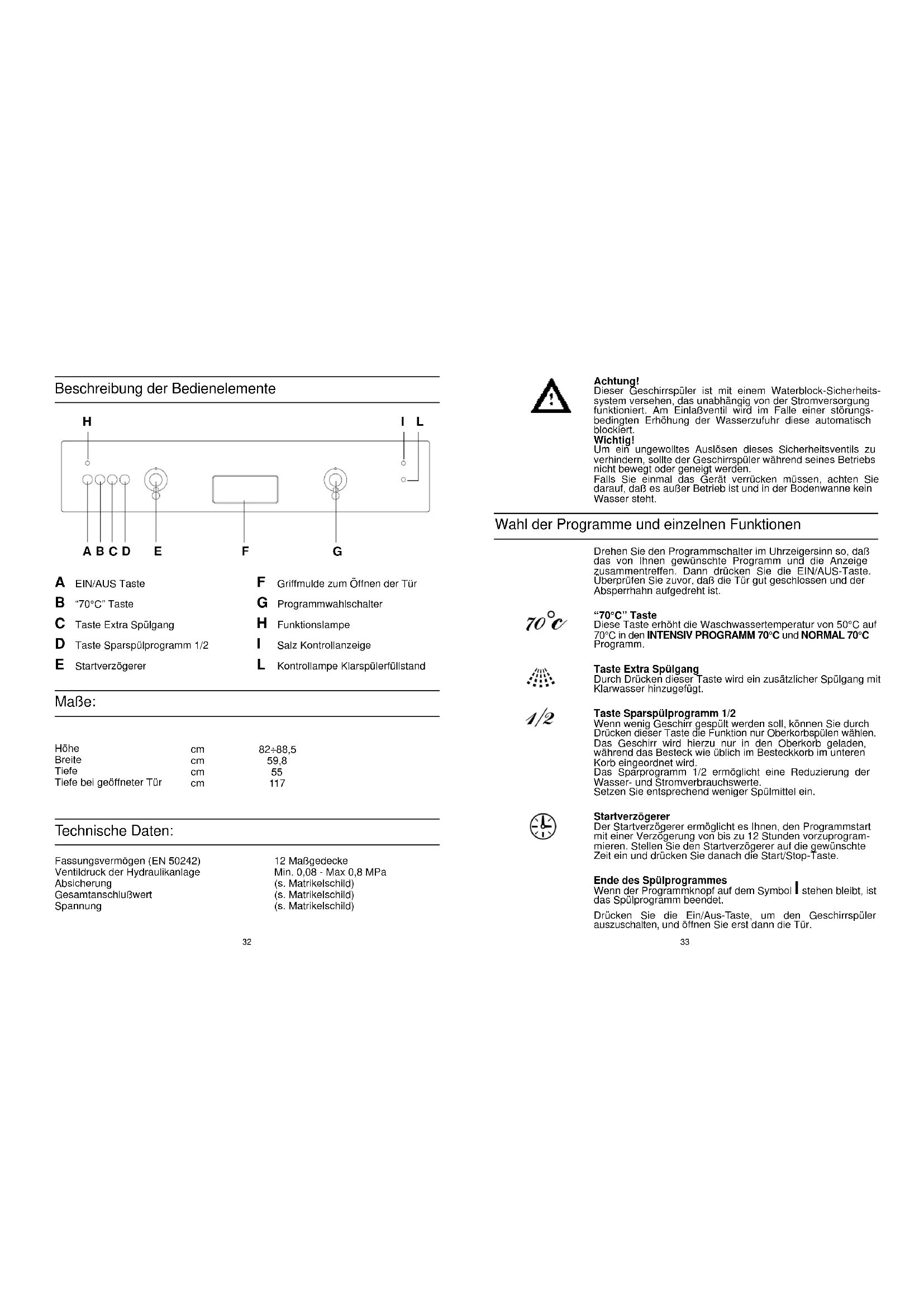 – 8 gr voor voorwas – 22 gr voor hoofdwas.33 Achtung! Dieser Geschirrspüler ist mit einem Waterblock-Sicherheits- system versehen, das unabhängig von der Stromversorgung funktioniert. Am Einlaßventil wird im Falle einer störungs- bedingten Erhöhung der Wasserzufuhr diese automatisch blockiert. Wichtig! Um ein ungewolltes Auslösen dieses Sicherheitsventils zu verhindern, sollte der Geschirrspüler während seines Betriebs nicht bewegt oder geneigt werden. Falls Sie einmal das Gerät verrücken müssen, achten Sie darauf, daß es außer Betrieb ist und in der Bodenwanne kein Wasser steht. Drehen Sie den Programmschalter im Uhrzeigersinn so, daß das von Ihnen gewünschte Programm und die Anzeige zusammentreffen. Dann drücken Sie die EIN/AUS-Taste. Überprüfen Sie zuvor, daß die Tür gut geschlossen und der Absperrhahn aufgedreht ist. “70°C” Taste Diese Taste erhöht die Waschwassertemperatur von 50°C auf 70°C in den INTENSIV PROGRAMM 70°C und NORMAL 70°C Programm. Taste Extra Spülgang Durch Drücken dieser Taste wird ein zusätzlicher Spülgang mit Klarwasser hinzugefügt. Taste Sparspülprogramm 1/2 Wenn wenig Geschirr gespült werden soll, können Sie durch Drücken dieser Taste die Funktion nur Oberkorbspülen wählen. Das Geschirr wird hierzu nur in den Oberkorb geladen, während das Besteck wie üblich im Besteckkorb im unteren Korb eingeordnet wird. Das Sparprogramm 1/2 ermöglicht eine Reduzierung der Wasser- und Stromverbrauchswerte. Setzen Sie entsprechend weniger Spülmittel ein. Startverzögerer Der Startverzögerer ermöglicht es Ihnen, den Programmstart mit einer Verzögerung von bis zu 12 Stunden vorzuprogram- mieren. Stellen Sie den Startverzögerer auf die gewünschte Zeit ein und drücken Sie danach die Start/Stop-Taste. Ende des Spülprogrammes Wenn der Programmknopf auf dem Symbol