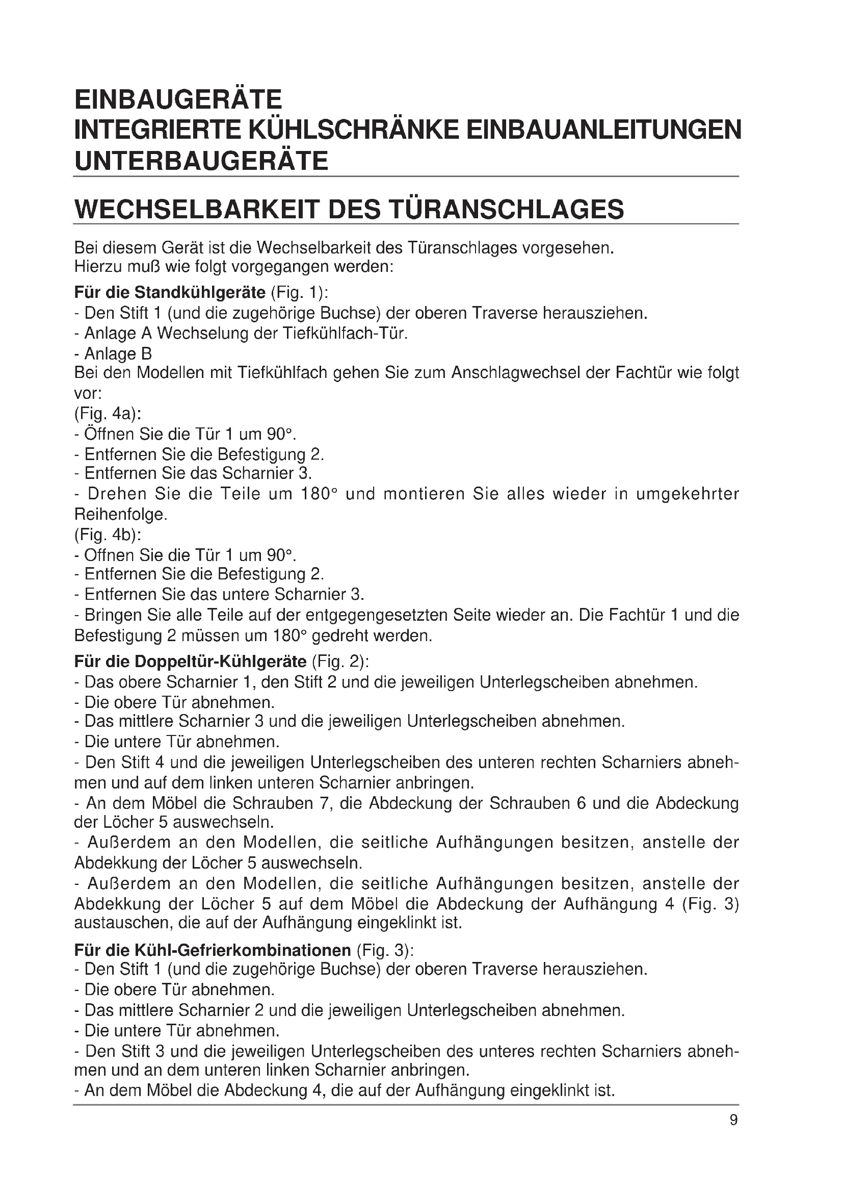 Bei diesem Gerät ist die Wechselbarkeit des Türanschlages vorgesehen. Hierzu muß wie folgt vorgegangen werden: Für die Standkühlgeräte (Fig. 1): - Den Stift 1 (und die zugehörige Buchse) der oberen Traverse herausziehen. - Anlage A Wechselung der Tiefkühlfach-Tür. - Anlage B Bei den Modellen mit Tiefkühlfach gehen Sie zum Anschlagwechsel der Fachtür wie folgt vor: (Fig. 4a): - Öffnen Sie die Tür 1 um 90°. - Entfernen Sie die Befestigung 2. - Entfernen Sie das Scharnier 3. - Drehen Sie die Teile um 180° und montieren Sie alles wieder in umgekehrter Reihenfolge. (Fig. 4b): - Offnen Sie die Tür 1 um 90°. - Entfernen Sie die Befestigung 2. - Entfernen Sie das untere Scharnier 3. - Bringen Sie alle Teile auf der entgegengesetzten Seite wieder an. Die Fachtür 1 und die Befestigung 2 müssen um 180° gedreht werden. Für die Doppeltür-Kühlgeräte (Fig. 2): - Das obere Scharnier 1, den Stift 2 und die jeweiligen Unterlegscheiben abnehmen. - Die obere Tür abnehmen. - Das mittlere Scharnier 3 und die jeweiligen Unterlegscheiben abnehmen. - Die untere Tür abnehmen. - Den Stift 4 und die jeweiligen Unterlegscheiben des unteren rechten Scharniers abneh- men und auf dem linken unteren Scharnier anbringen. - An dem Möbel die Schrauben 7, die Abdeckung der Schrauben 6 und die Abdeckung der Löcher 5 auswechseln. - Außerdem an den Modellen, die seitliche Aufhängungen besitzen, anstelle der Abdekkung der Löcher 5 auswechseln. - Außerdem an den Modellen, die seitliche Aufhängungen besitzen, anstelle der Abdekkung der Löcher 5 auf dem Möbel die Abdeckung der Aufhängung 4 (Fig. 3) austauschen, die auf der Aufhängung eingeklinkt ist. Für die Kühl-Gefrierkombinationen (Fig. 3): - Den Stift 1 (und die zugehörige Buchse) der oberen Traverse herausziehen. - Die obere Tür abnehmen. - Das mittlere Scharnier 2 und die jeweiligen Unterlegscheiben abnehmen. - Die untere Tür abnehmen. - Den Stift 3 und die jeweiligen Unterlegscheiben des unteres rechten Scharniers abneh- men und an dem unteren linken Scharnier anbringen. - An dem Möbel die Abdeckung 4, die auf der Aufhängung eingeklinkt ist. 9EINBAU DES GERÄTES IN EINEN SCHRANK Doppeltürige Kühlschränke, Kühl-Gefrierkombinationen und Schränke. Die Einbaunishe im Schrank muß die in fig. 14/15 angegebenen Abmessungen besitzen. Wechselbarer Türanschlag Bei diesem Gerät ist ein wechselbarer T¨üranschlag vorgesehen. Hierzu muß wie folgt vorgegangen werden: - Das obere Scharnier 1 und den Stift 2 Sowie die jeweiligen Unterlegscheiben abnehmen. - Die Tür abnehmen. - Den Stift 3 und die jeweiligen Unterlegscheiben vom unteren rechten Scharnier abneh- men und an dem linken unteren Scharnier wieder anbringen. - An dem Gehäuse die Schrauben 5 und die Abdeckungen der Schrauben 4 austauschen. - Aufhängung 2 abnehmen. - Das Scharnier 3 mit der Tür abnehmen. - Die drei Einzelteile um 180° drehen und das Ganze wieder anbringen, wobei in Gegenrichtung vorzugehen ist. Einbauanleitung des Gerätes - Die Dichtung 1, die dem Gerät beiliegt, auf der Scharniergegenseite (Fig. 5) anbringen. - Das Gerät in die Nische so einfüge, dass es die gegenüberliegende Schrankseite mit den Scharnieren berührt, wobei es soweit zurückgesetzt wird, bis der obere Winkel 1 mit dem Möbelanschlag 45 mm. beträgt (Fig. 6). - Das Gerät ab der Ober- und Unterseite mit den im Zubehör beutel enthaltenen Schrauben befestigen und das entsprechende Gitter einsetzen (Fig. 7). Außerdel bei dem Modellen, die eine seitliche Aufhängung haben, wie folgt vorgehen (Fig. 8): - Seite mittleres Scharnier: Die Befestigungsschrauben des Scharniers 1 lockern und die Aufhängung 3 dem Schrank nähern. - Gegenseite zum mittleren Scharnier: Abdeckung 2 abnehmen und die Aufhängung dem Schrank nähern. - Die Aufhängung mit den mitgelieferten Schrauben am Schrank befestigen und die vorher gelockerten Schrauben anziehen. - Die Abdeckungen wieder anbringen. VERBINDUNG VON SCHRANKTÜR UND GERÄT Das Gerät besitzt Vorrichtungen für die Verbindung der Türen mit den Schranktüren (Ziehschienen). Für die Anbringung dieser Schiene wie folgt vorgehen: - (Fig. 9) Die Gleitschiene 1 an die Möbeltür in beliebiger Höhe und etwa 20 mm. vor der äusseren Türkante entfernt befestigen. - (Fig. 10) Die Möbel- und Eisschrankt¨ren öffnen und die Ziehvorrichtung 2 in die Gleitschiene 1 einsetzen. - Die Ziehvorrichtung 2 so halten, dass sie mit dem Eisschranktüranschlag überetnstimmt. - Die Befestigungsstelle für die Schrauben kennzeichnen un mit einem Bohrer Durchmesser 2,5 mm. aufbohren. - Die Löcher der Ziehvorrichtung 2 ermöglichen eine leichte Verbindung mit den Schrankwänden. - Die Ziehschienenvorrichtungen müssen an der Gerätetür in Höhe der Griffe angebracht werden. 10Außerdem muß man bei den Modellen, die einen Zusatzgriff für die Öffnung der Tür haben, wie folgt vorgehen (Fig. 11): - Den Griff an der Tür befestigen. - Ein Loch in Höhe des bereits auf dem Griff vorhandenen bohren. - In das Loch die beigefügte Schraube einschrauben. VORSICHTSMAßNAHMEN FÜR RICHTIGES FUNKTIONIEREN Zur einwandfreien Funktion des Kühlaggregates muß eine entsprechende Luftzirkulation zur Kühlung des Kondensators d. h. des hinteren Teiles ermöglicht werden. DOPPELTÜR-KÜHLSCHRÄNKE UND KÜHL-GEFRIERKOMBINATIONEN Hierbei müssen hinten im Schrank Öffnungen für den Luftzug (Fig. 12-13) angebra- cht werden. Für den Luftabzug muß der Schrank hinten einen Abzug haben, dessen Öffnung nach oben nicht verstopft sein darf. Falls der Schrank bis zur Decke reicht, muß zwischen ihm und der Decke ein ent- sprechender Abstand gelassen werden. Die Aufstellung in einem Raum, dessen Temperatur lange niedriger als +16°C oder höher als +32°C ist, muß vermieden werden. WICHTIGER HINWEIS Sollte der Einbau nicht gemäß den vorliegenden Anweisungen erfolgen, haftet der Hersteller nicht für Funktionsfehler des Gerätes und unterliegt dann keinerlei Verpflichtungen, die sich aus der G